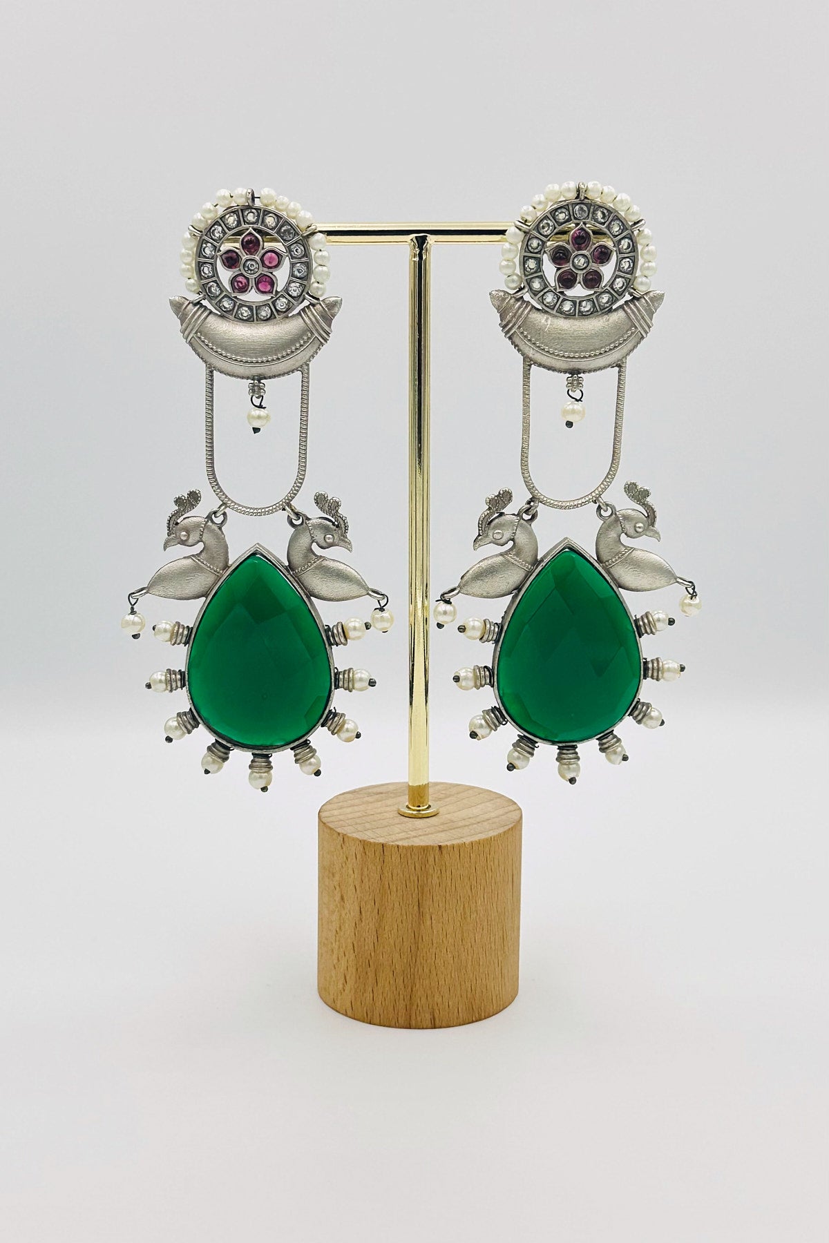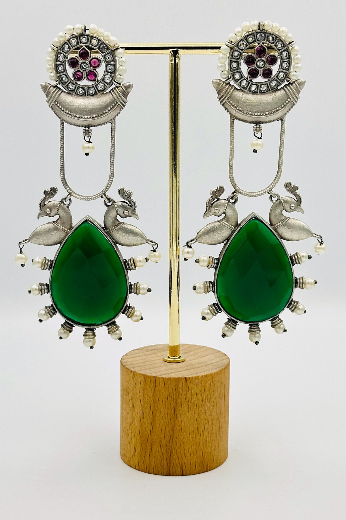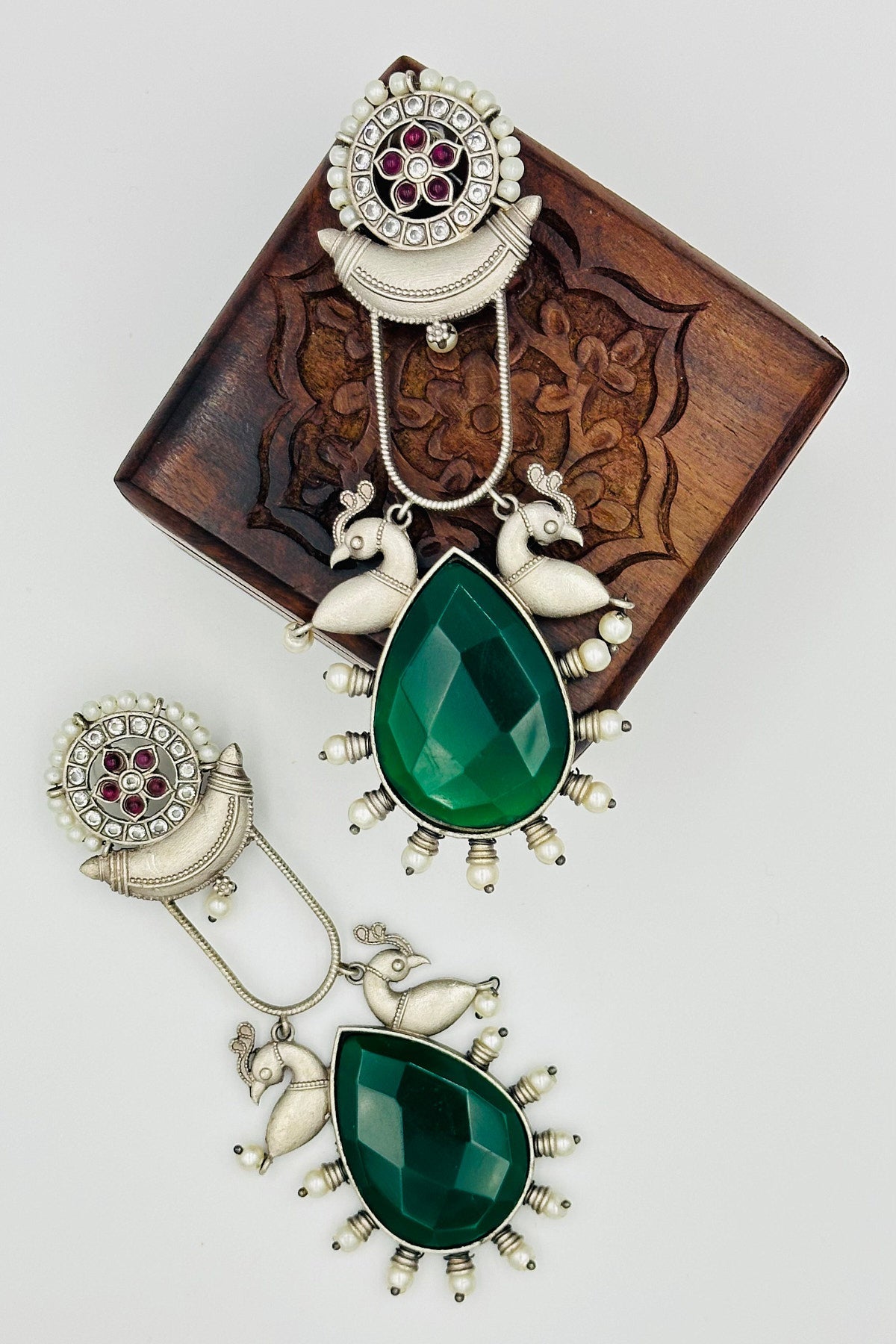 Long Green Stone Silver Earrings - swadeshsouq.com