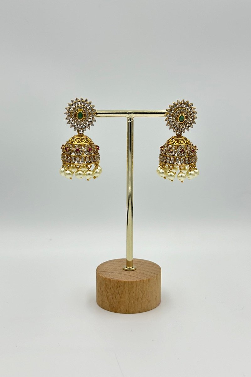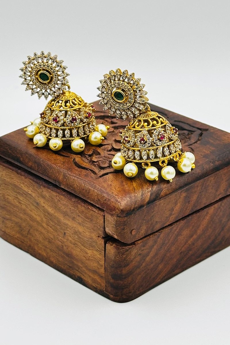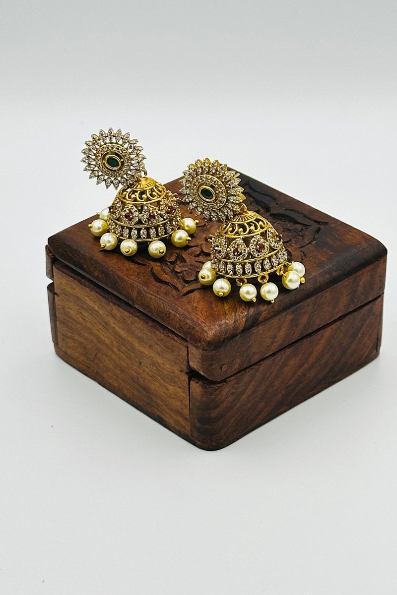 Add a touch of grandeur to your jewelry collection with these gold jhumkas adorned with sparkling CZ stones. Featuring an elegant floral stud with a vibrant green accent, these earrings transition into intricately crafted dome-shaped jhumkas embellished with shimmering crystal details and delicate ruby accents. The design is finished with lustrous pearl drops, enhancing their timeless charm.