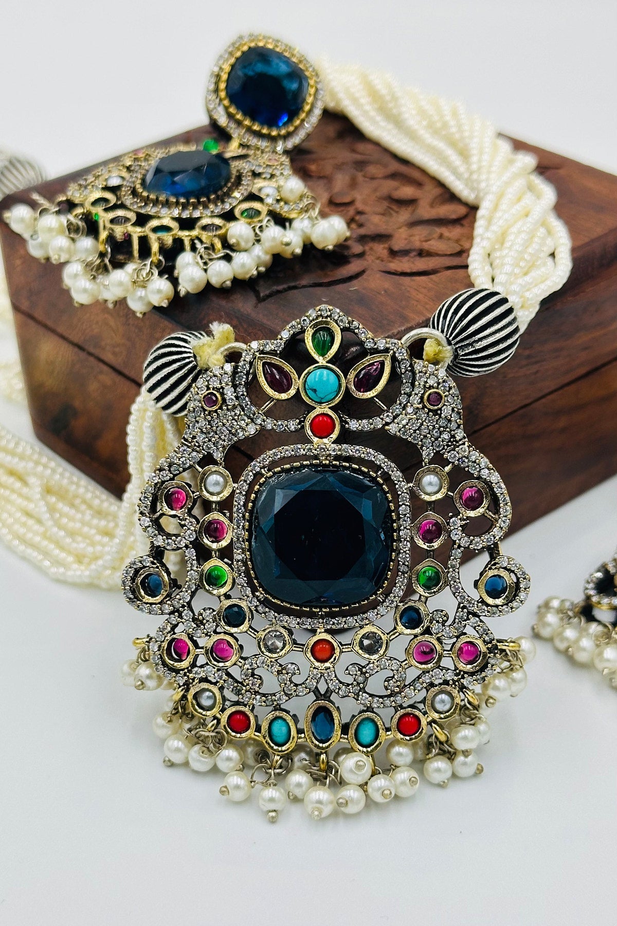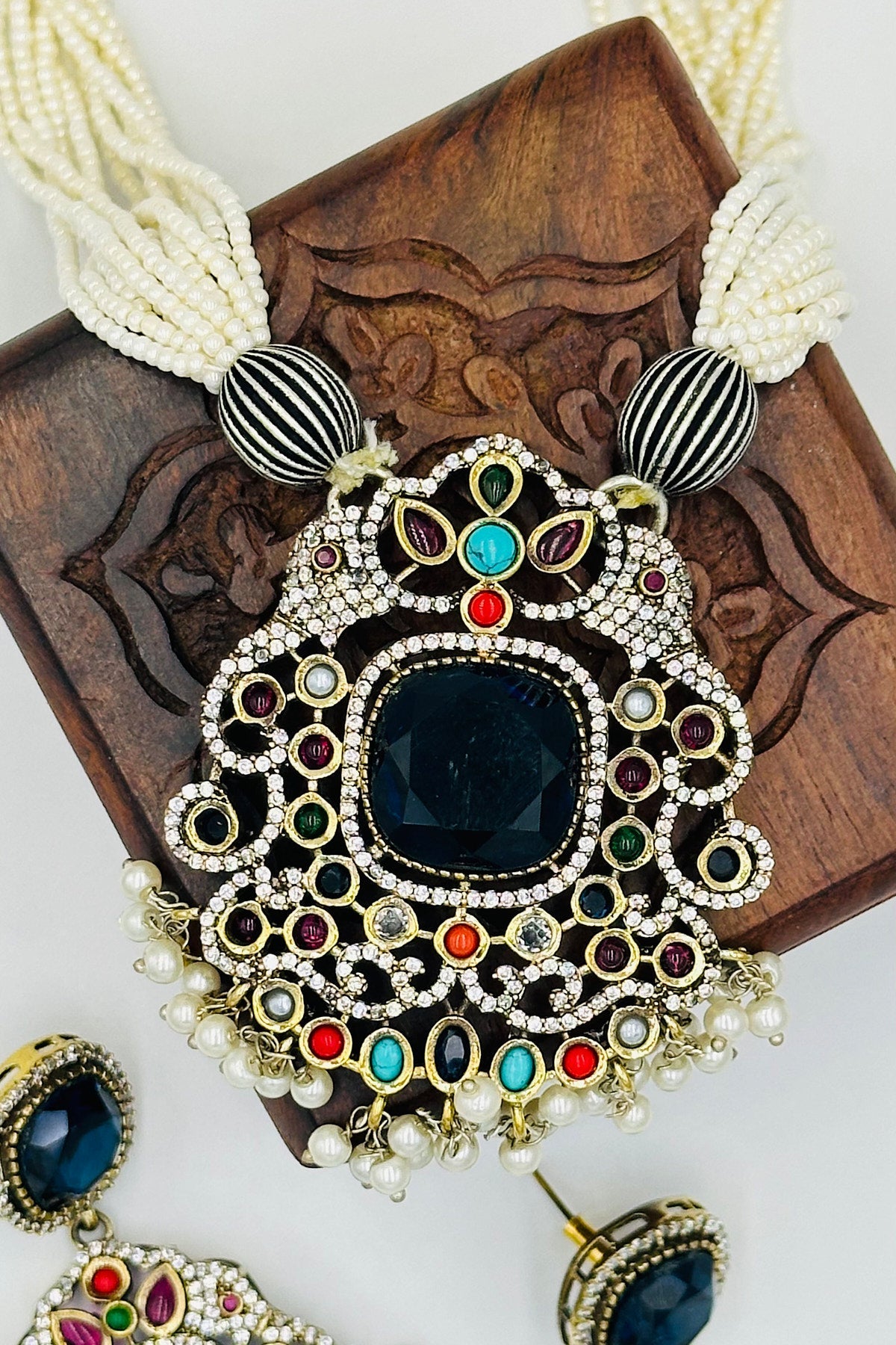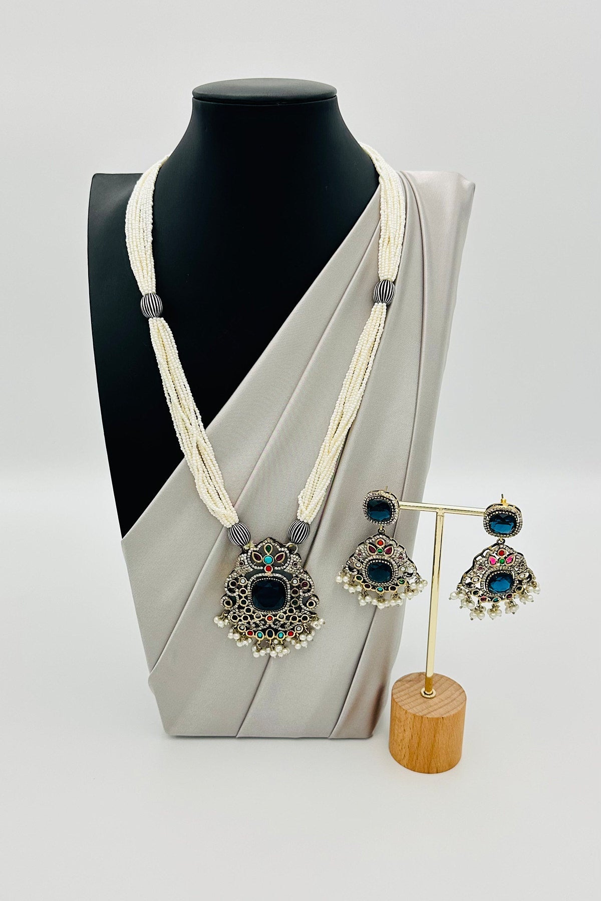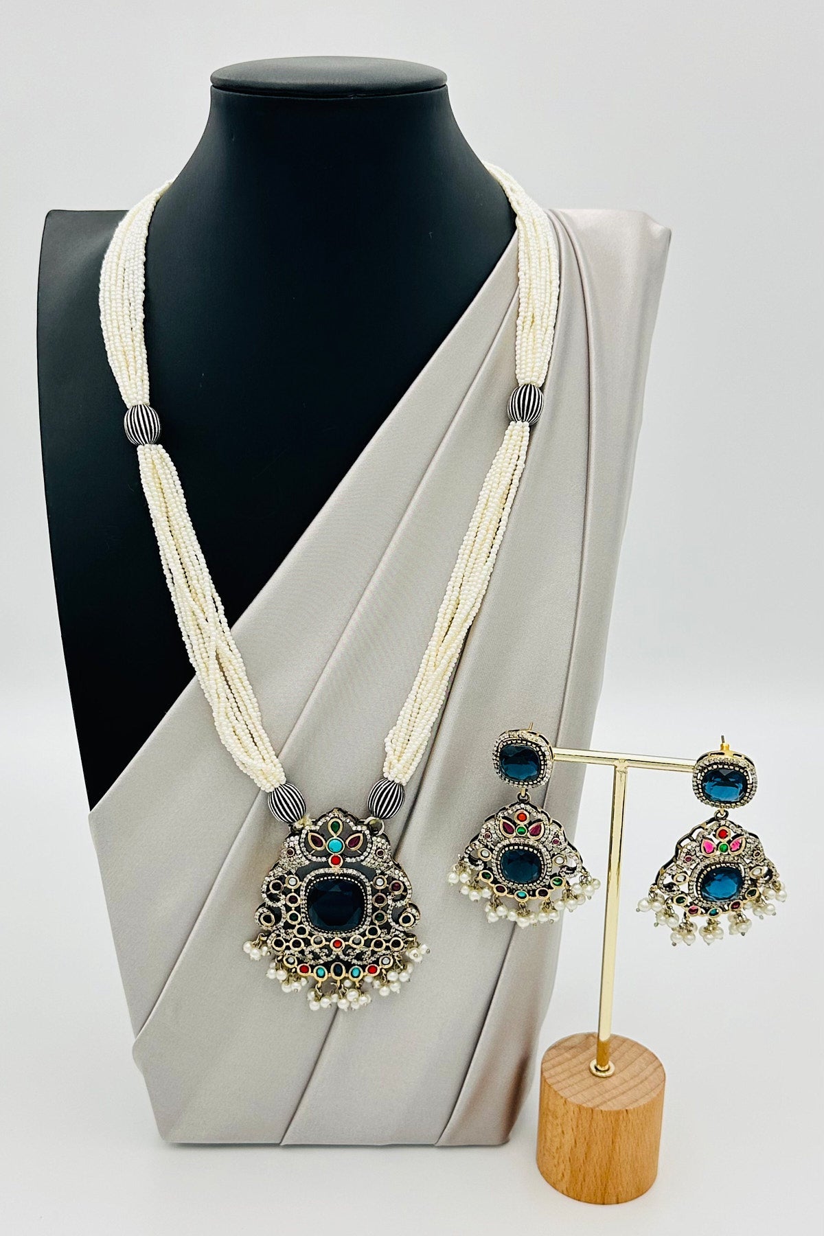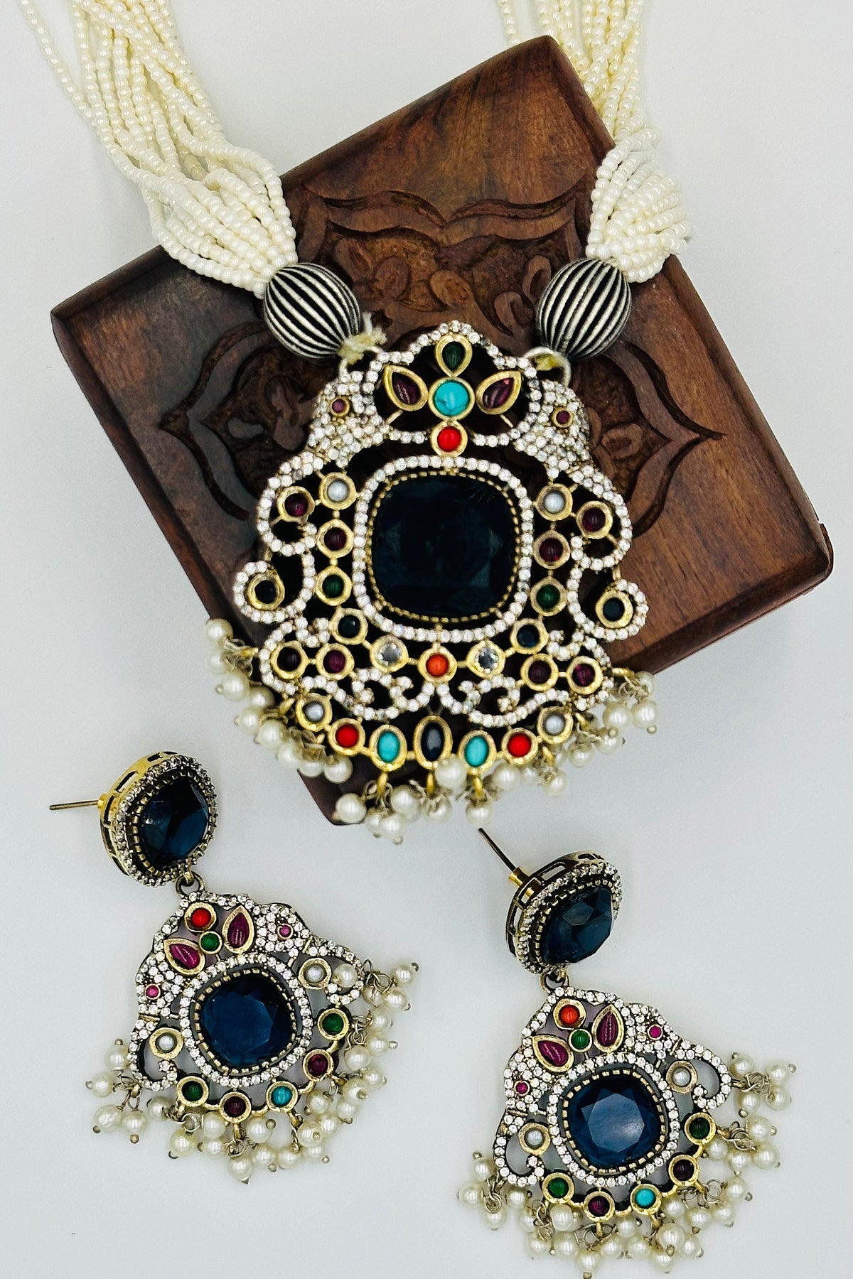 Experience the union of timeless pearls and shimmering silver in our Multicolour Pendant Set. This ensemble melds classic Pearl Mala sophistication with the radiant allure of silver, culminating in a centerpiece that dazzles in a spectrum of hues. A celebration of elegance and color in every detail.