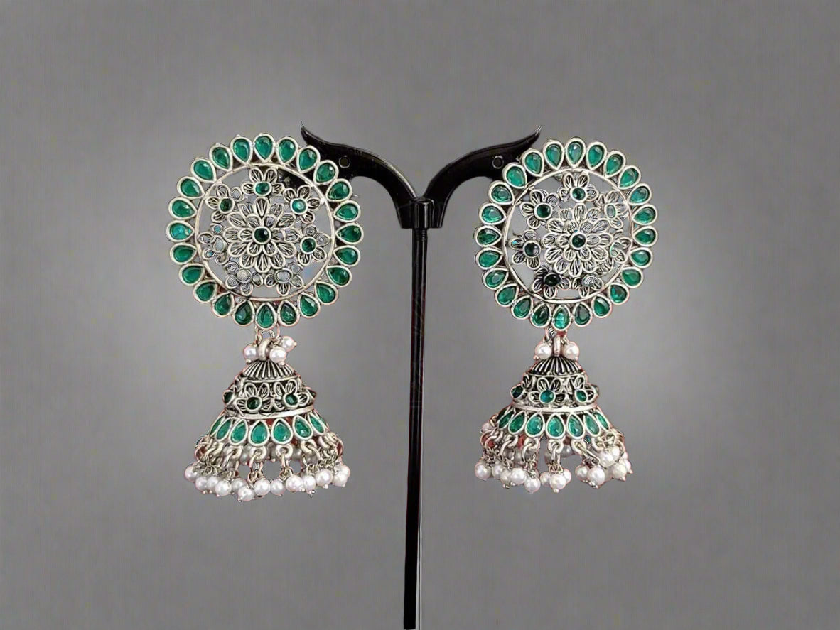 Oxidised Silver Jhumka Earrings with Beautiful Emerald Green Detailing.