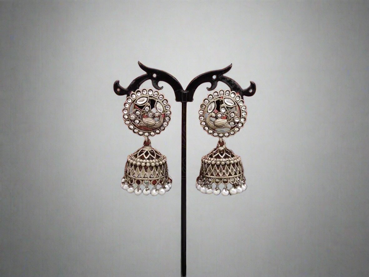 Peacock-Inspired Oxidised Silver Jhumka Earrings with Kundans and Pearls. - swadeshsouq.com