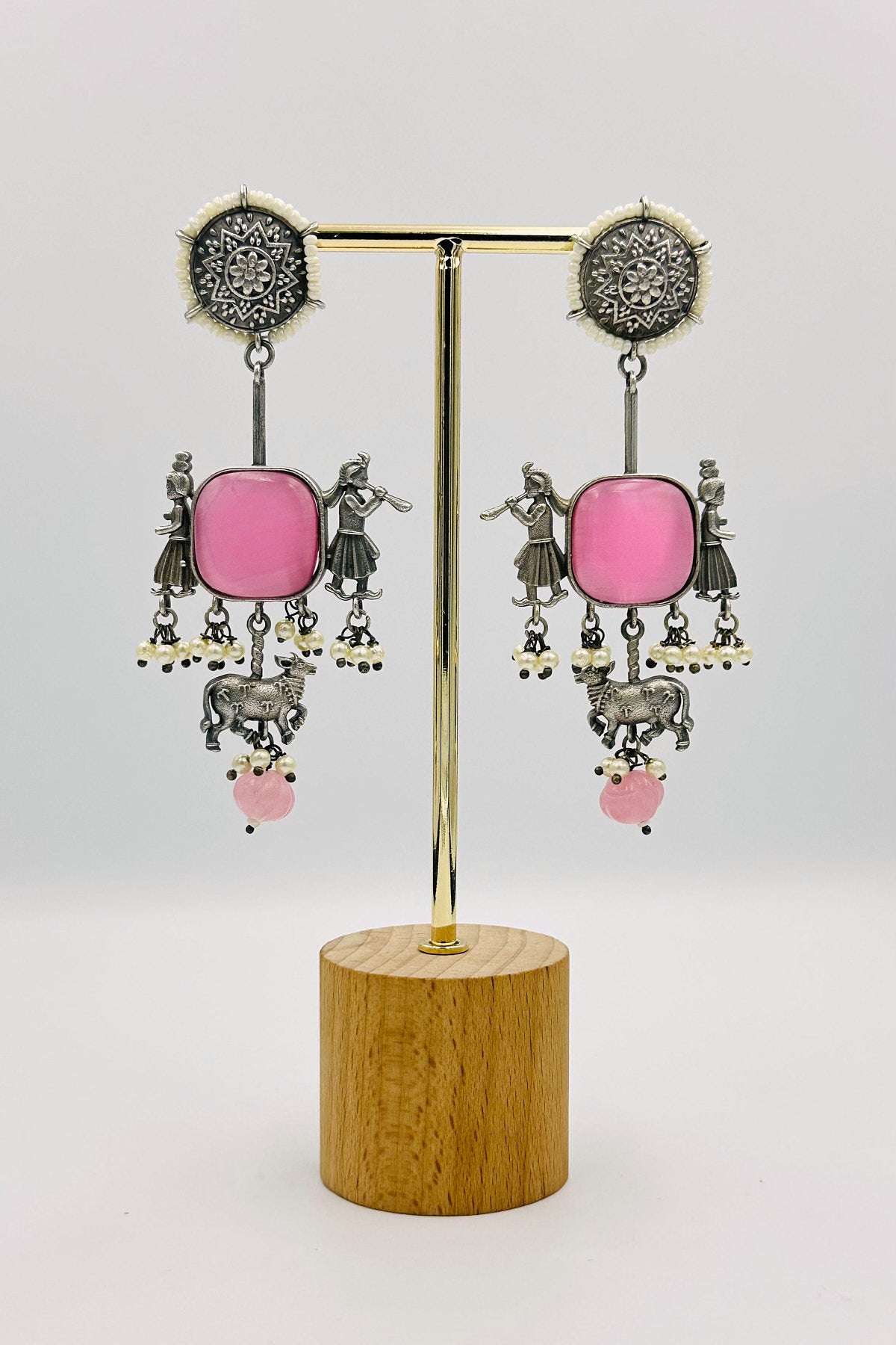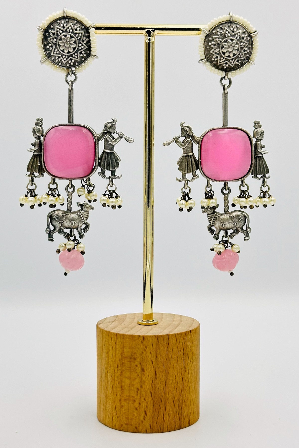 Pink Silver Danglers with Cow and Musicians - swadeshsouq.com