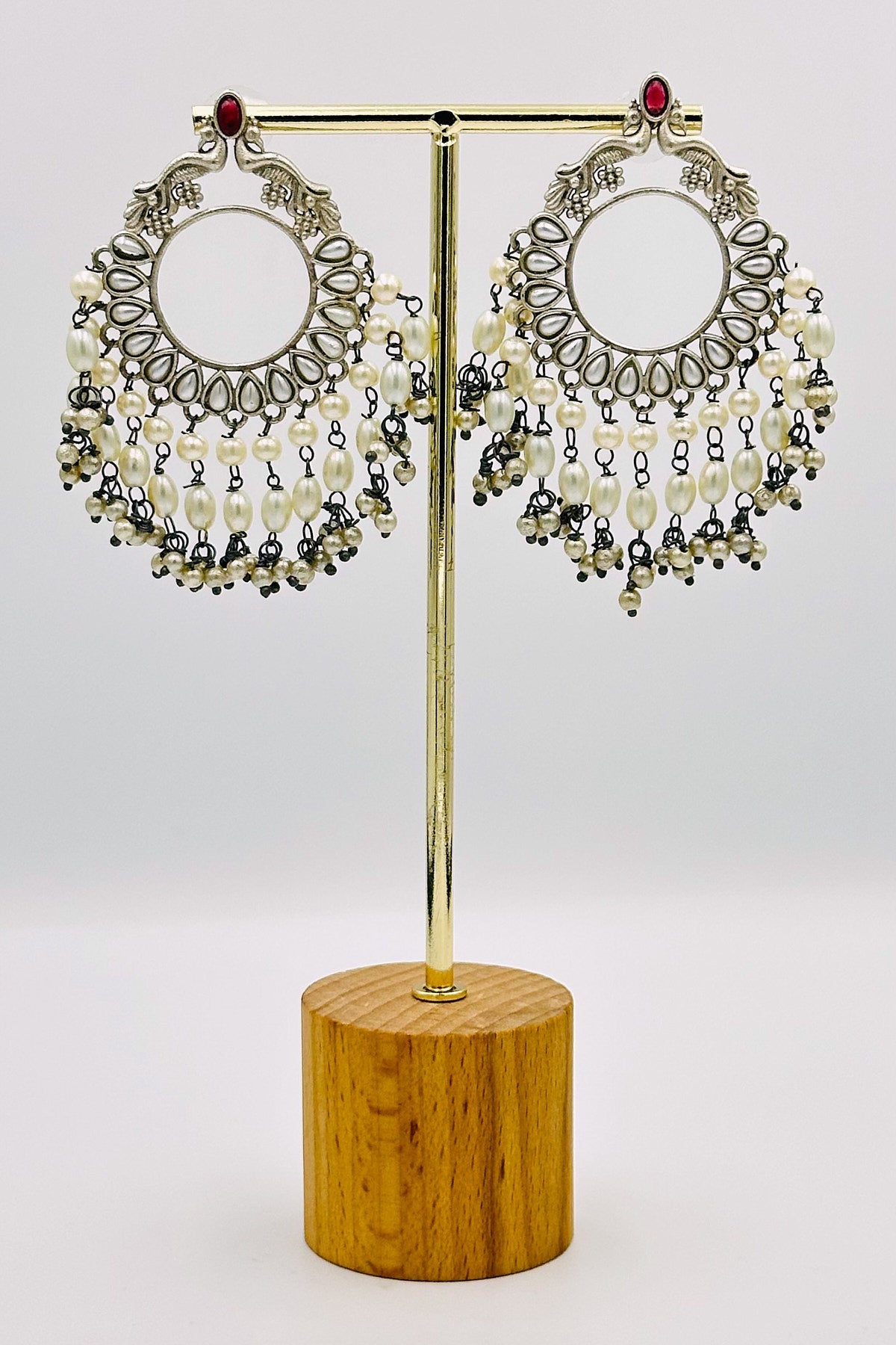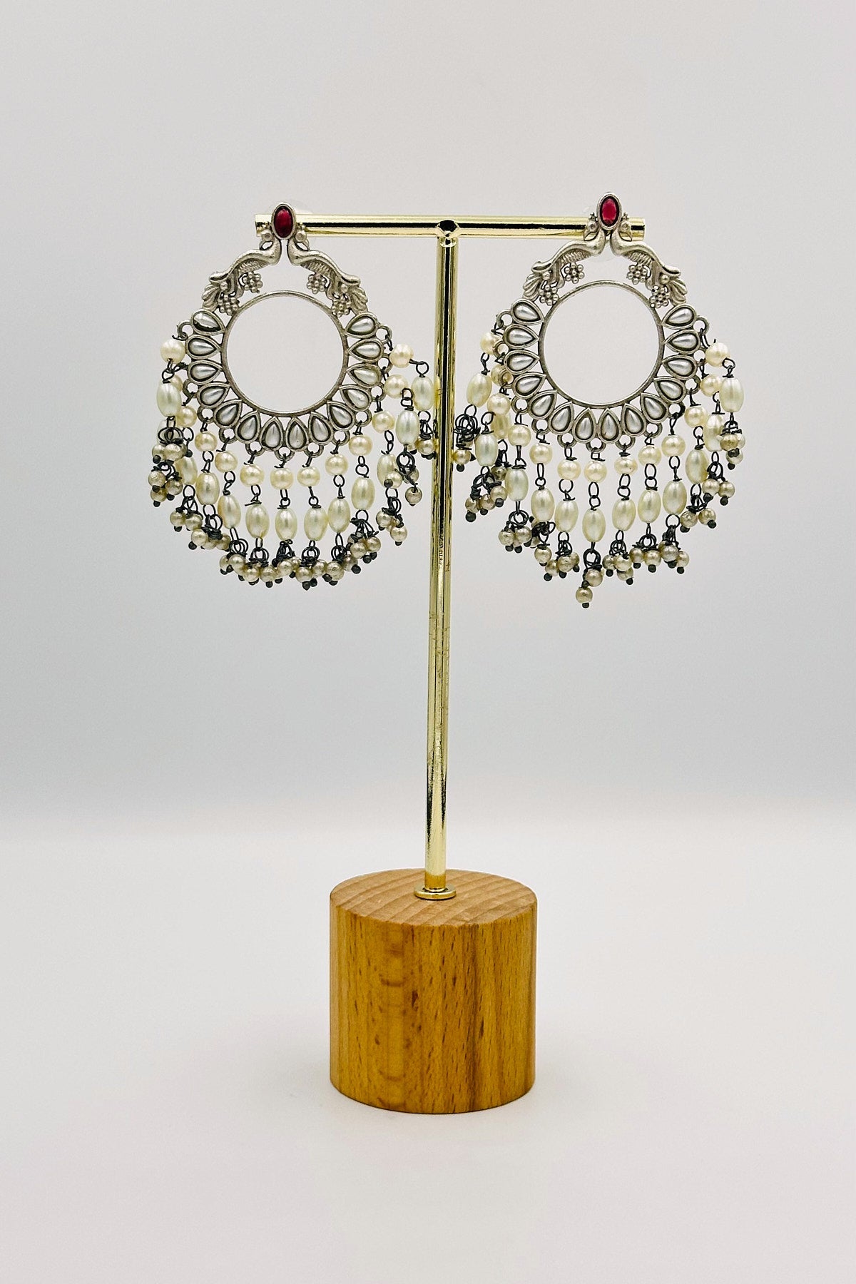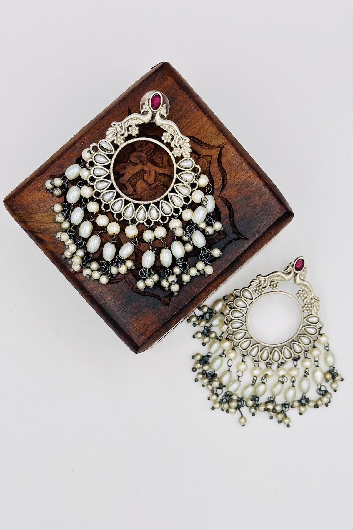 Red Chandbali Earrings with Peacock Design and Pearl Embellishments - swadeshsouq.com