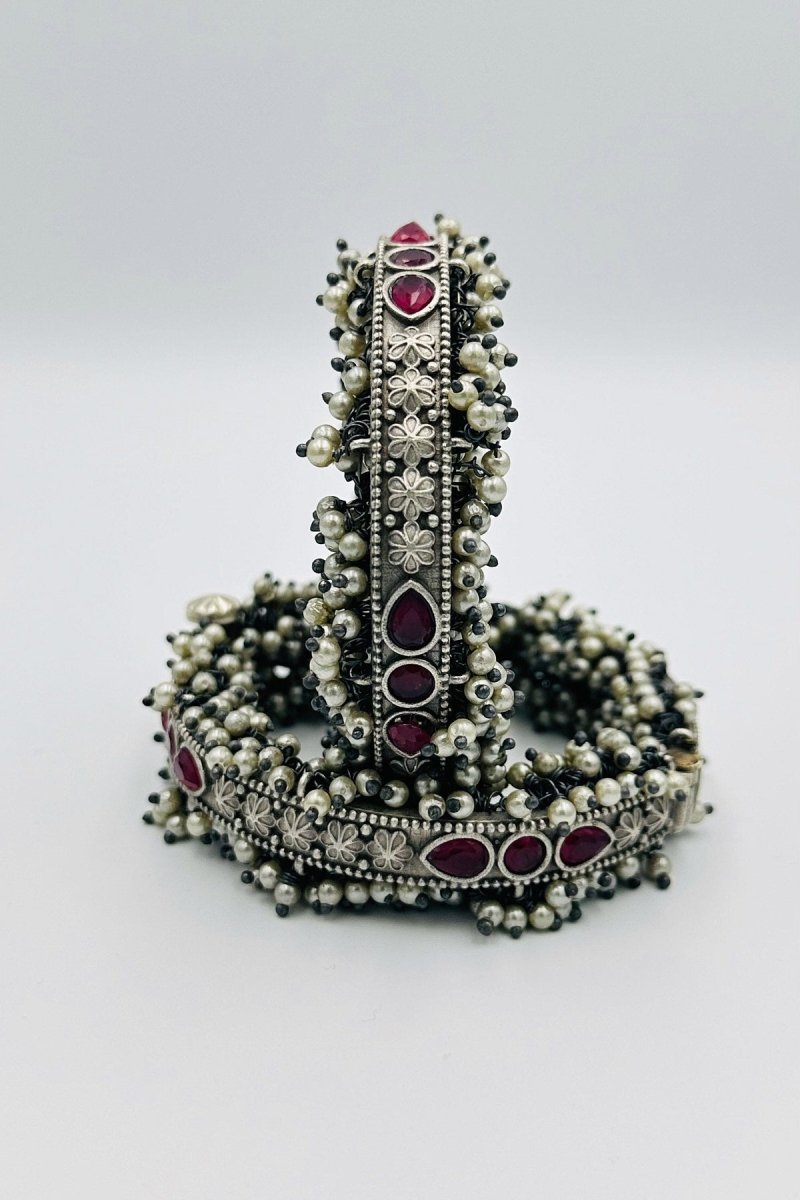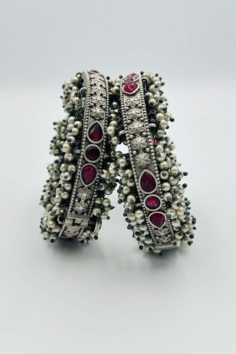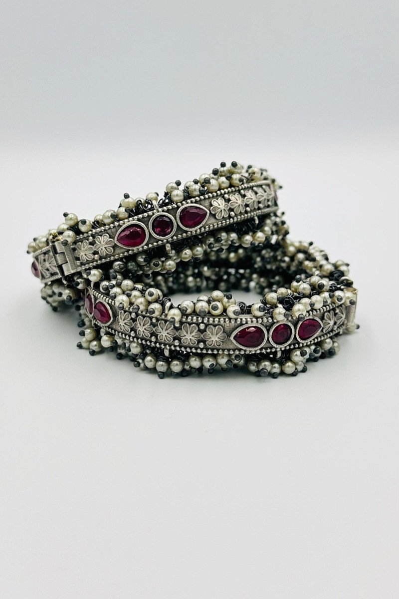 Red Petal Elegance: Pearl-Adorned Silver Bangles - swadeshsouq.com