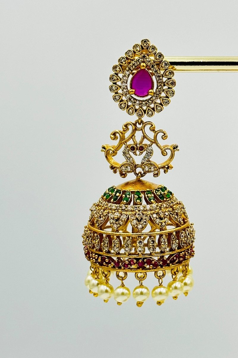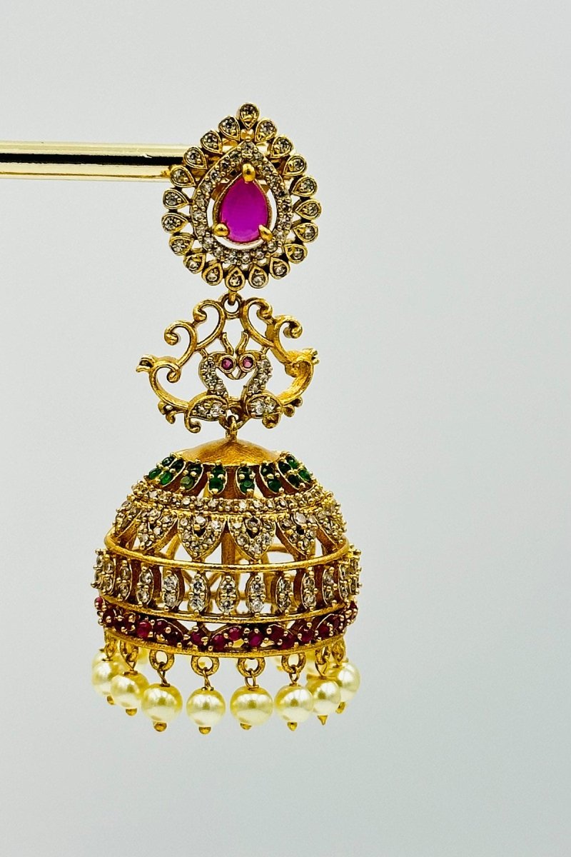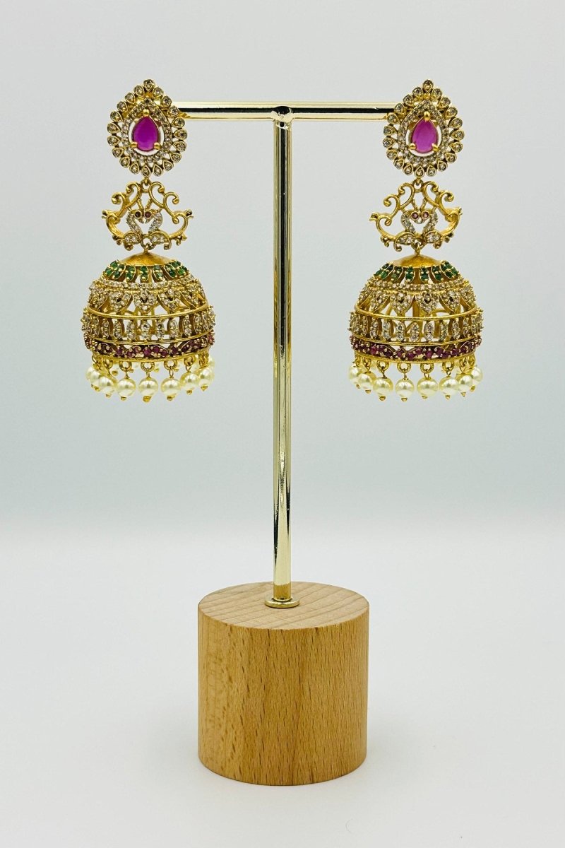 Elevate your style with these royal gold-plated jhumkas, featuring a dazzling combination of pink stones, sparkling CZ accents, and intricate craftsmanship. The statement-making design is topped with an elegant teardrop-shaped pink stone surrounded by shimmering crystals, leading to a regal dome adorned with delicate green and pink detailing. Finished with dangling pearl drops, these jhumkas exude unmatched sophistication and timeless charm.