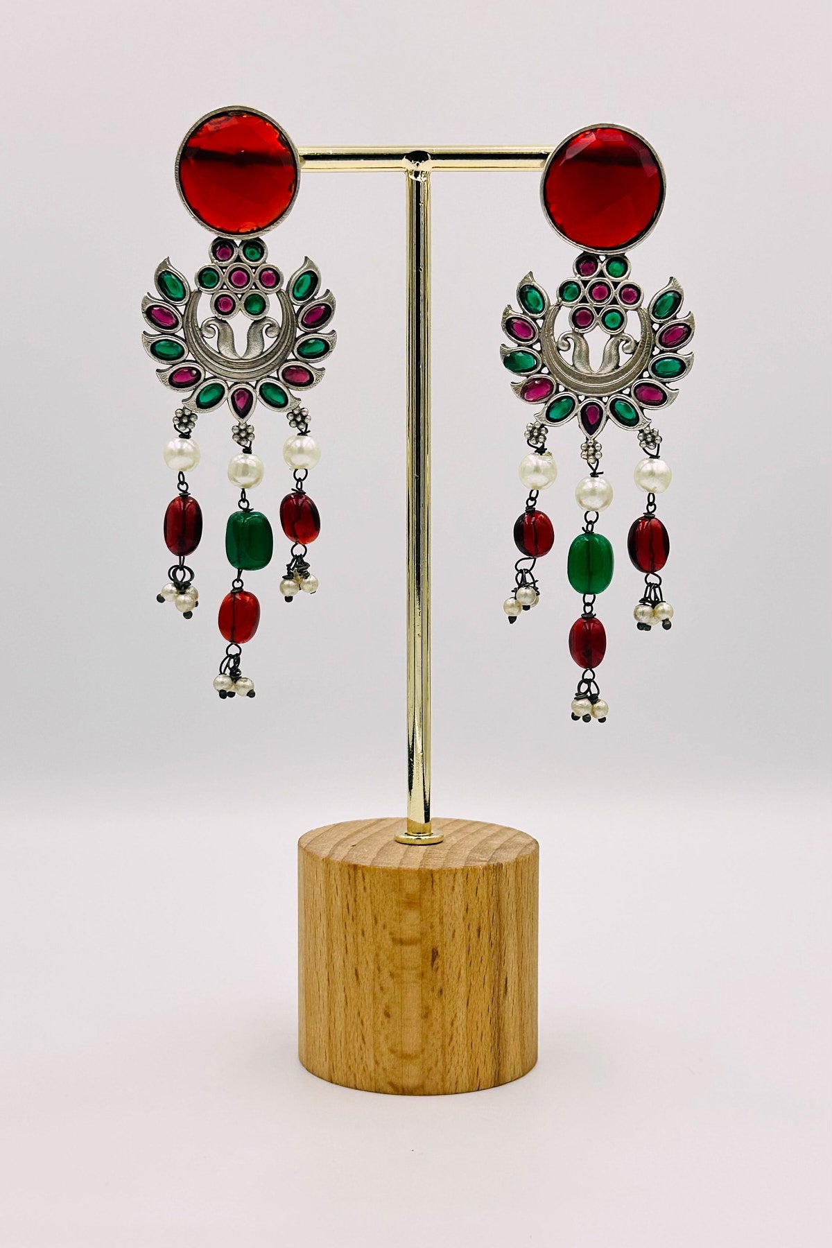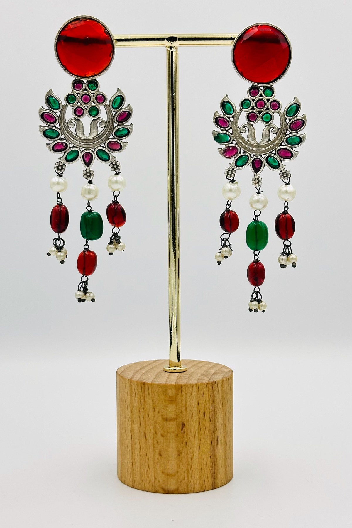 Step into a realm of majestic charm with our Ruby & Emerald Radiance Dangler Earrings. Crafted with finesse in silver, these earrings showcase a stunning interplay of rich red and lush green stones, set in an elegant floral design. The vibrant red gems mirror the depth of rubies, while the green stones echo the serene essence of emeralds, creating a captivating visual harmony. Accented with delicate beads and pearls, these earrings are a perfect blend of traditional grandeur and contemporary flair, ideal for adding a touch of royal elegance to any ensemble.