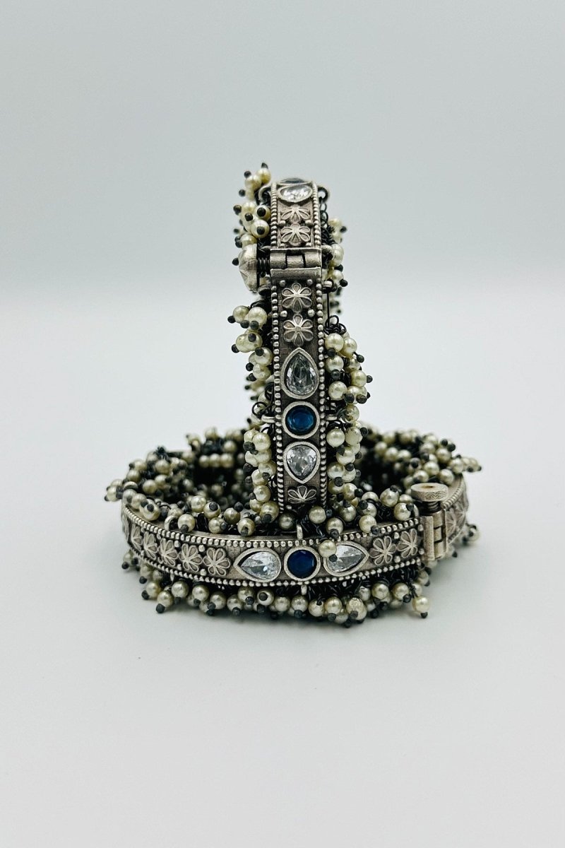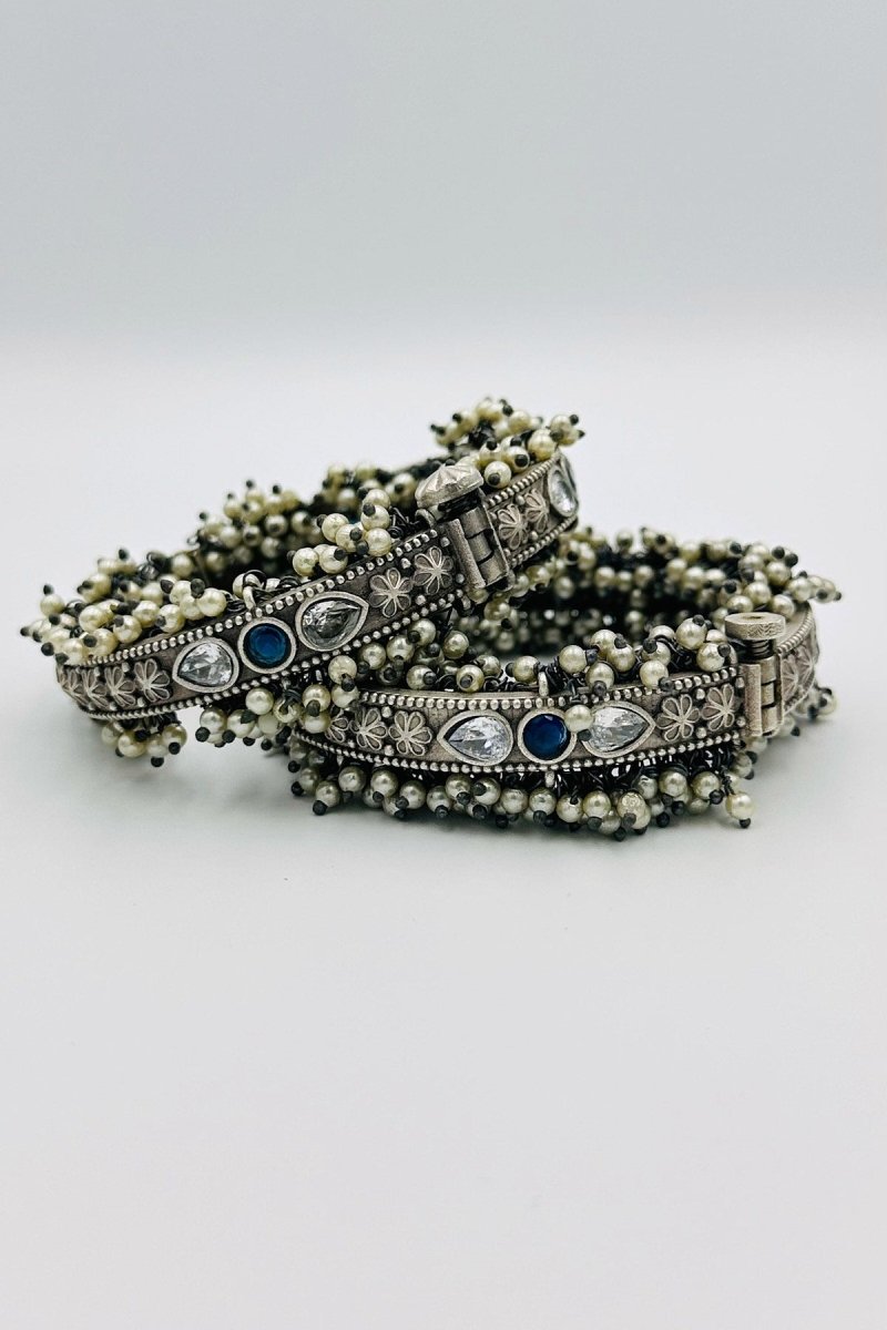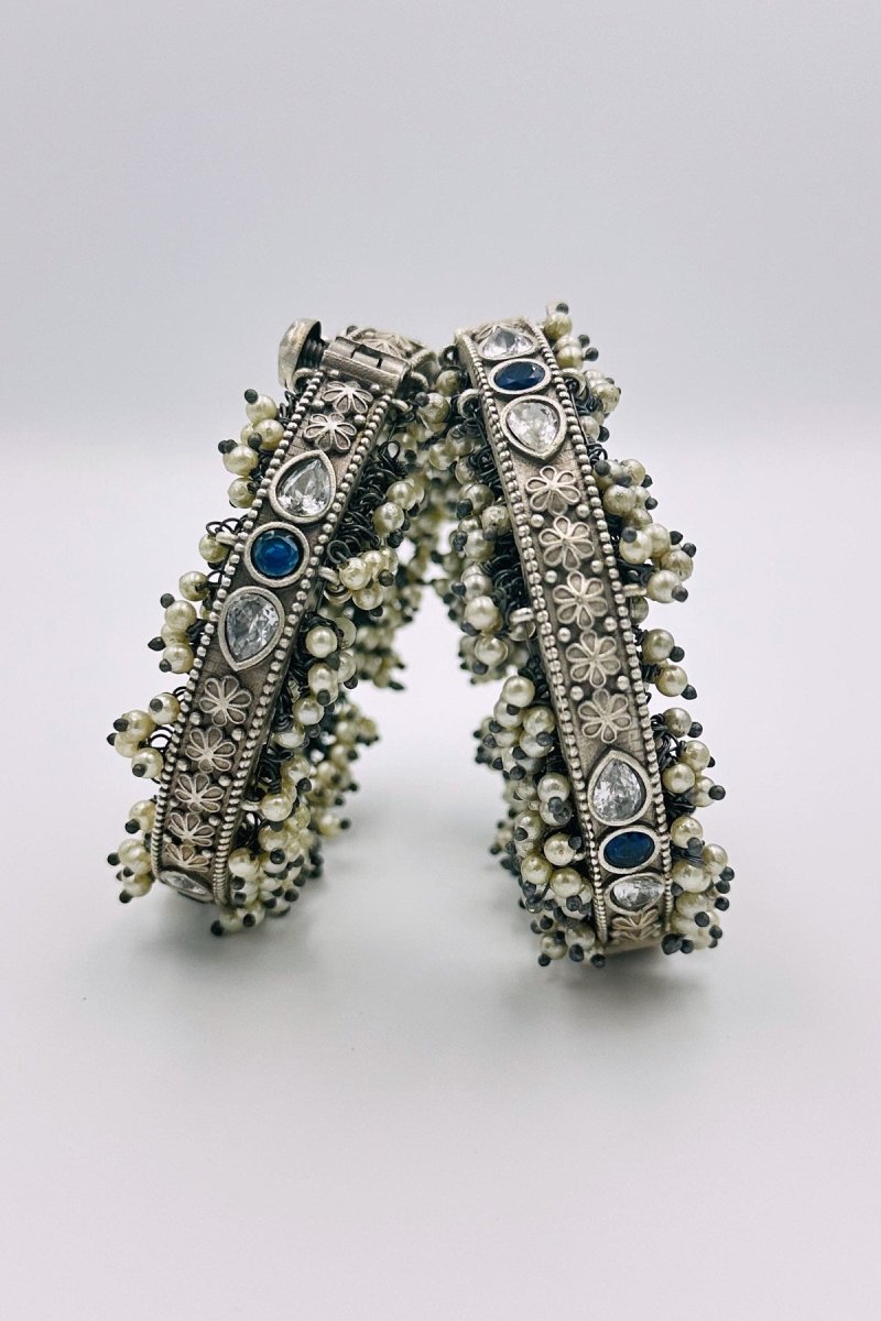 Sapphire Serenity: Blue and White Stone Silver Bangles with Pearls - swadeshsouq.com
