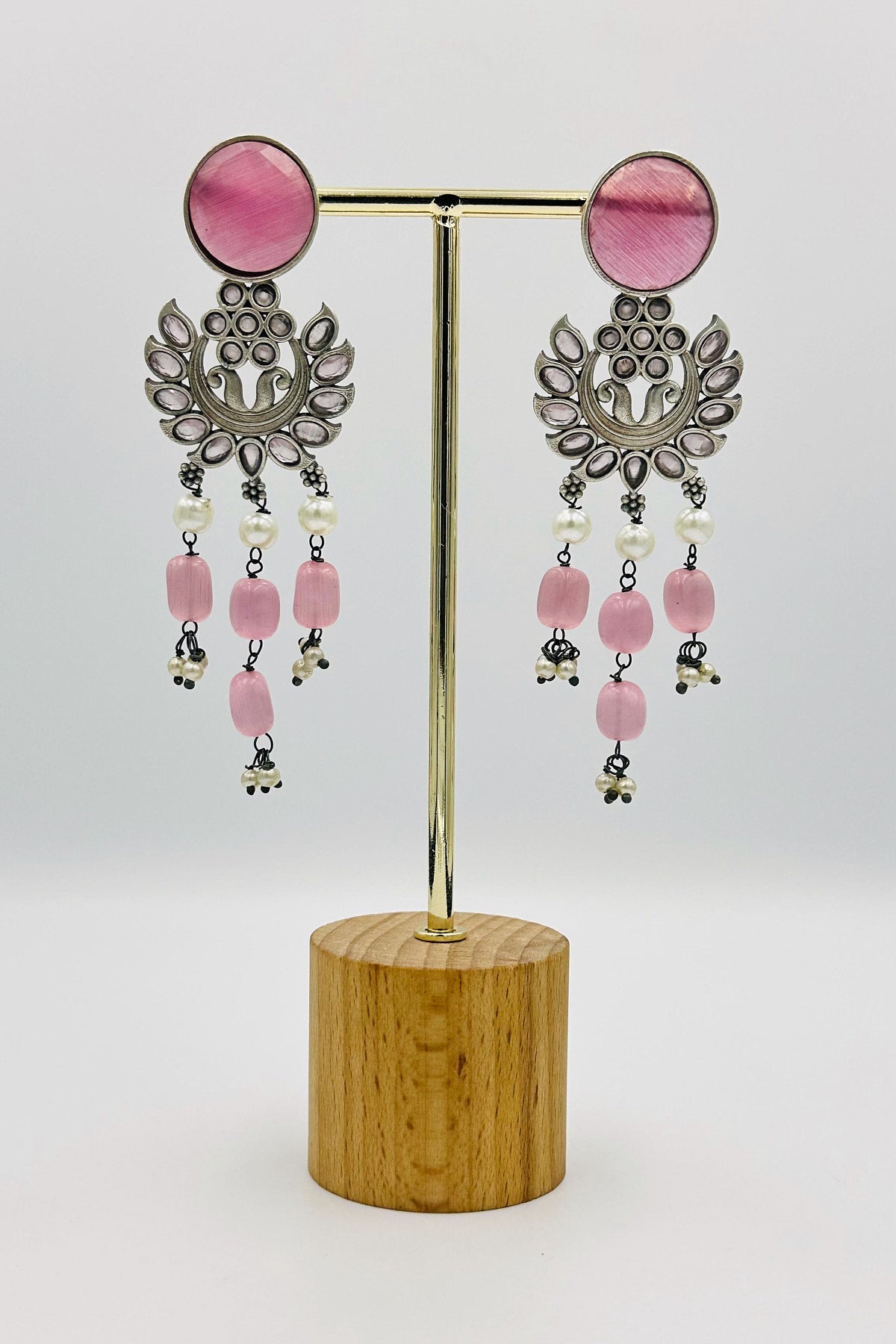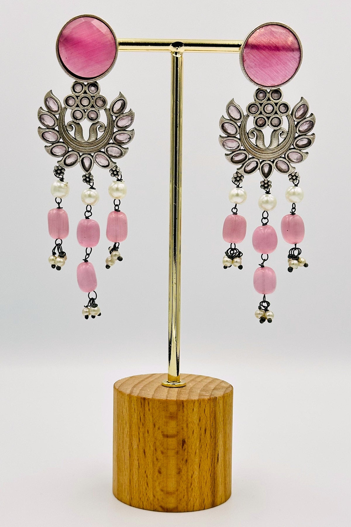 Silver Dangler Earrings with Baby Pink Stones - swadeshsouq.com