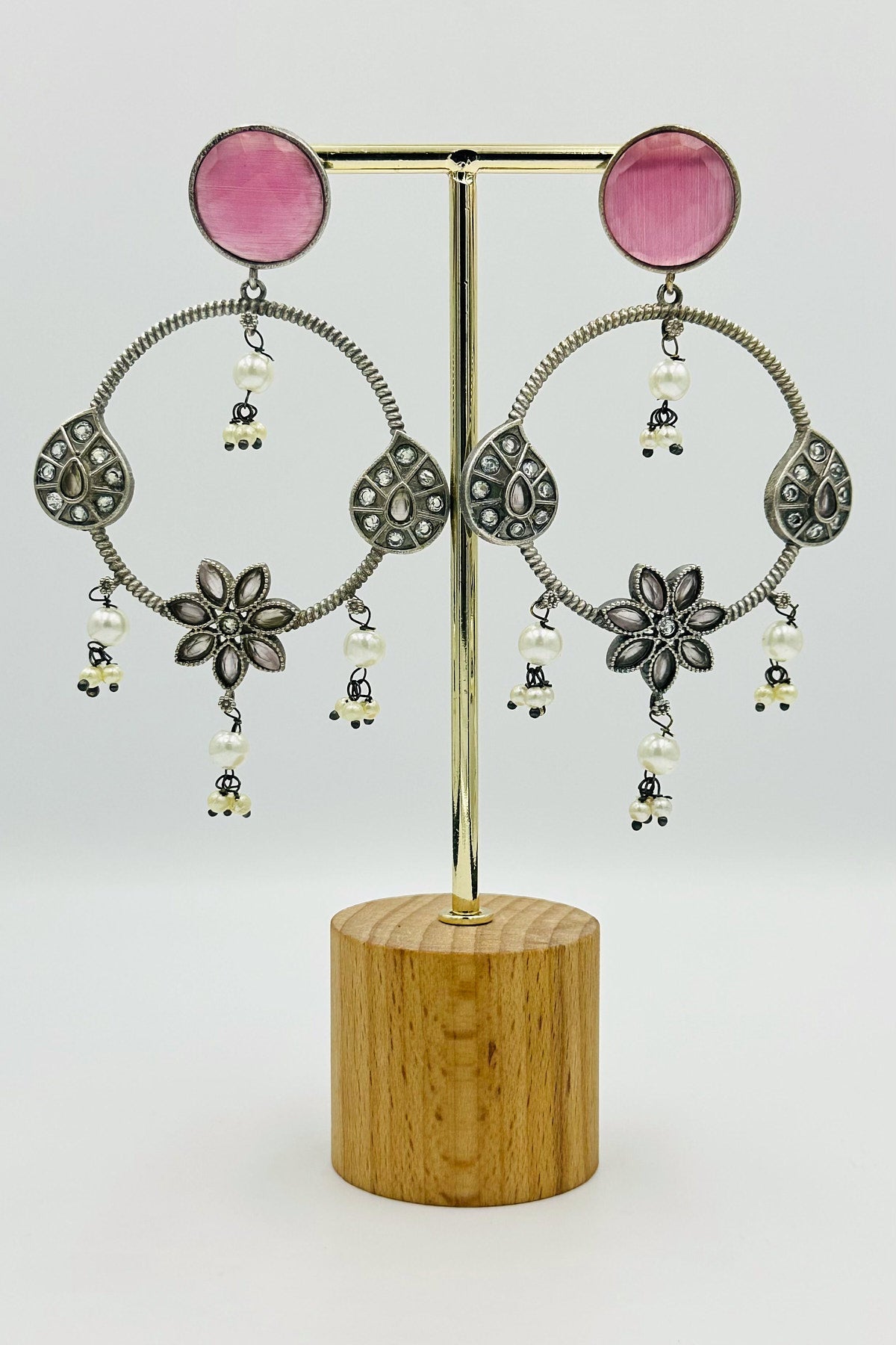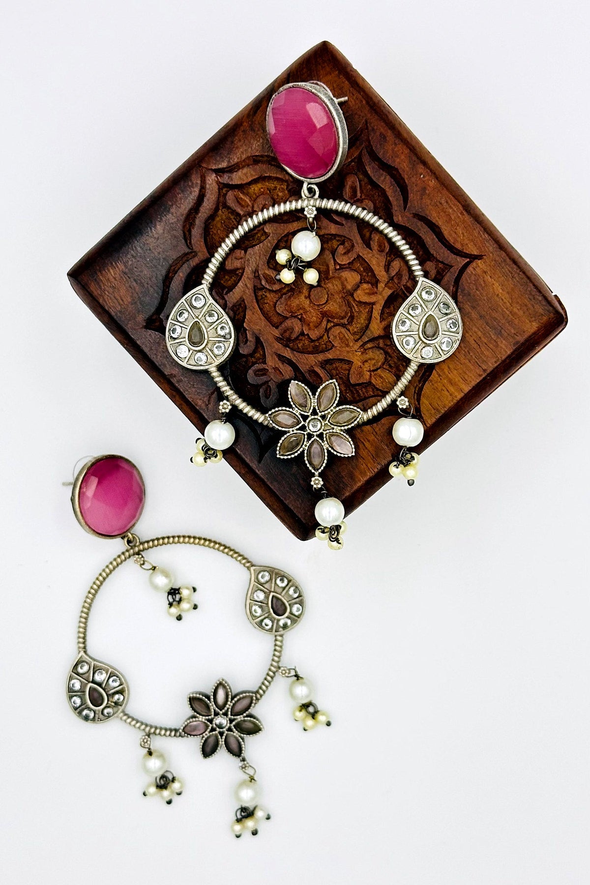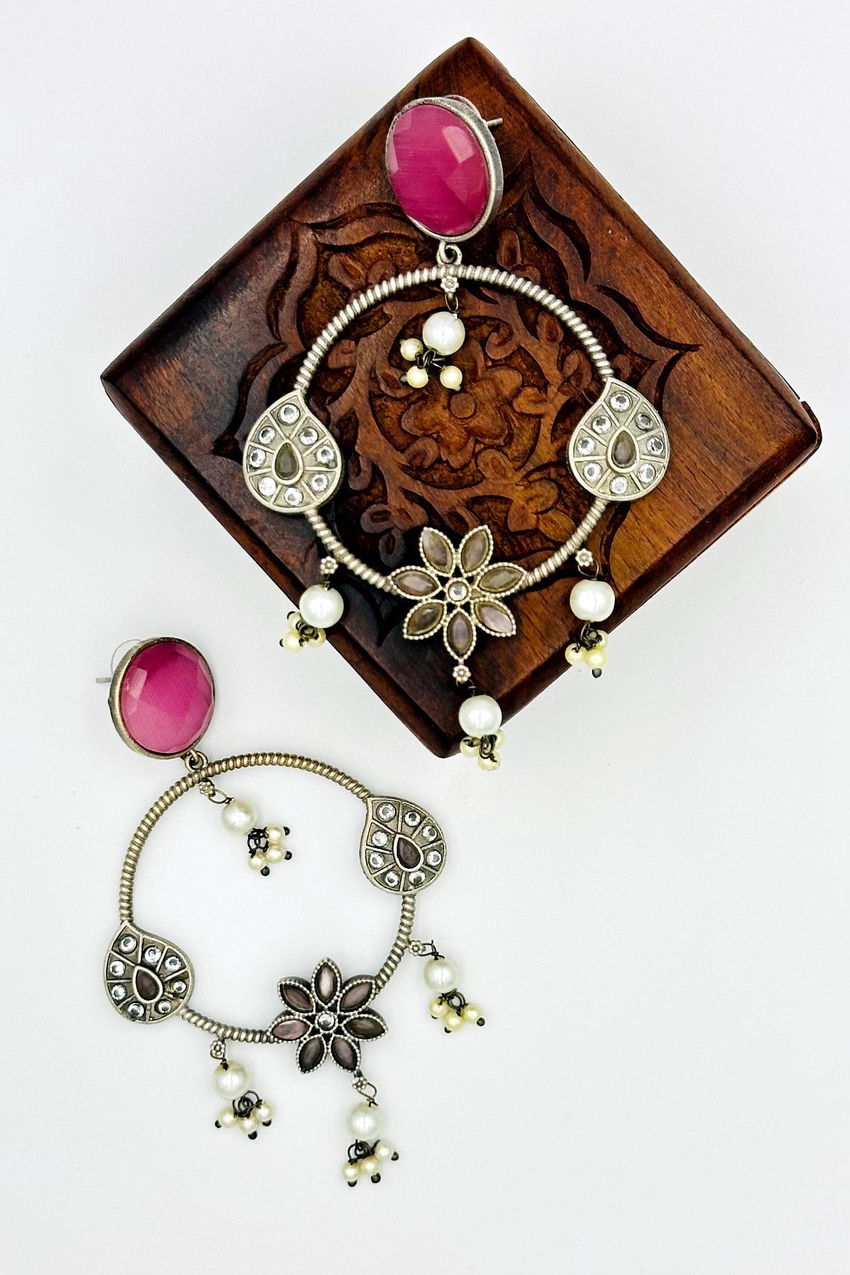 Silver Danglers in Delicate Pink Floral Design - swadeshsouq.com
