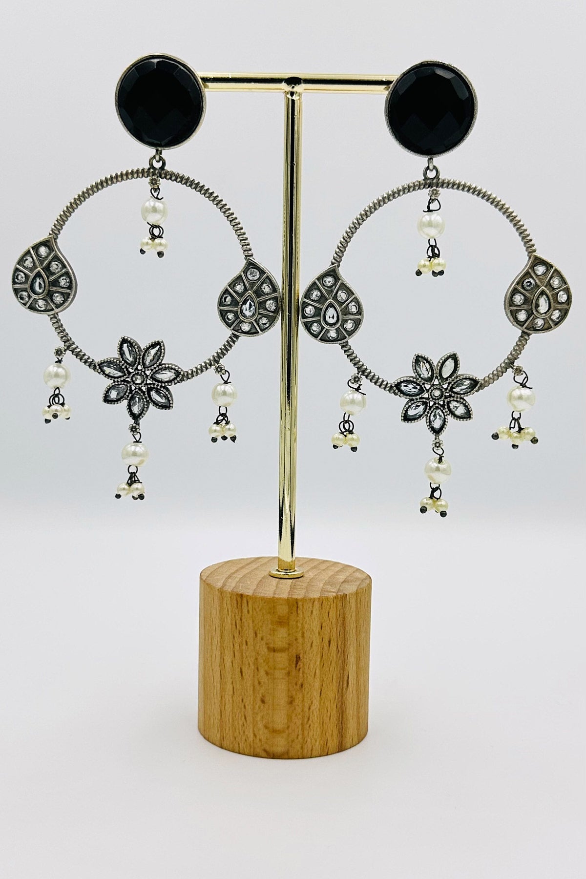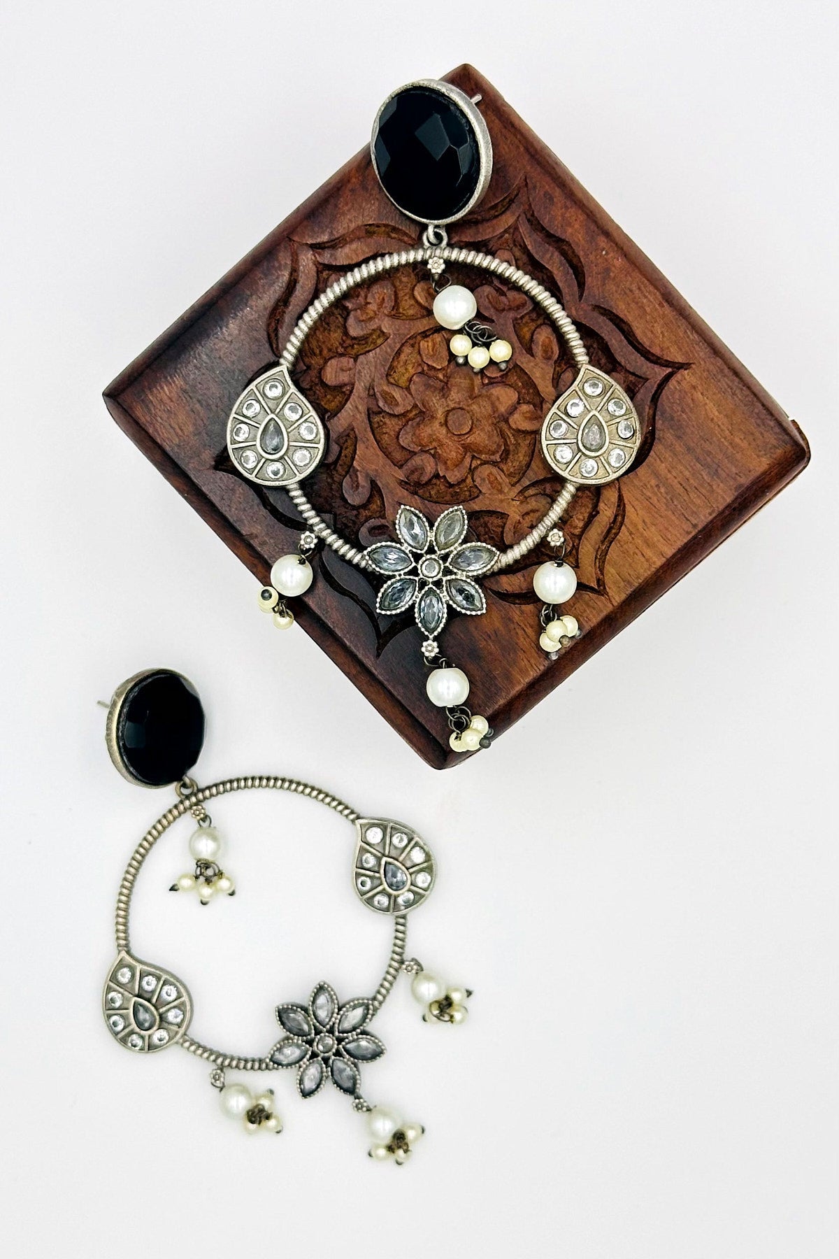 Silver Danglers in Elegant Black Floral Design