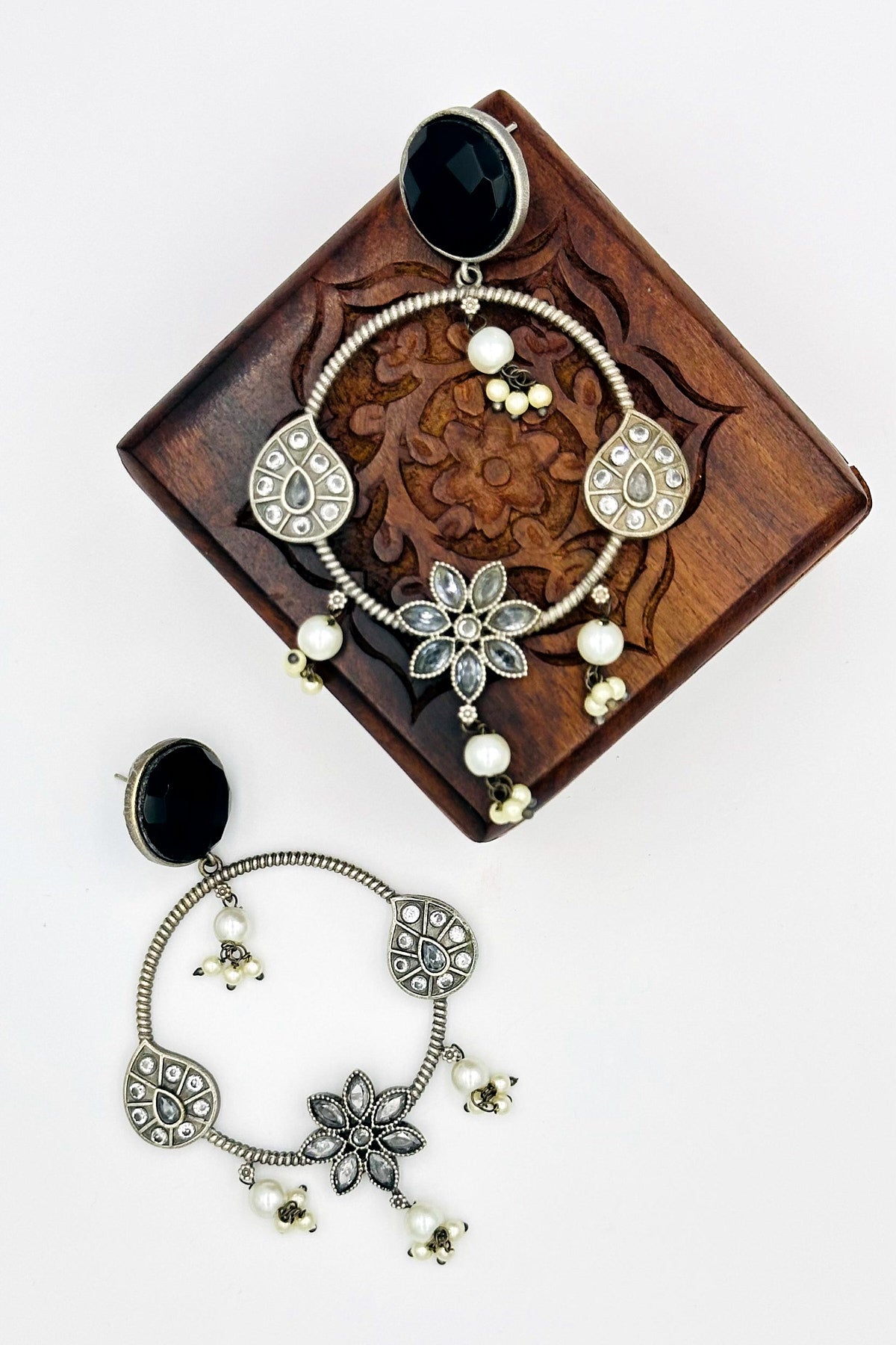 Silver Danglers in Elegant Black Floral Design - swadeshsouq.com