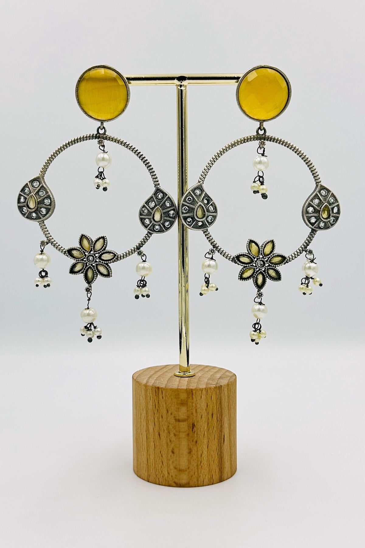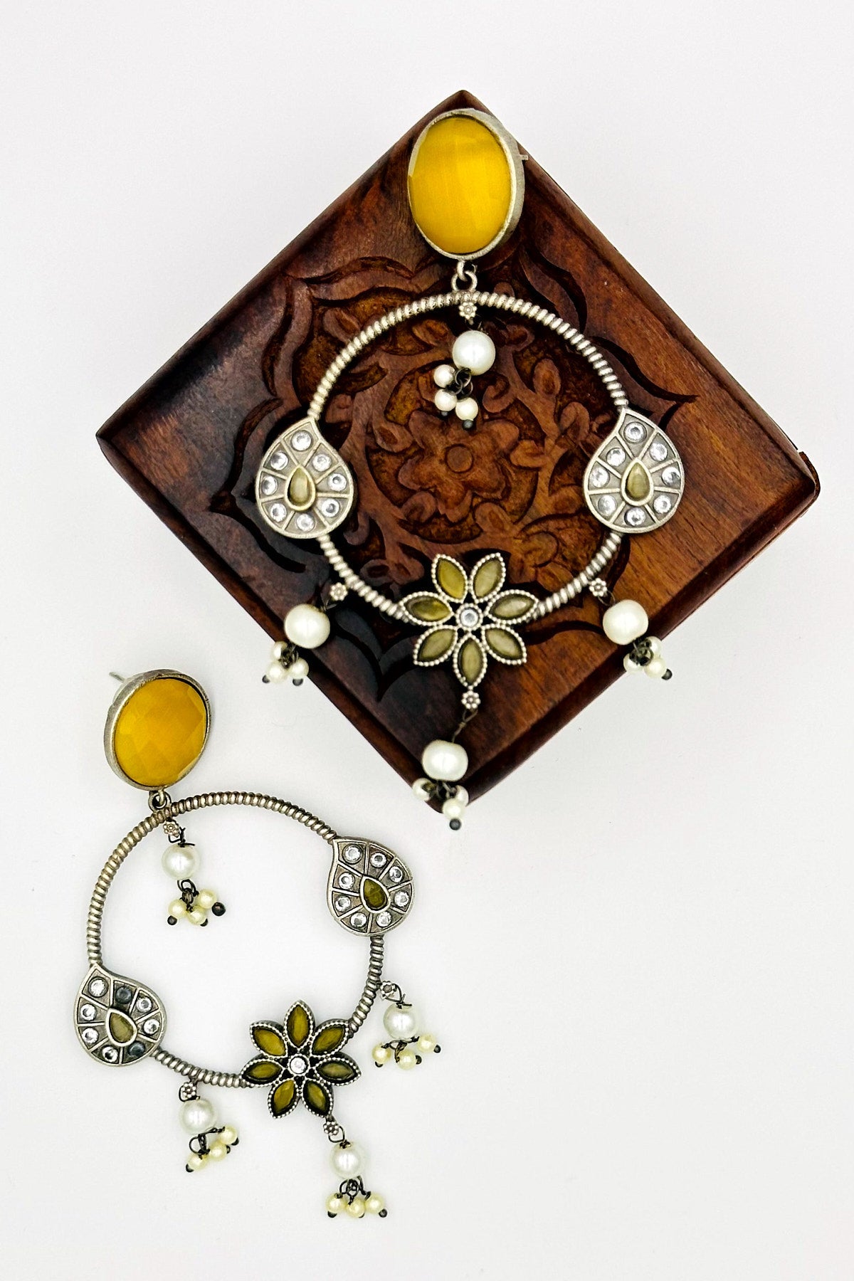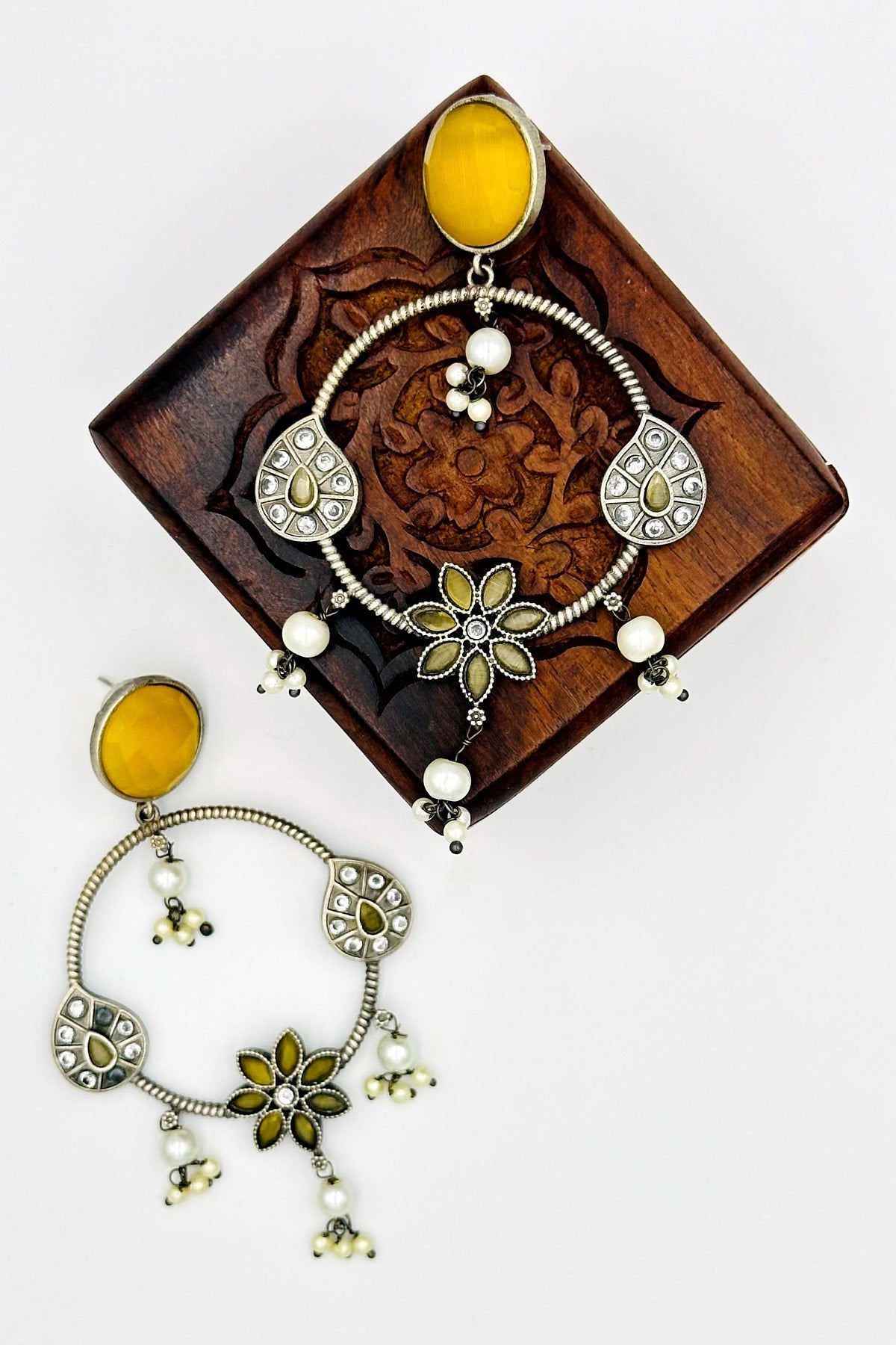 Illuminate your style with 'Sunflower Radiance,' our silver danglers showcasing a vibrant yellow floral design. These earrings are a masterpiece of artistry, capturing the warmth and radiance of sunflowers in every detail. Embrace the joyous charm of nature and elevate your look with the exquisite beauty of these silver danglers, perfect for adding a touch of sunshine to any occasion.