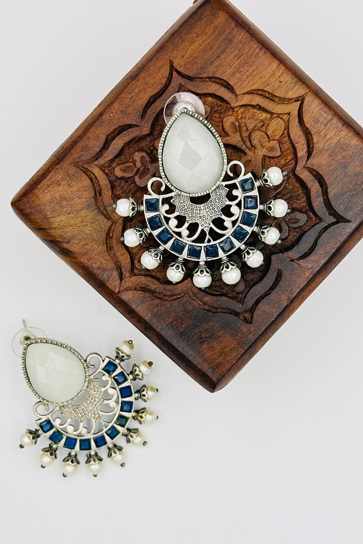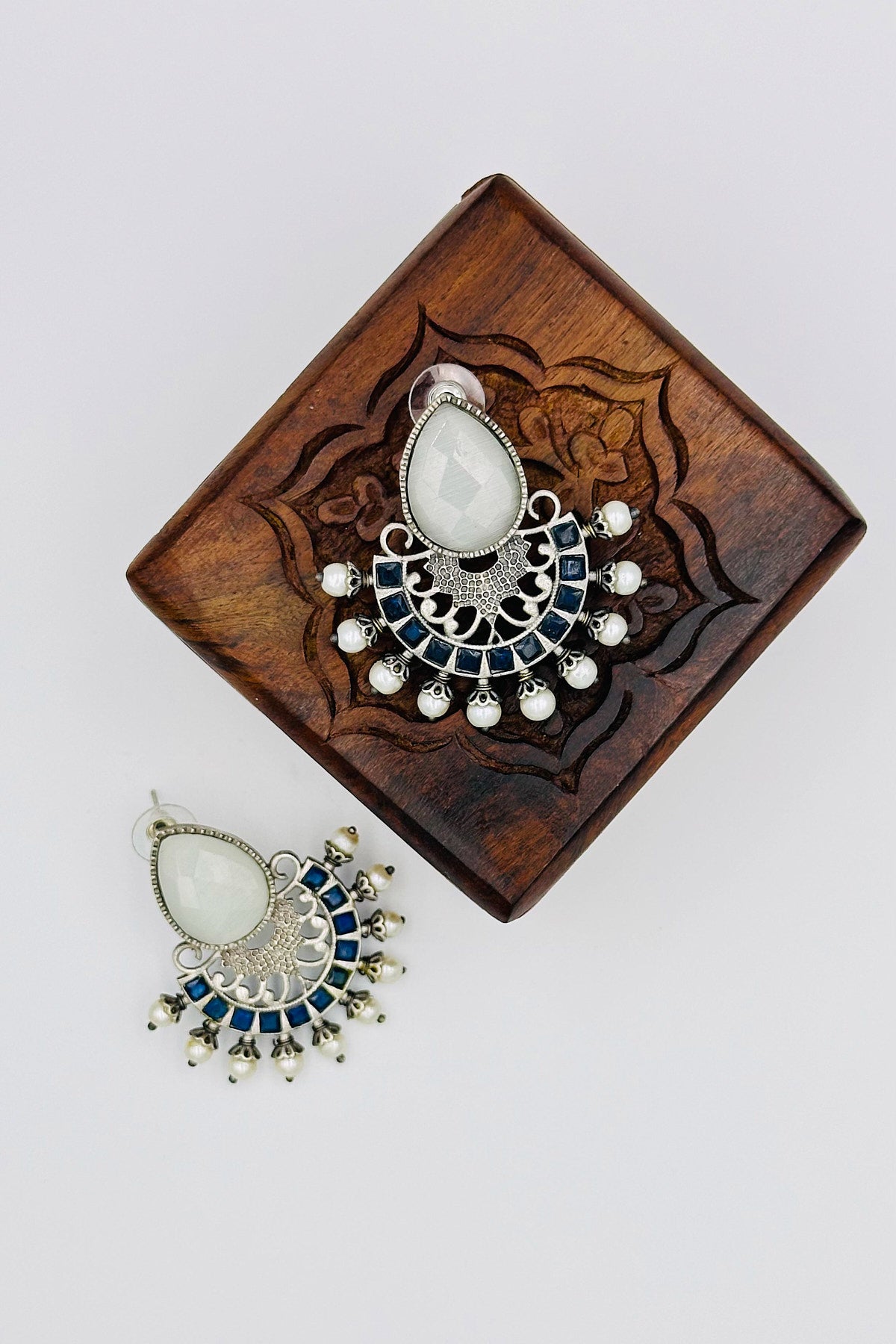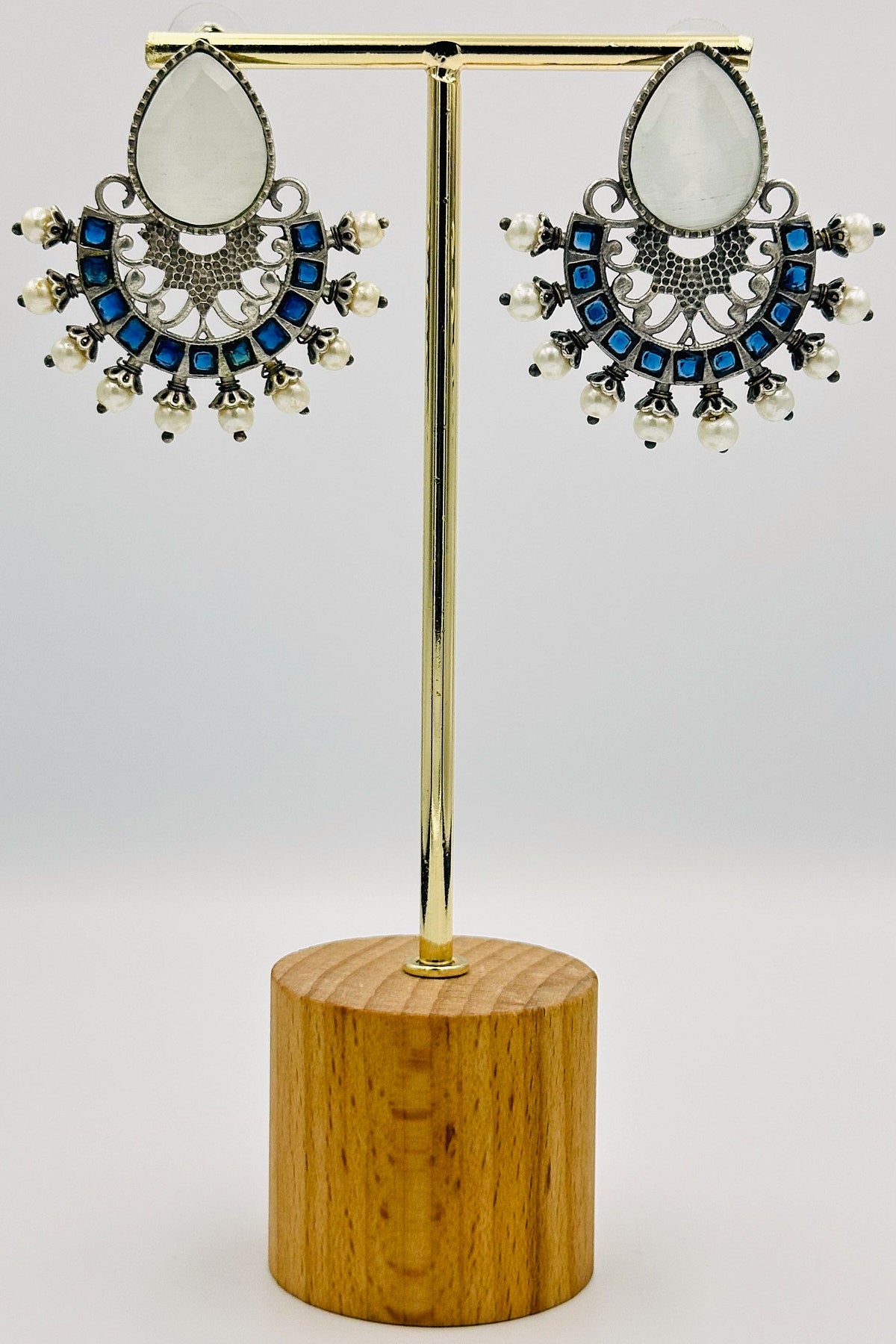 Immerse yourself in the serene beauty of "Azure Bliss" with our Silver Earrings. These meticulously designed treasures feature an intricate design adorned with lustrous blue and white pearls and stones. Together, they create a captivating piece that will elevate your style with the harmonious and timeless allure of blue and white. Embrace the tranquil elegance of this exquisite masterpiece and let it bring a sense of calm and sophistication to your jewelry collection.