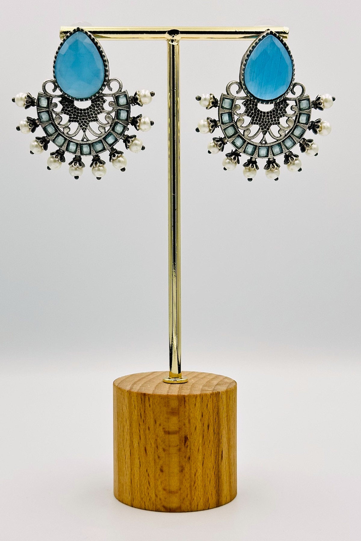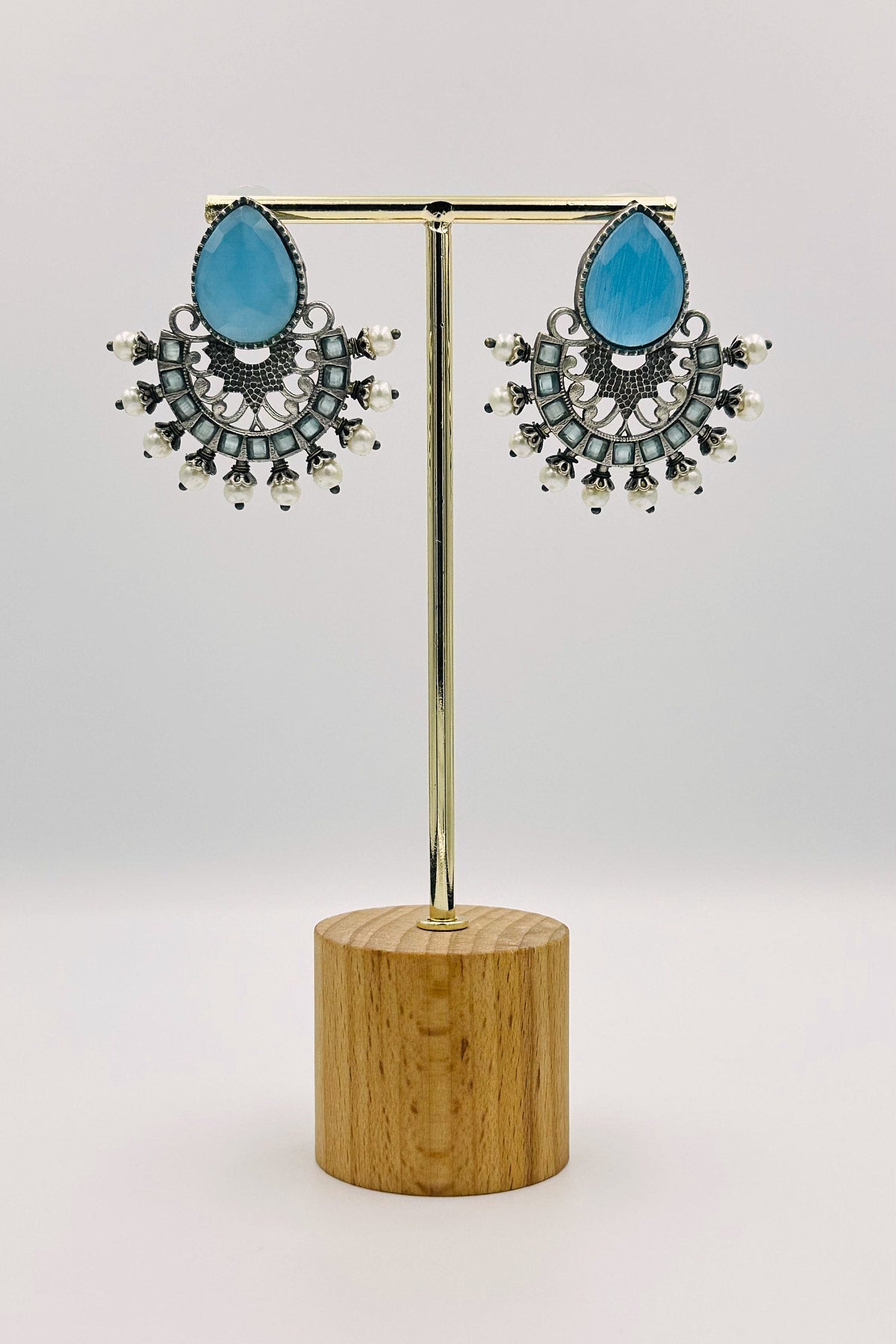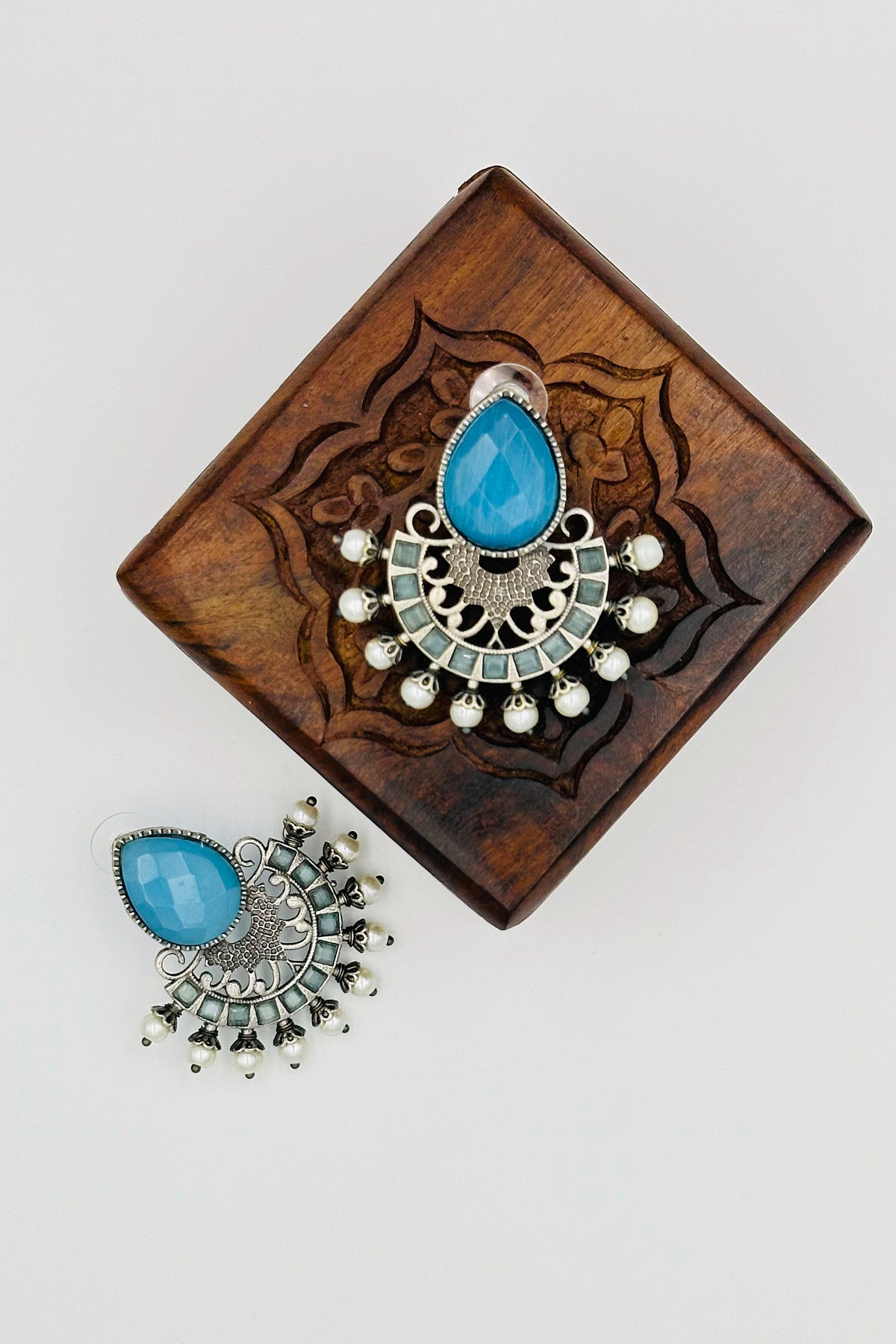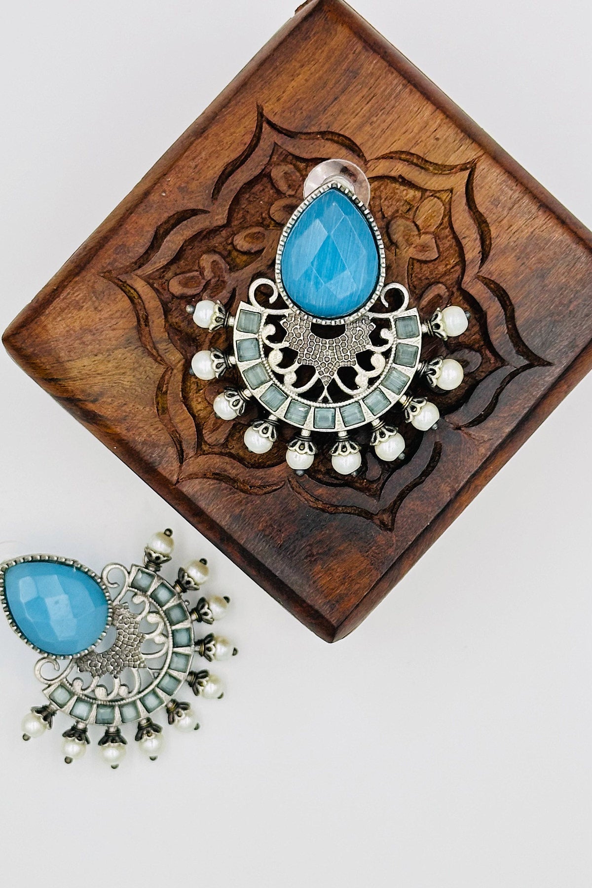 Silver Earrings Adorned with Intricate Blue Pearls and Stones - swadeshsouq.com