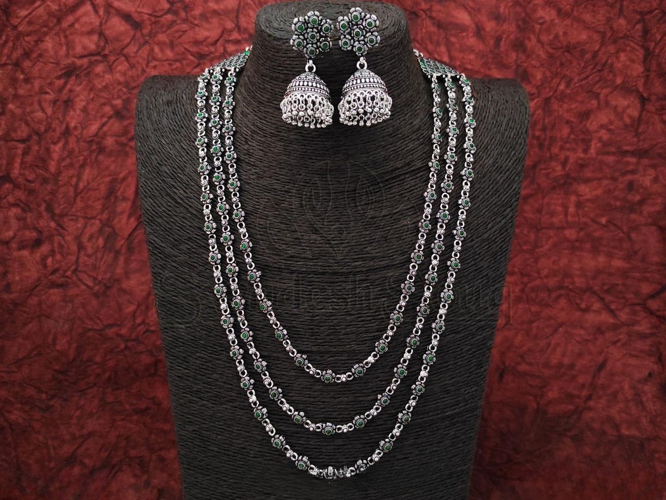 This mesmerizing multi-strand necklace features a unique design, showcasing exceptional craftsmanship and attention to detail. The oxidised silver finish adds a touch of vintage charm to the piece, while the vibrant green stones add a pop of color, creating a stunning and elegant look. Paired with the matching jhumkas, this set exudes sophistication and grace. The intricate design of the earrings features delicate green stones that perfectly complement the necklace, creating a cohesive and elegant look. The multi-strand design of the necklace adds depth and dimension, making it a versatile accessory that can be worn for any occasion.