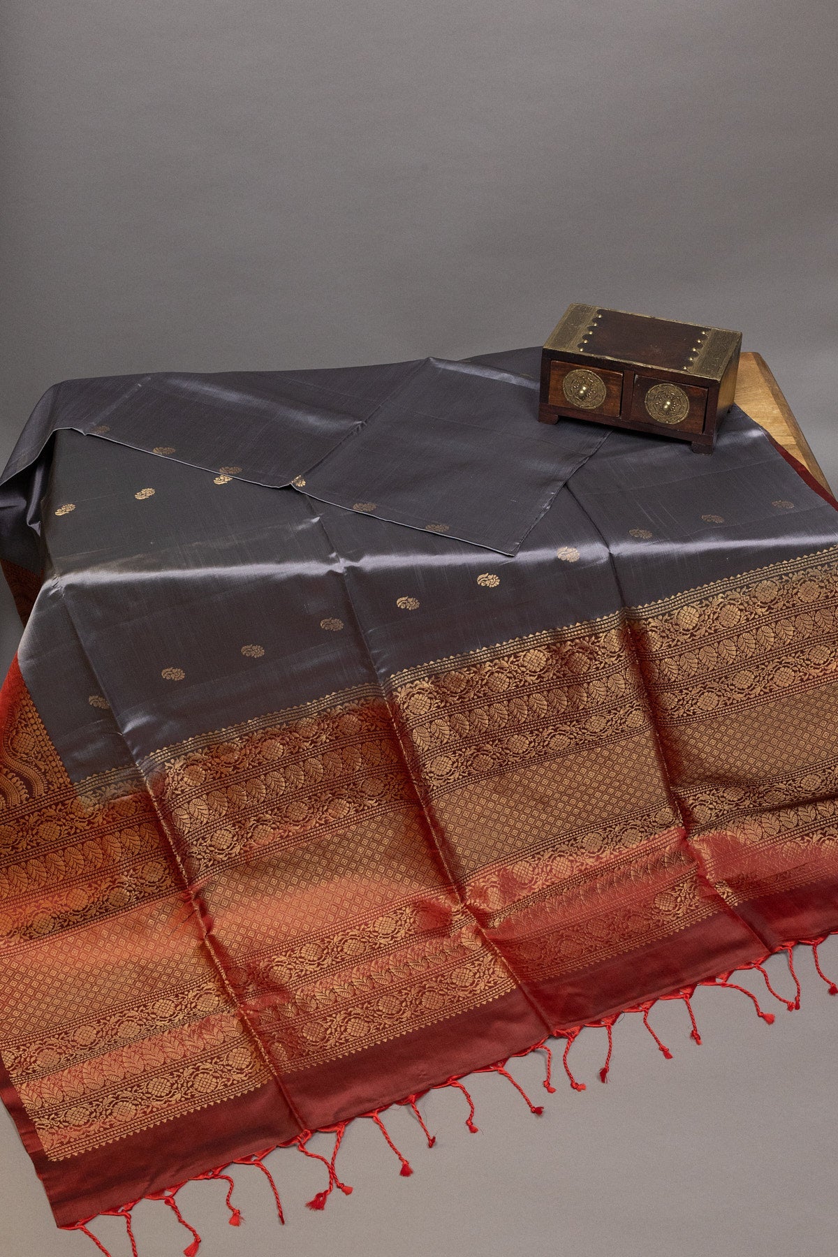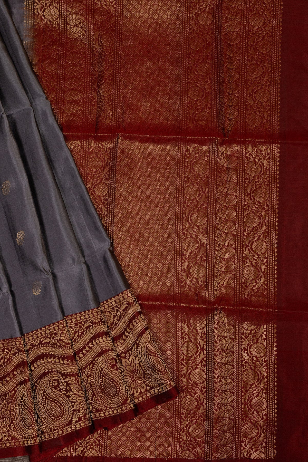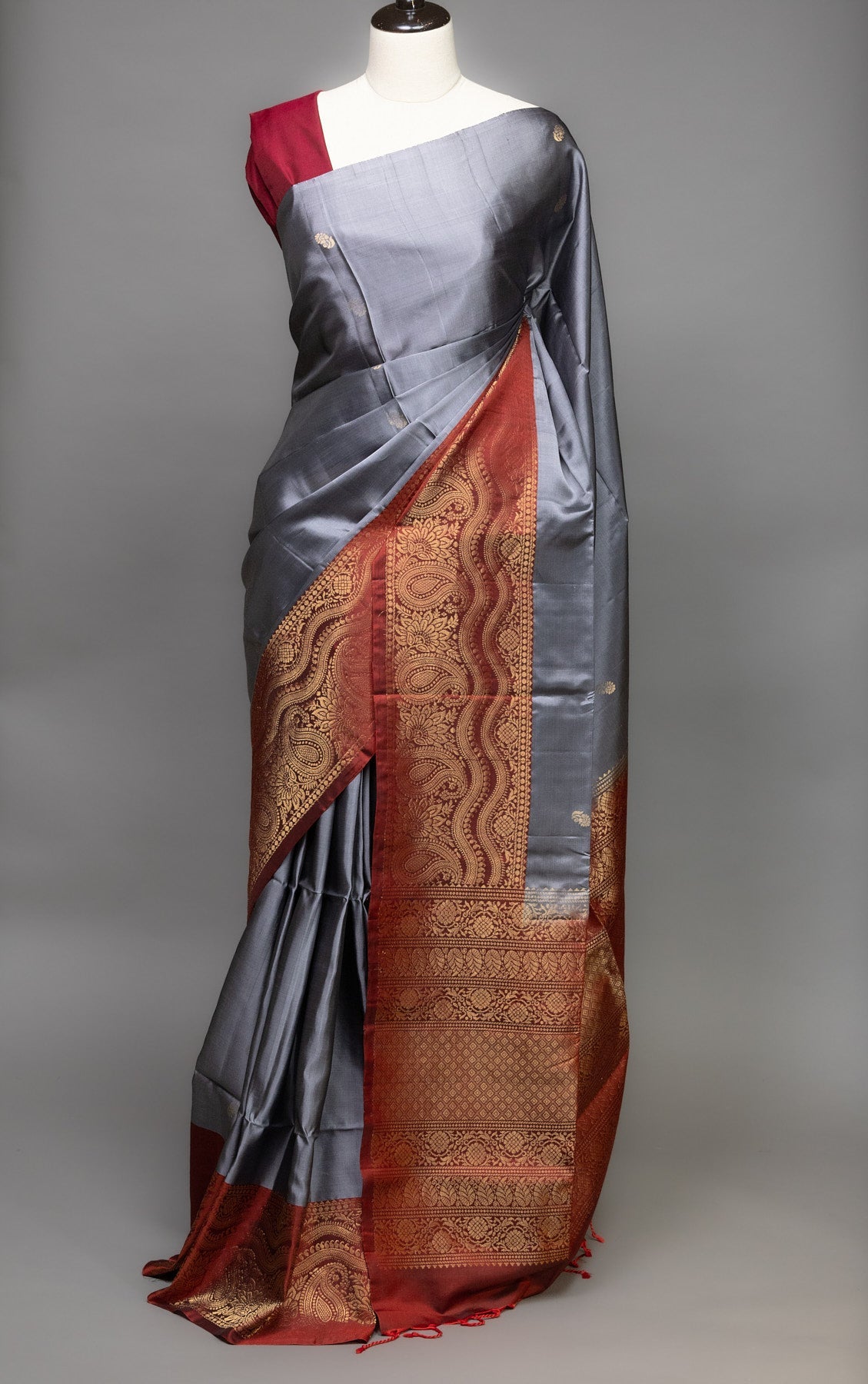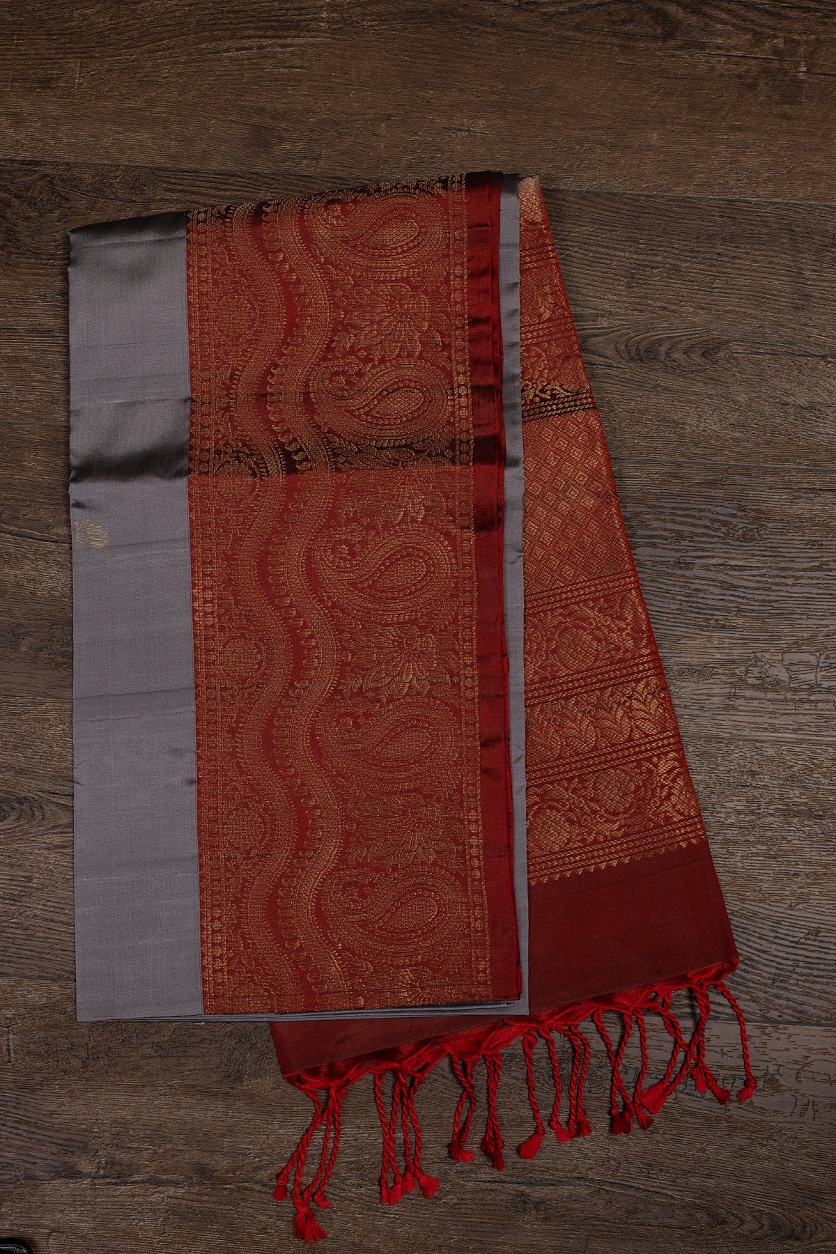 Elevate your style with the timeless charm of the Elegant Sophistication saree. Crafted from the finest Kanjivaram silk, this saree features a striking combination of grey and maroon hues, exuding an air of refined elegance. The intricate designs woven in golden zari add a touch of glamour, while the soft texture ensures comfortable draping. Perfect for any formal occasion, this saree will make you the center of attention wherever you go.