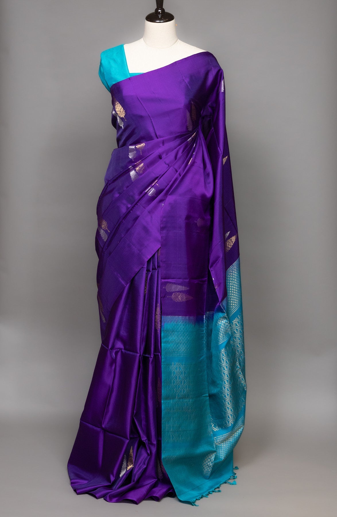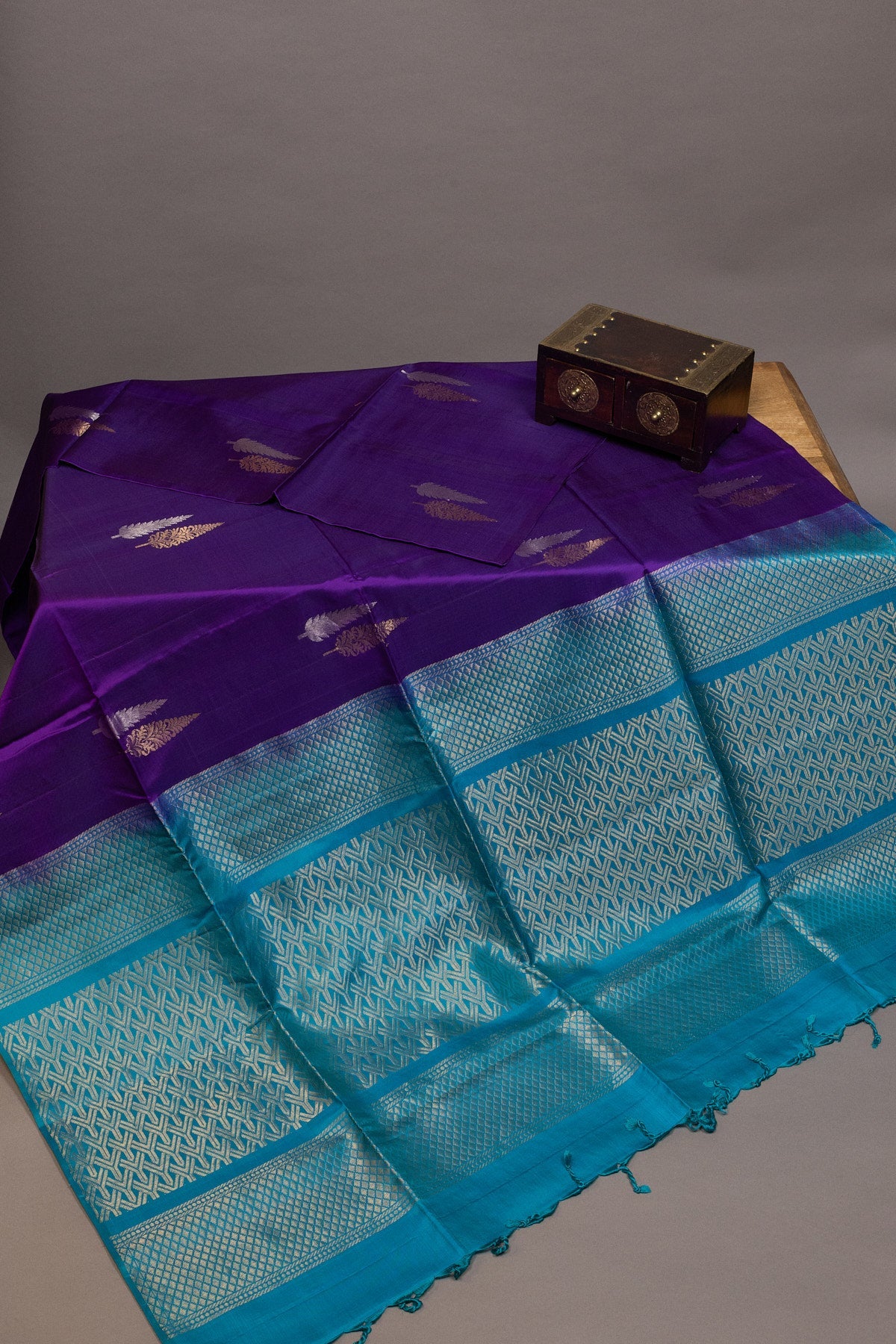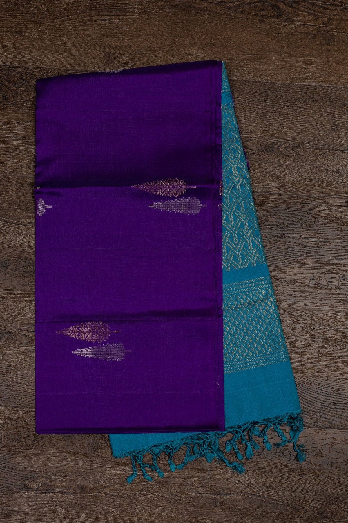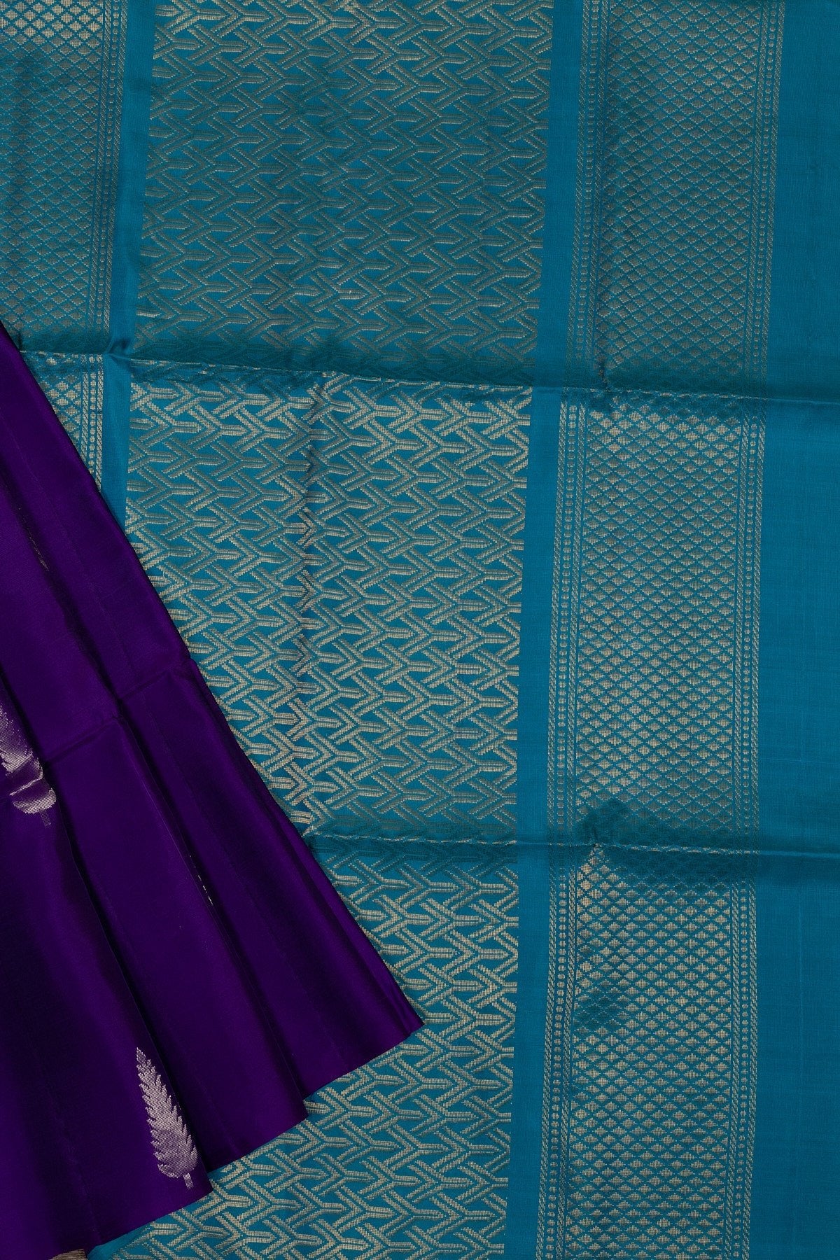 Step up your style with our luxurious deep purple and turquoise blue kanjivaram silk saree. Adorned with intricate dual toned zari borders, this soft silk saree exudes traditional elegance and opulence. Perfect for any special occasion, feel like royalty in this masterpiece.