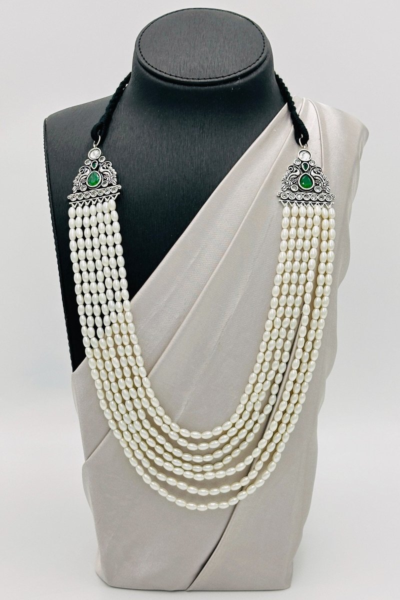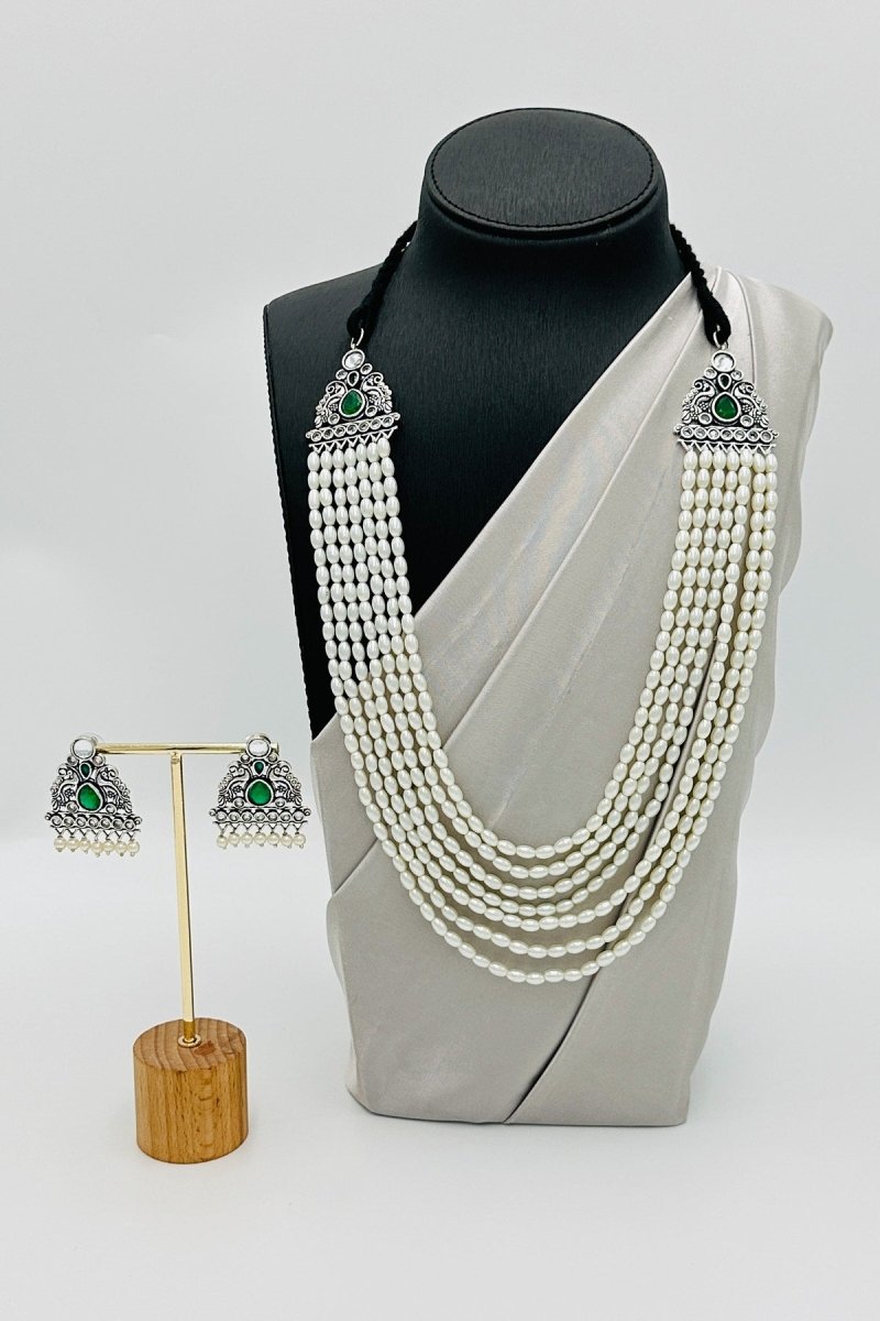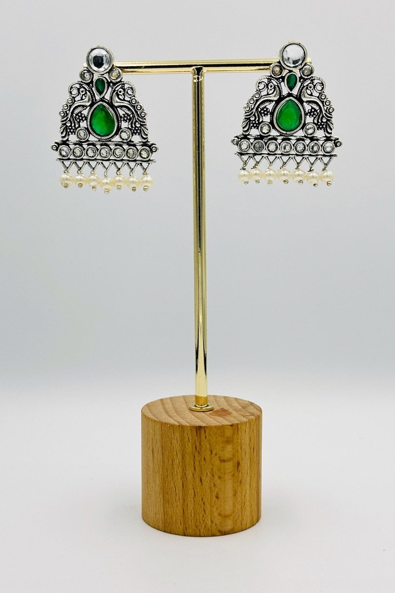 Our Emerald Grace Necklace Set embodies the richness of emerald green pearls, paired with an exquisite peacock pendant. Adorned with hints of red and green stones, this set is a testament to timeless elegance. Matching earrings complement the vibrant necklace, offering a complete and sophisticated look. Perfect for adding a touch of regal beauty to any occasion, this set brings together tradition and modern charm in a stunning display of craftsmanship.