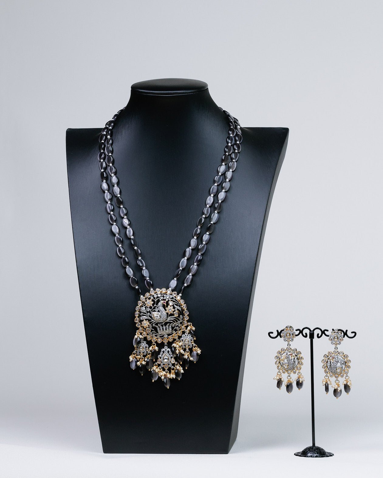 Immerse yourself in the quiet luxury of our Victorian-inspired necklace set, designed with luminous grey crystal beads. The centerpiece, a meticulously crafted pendant, brings together timeless elegance and modern flair. Paired with matching earrings, this ensemble promises an aura of vintage charm and contemporary style, perfect for those moments when you aim to leave an indelible mark. Wear this, and let every facet reflect your unparalleled elegance.