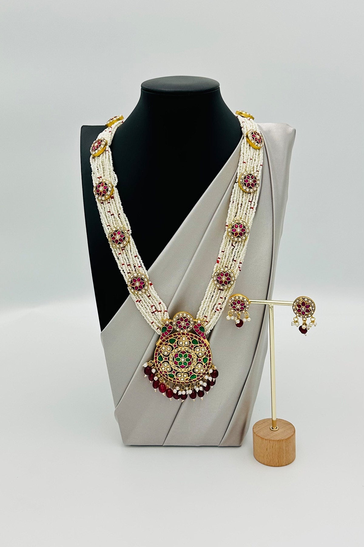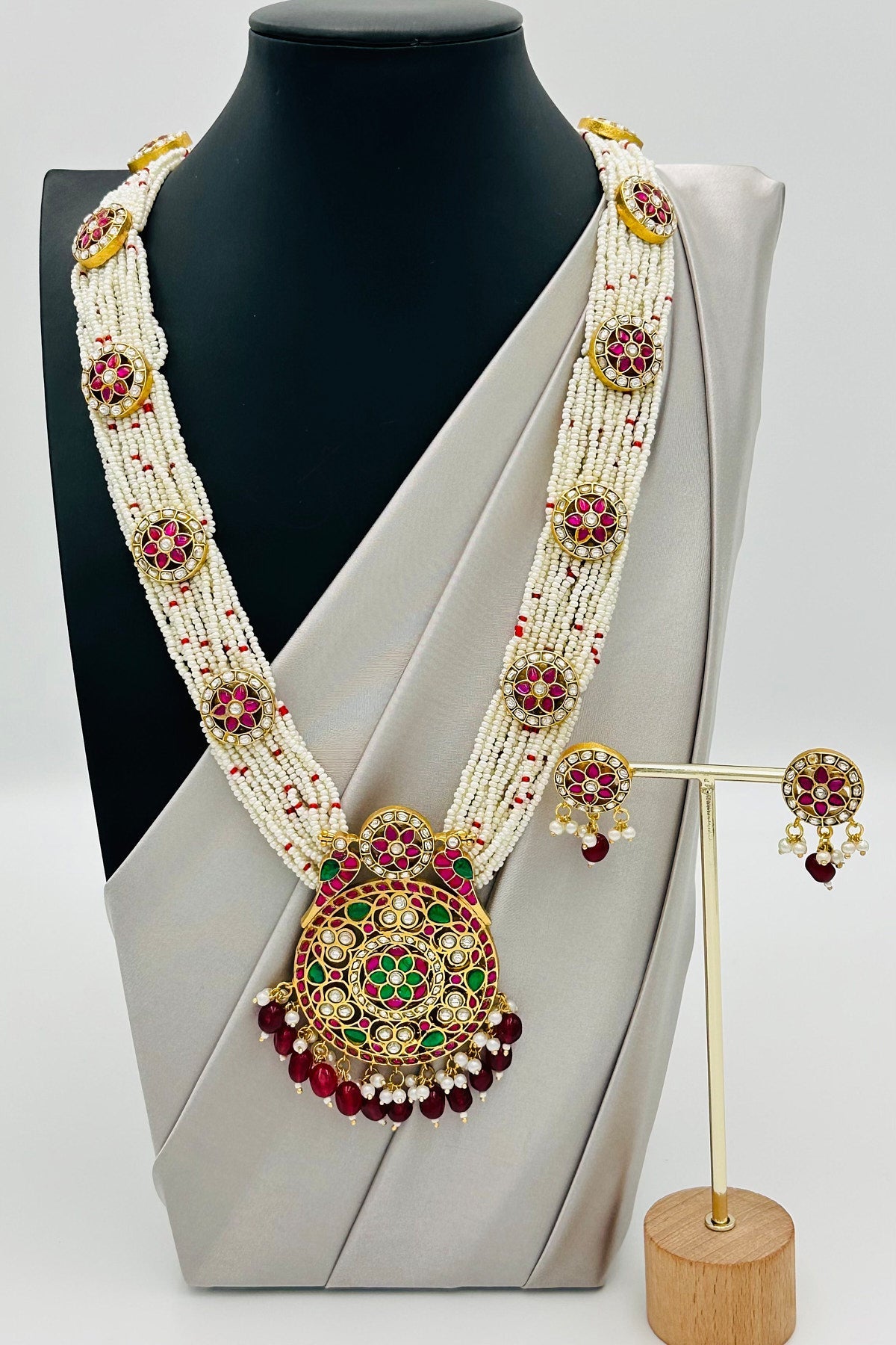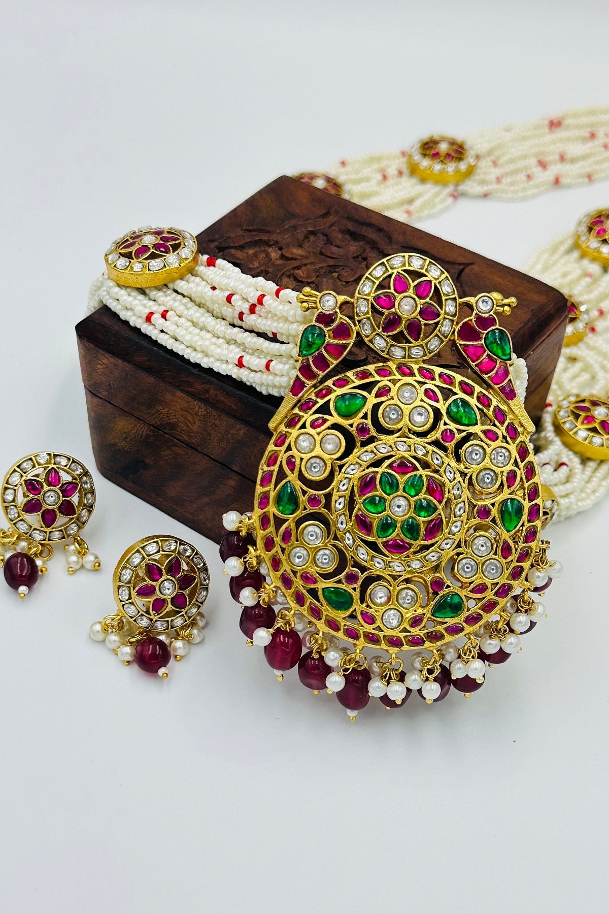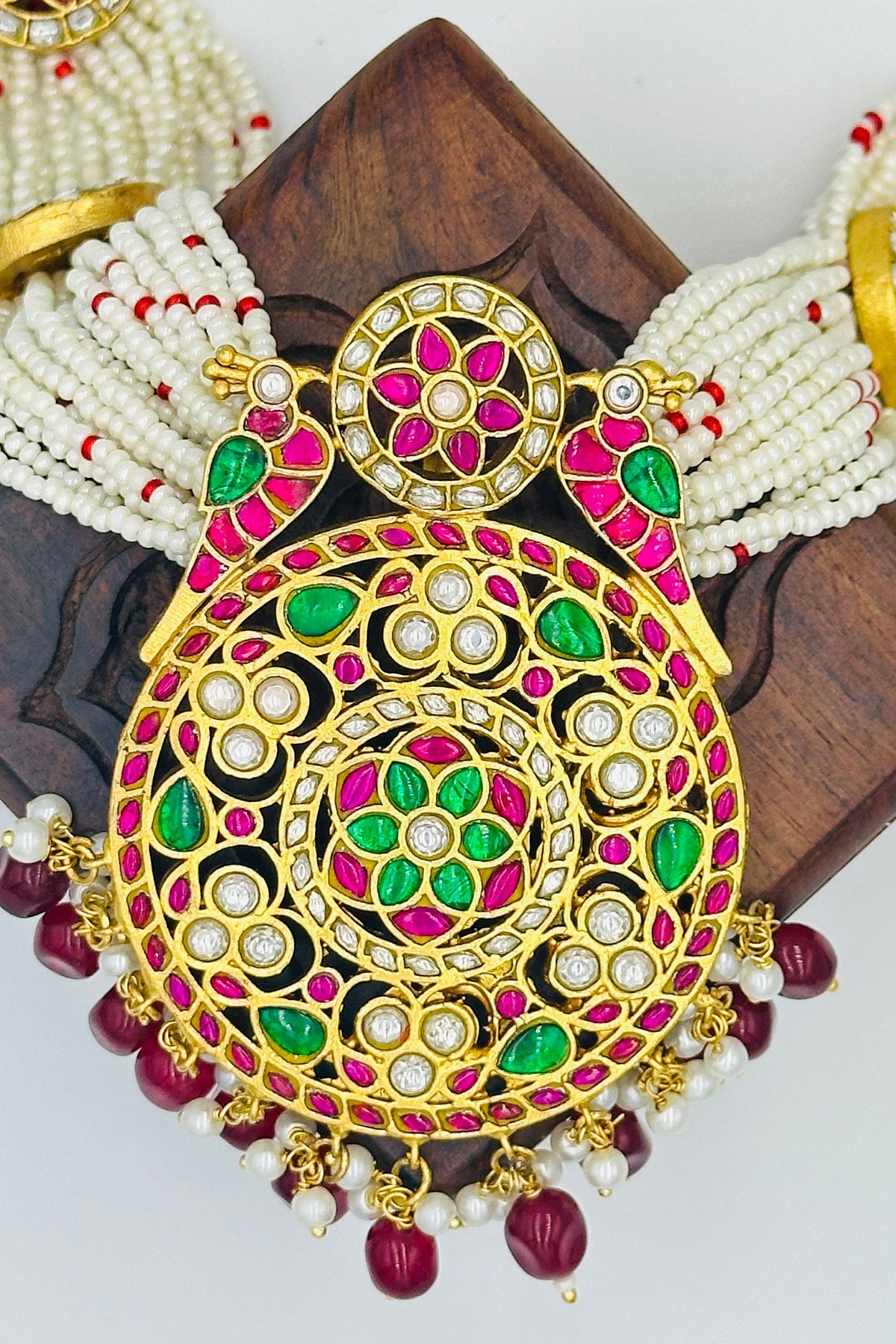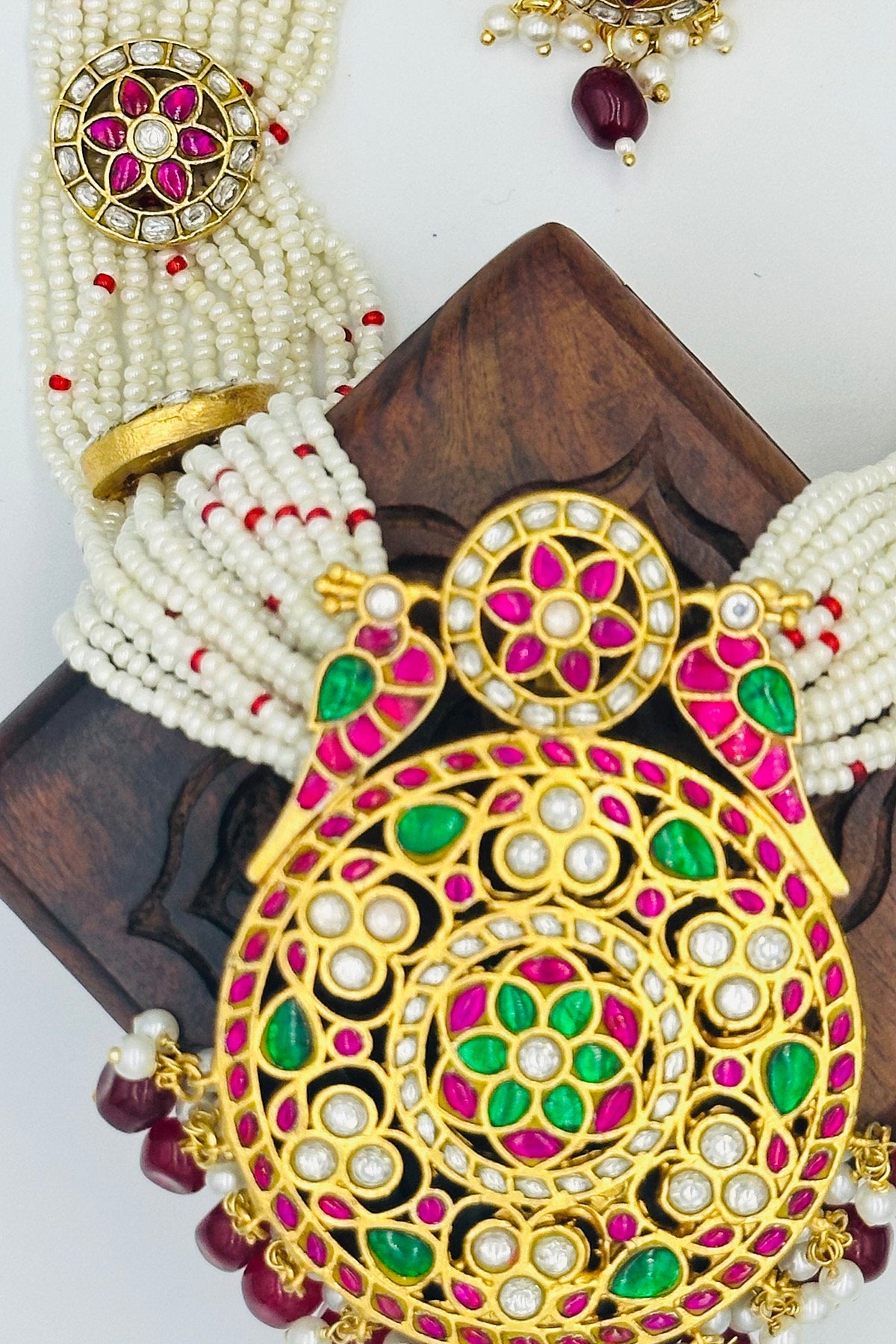 Dive into a world of opulence and allure with our Enchanted Parrot Elegance Necklace Set. Each bead and pearl is meticulously chosen, threading a tapestry of luxury that rests gracefully on your neckline. At its heart lies a pure brass pendant, masterfully embossed with a parrot design - a symbol of love, beauty, and nature's undying spirit. Encrusted with precious Jadau stones and twinkling AD's, this pendant narrates tales of royal grandeur. The set is flawlessly paired with matching earrings, capturing the essence of timeless beauty. Whether it's a gala, wedding, or an evening soiree, make a statement and let every gaze be locked onto you. Own, wear, and flourish in the legacy of regal charm.