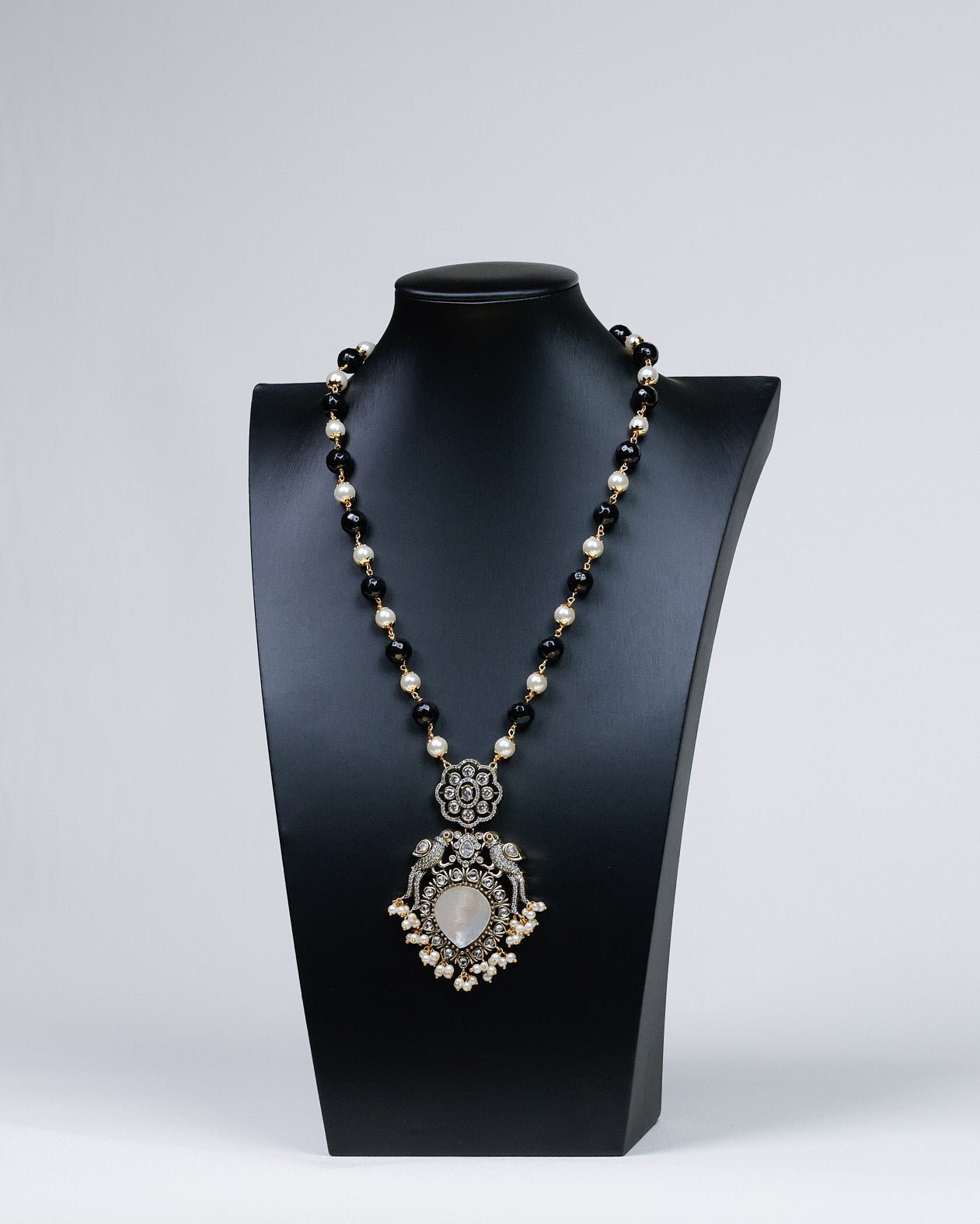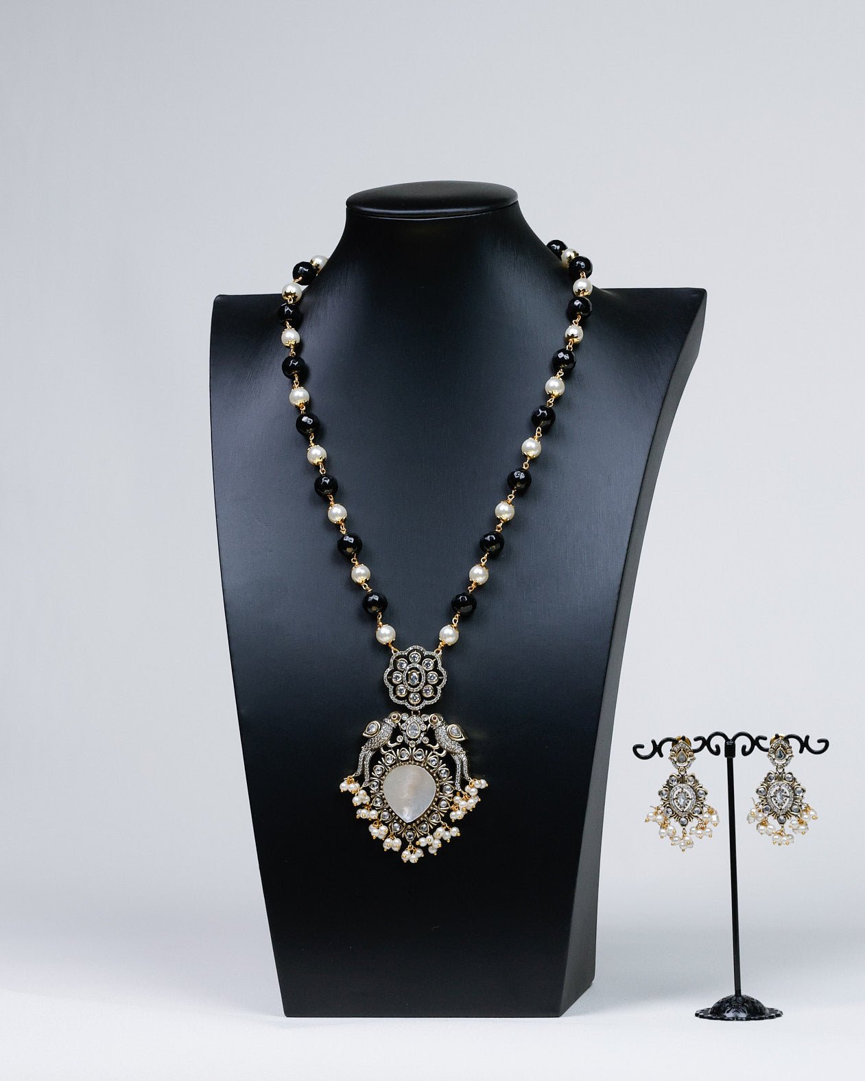 Noir Allure: Parrot-Adorned Black Crystal & Pearl Ensemble - swadeshsouq.com