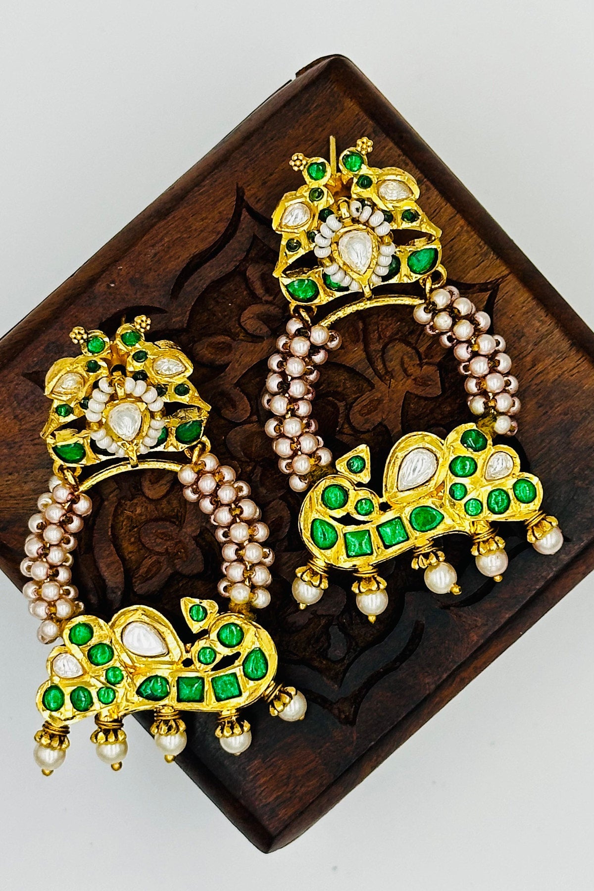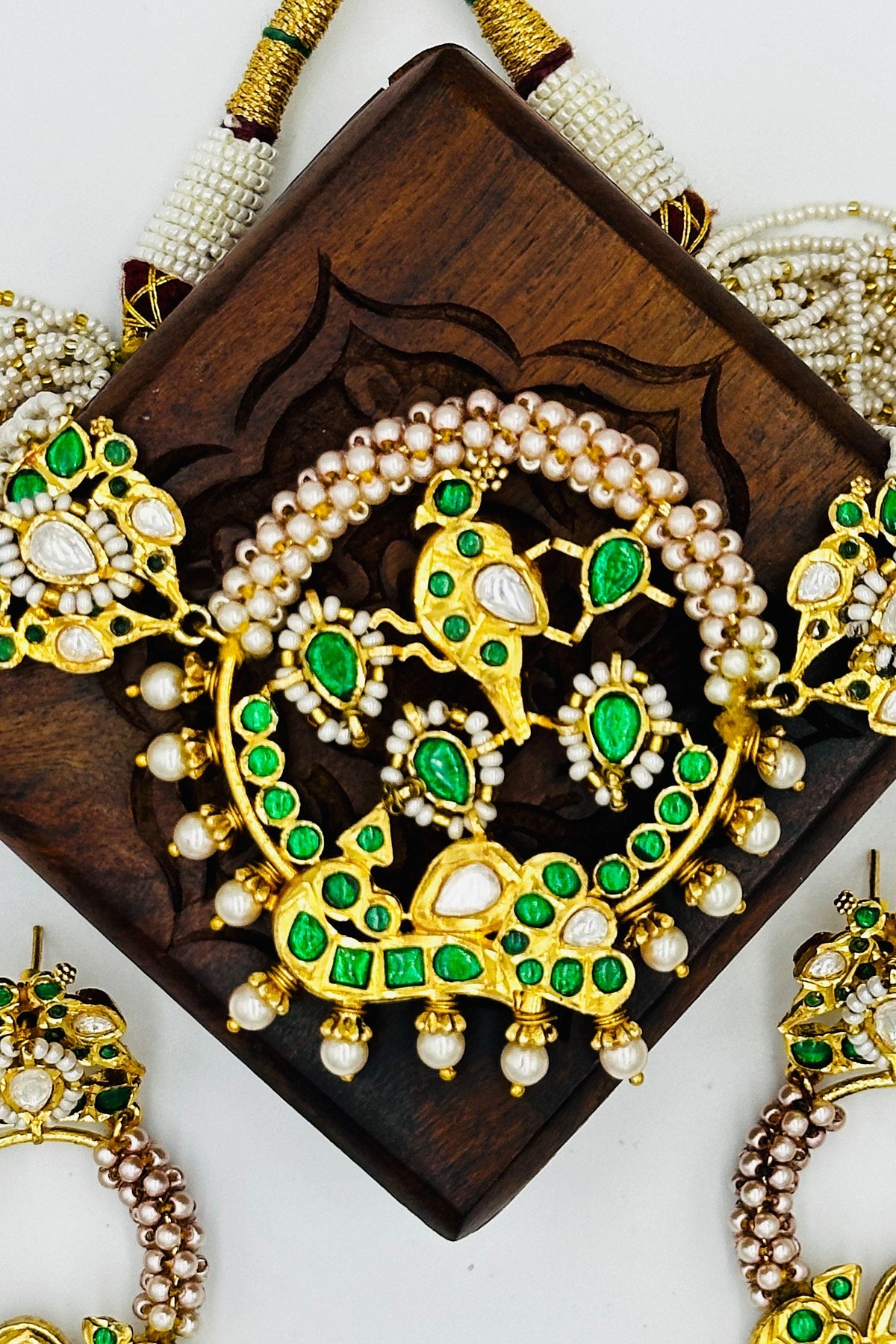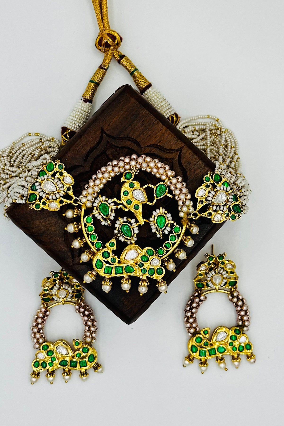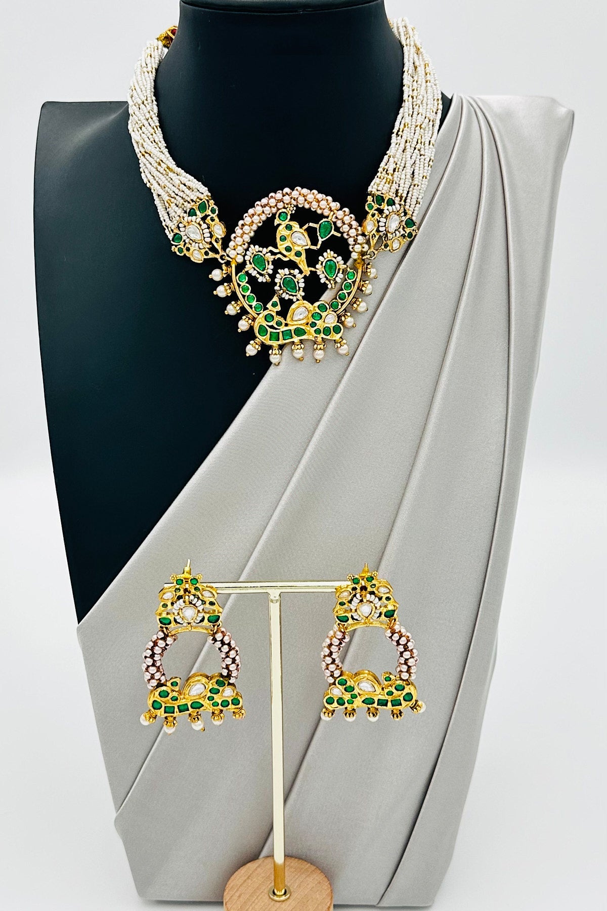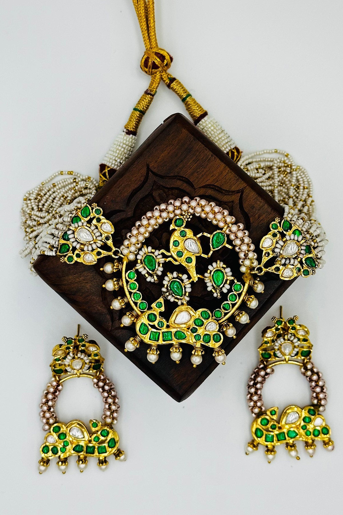 Unveil an ensemble where tradition meets grandeur: our exquisitely crafted choker set, a harmonious blend of lustrous pearls and captivating green stones. Every inch of this piece speaks of meticulous hand-craftsmanship, with authentic designs weaving a narrative of age-old artistry and modern elegance. The pearls, synonymous with timeless grace, are interspersed perfectly with the deep allure of the green stones, creating an enchanting rhythm of luxury around your neck.