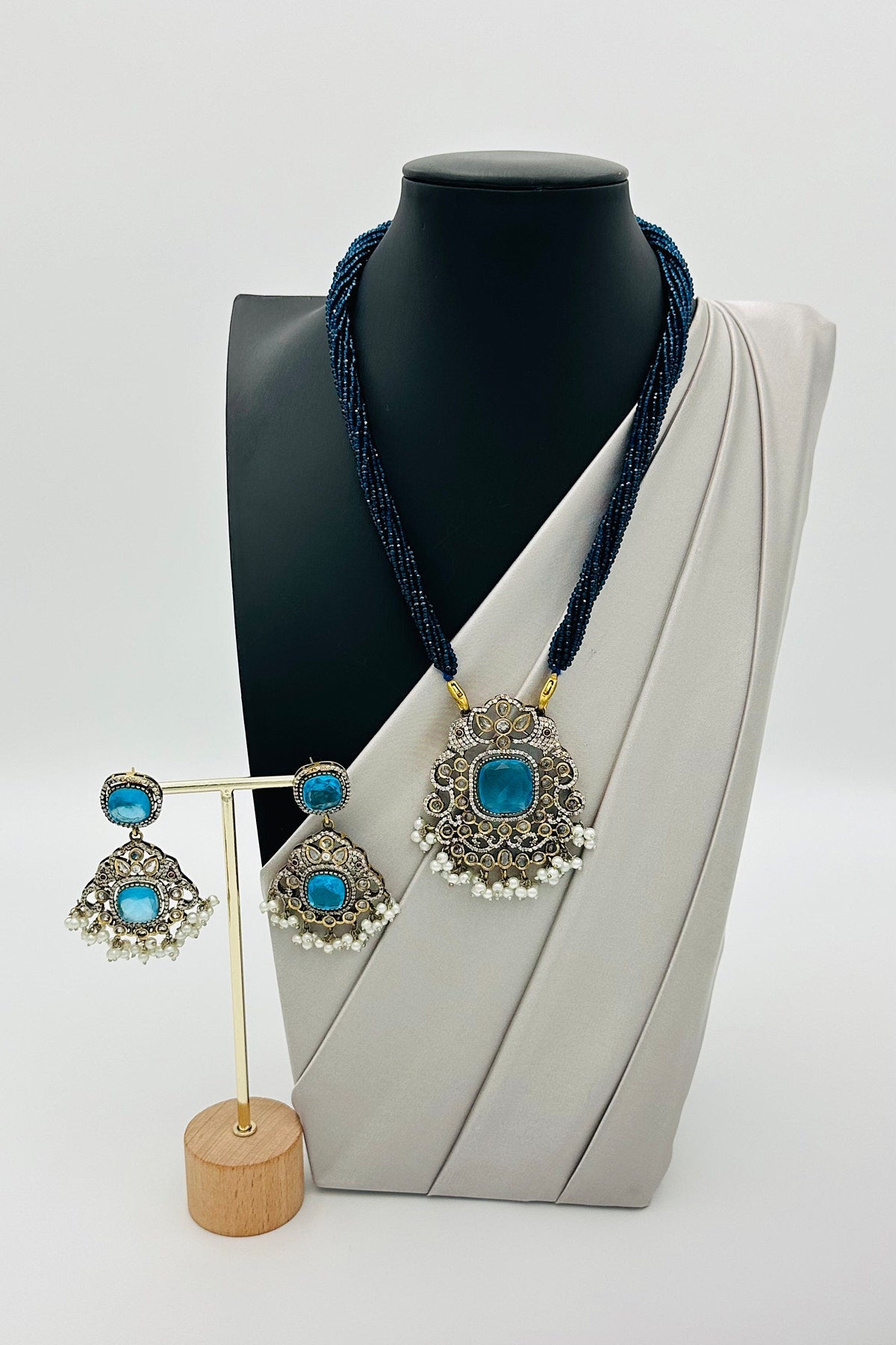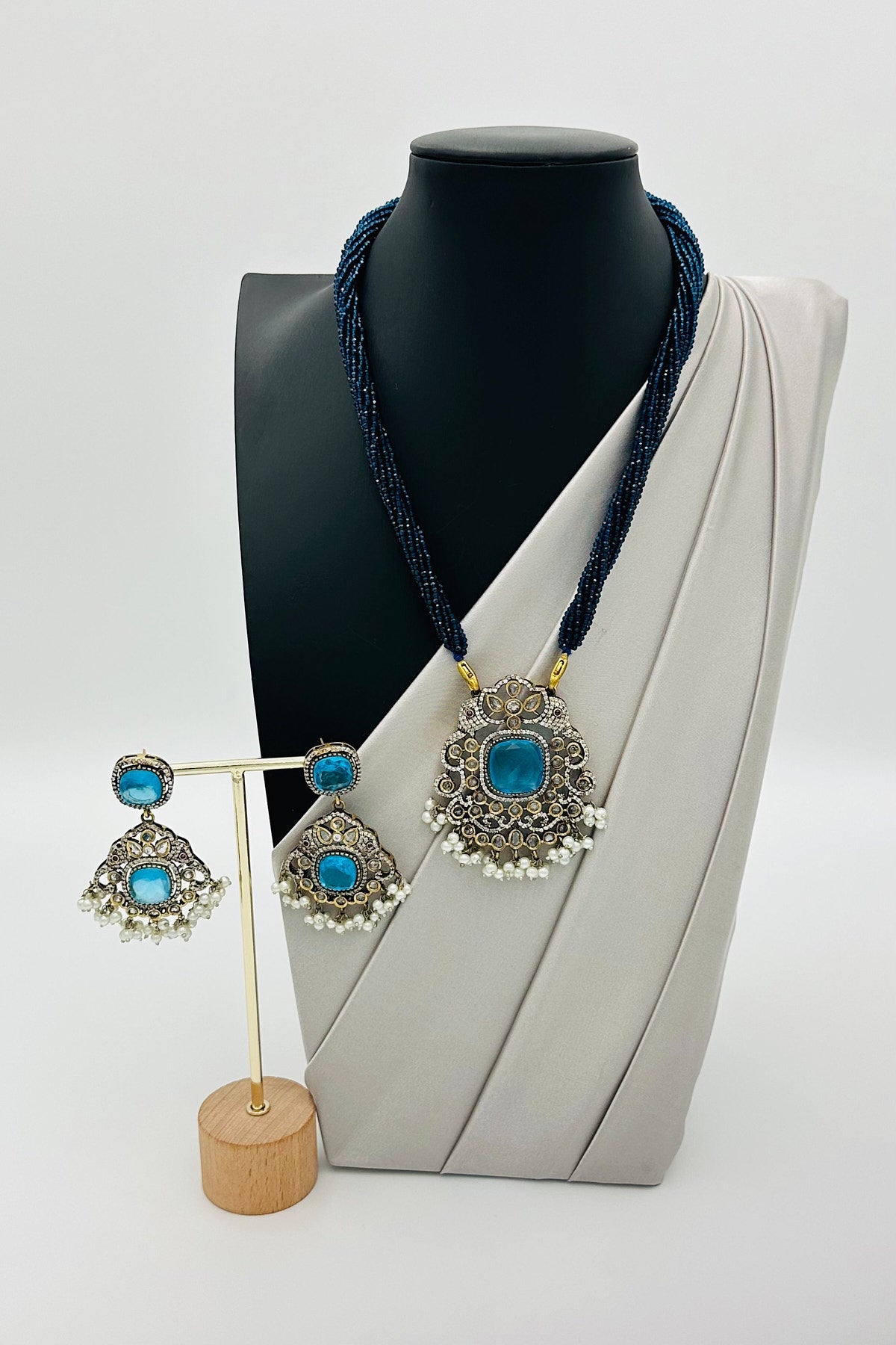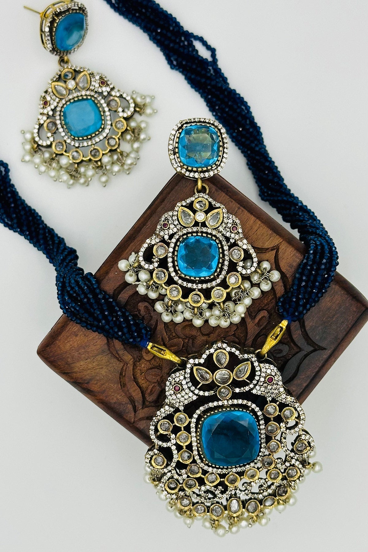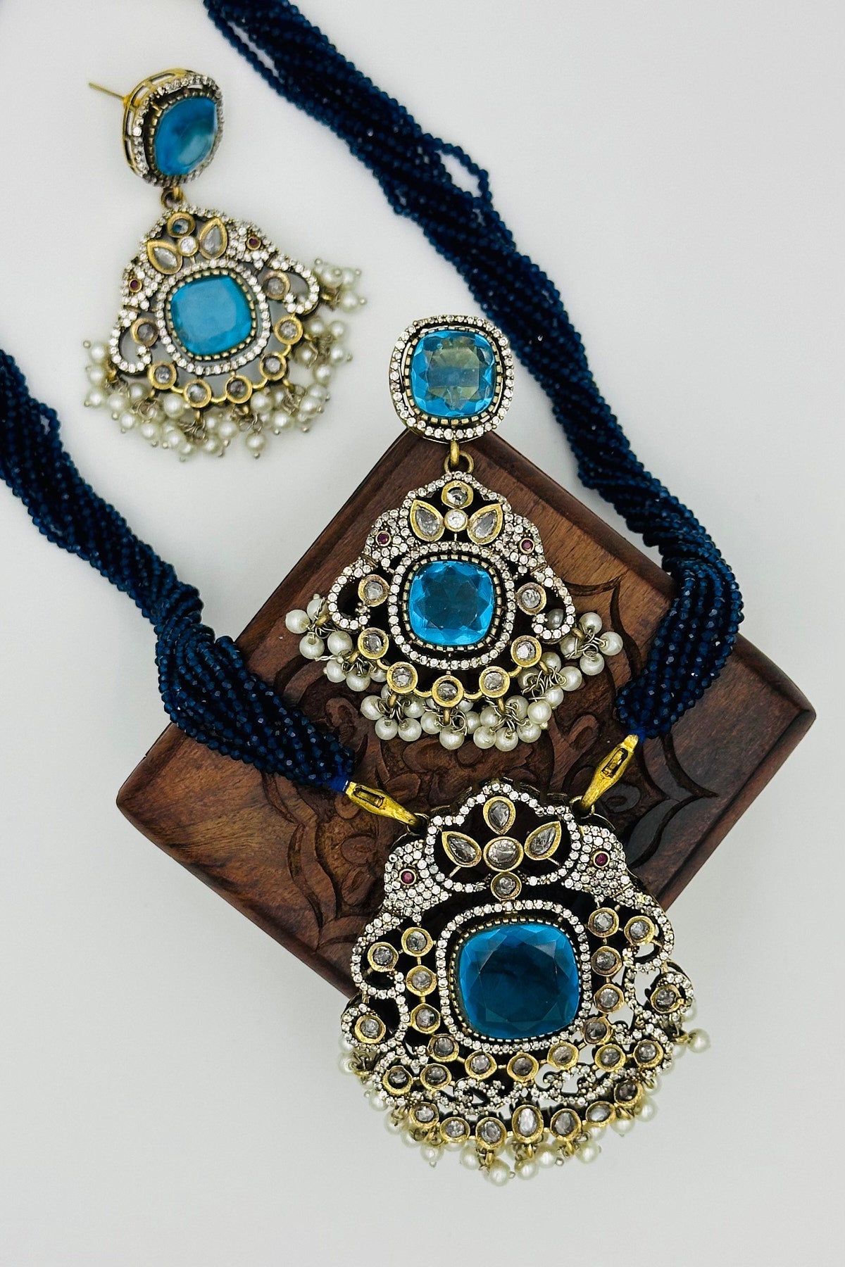 Delve into the realm of elegance with our sapphire blue crystal necklace. This exquisite piece features a pendant with a captivating elephant design, meticulously embedded with AD stones, evoking a sense of regality and tradition. Complementing the necklace, the matching earrings complete the ensemble, offering a cohesive and polished look. This set is not just jewelry; it's a statement of refined taste and cultural appreciation. Perfect for moments when you want to shine the brightest.