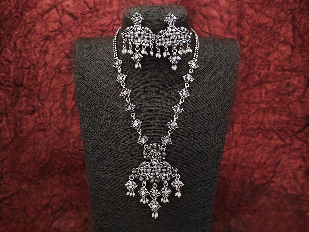 Stunning Sophistication: Oxidized Silver Long Chain with White Stone Danglers and Pearl Tassels. - swadeshsouq.com