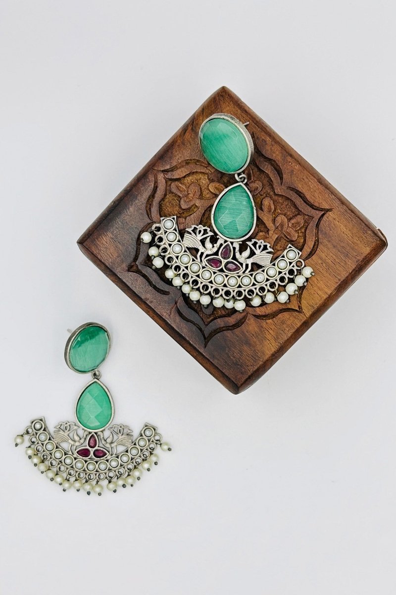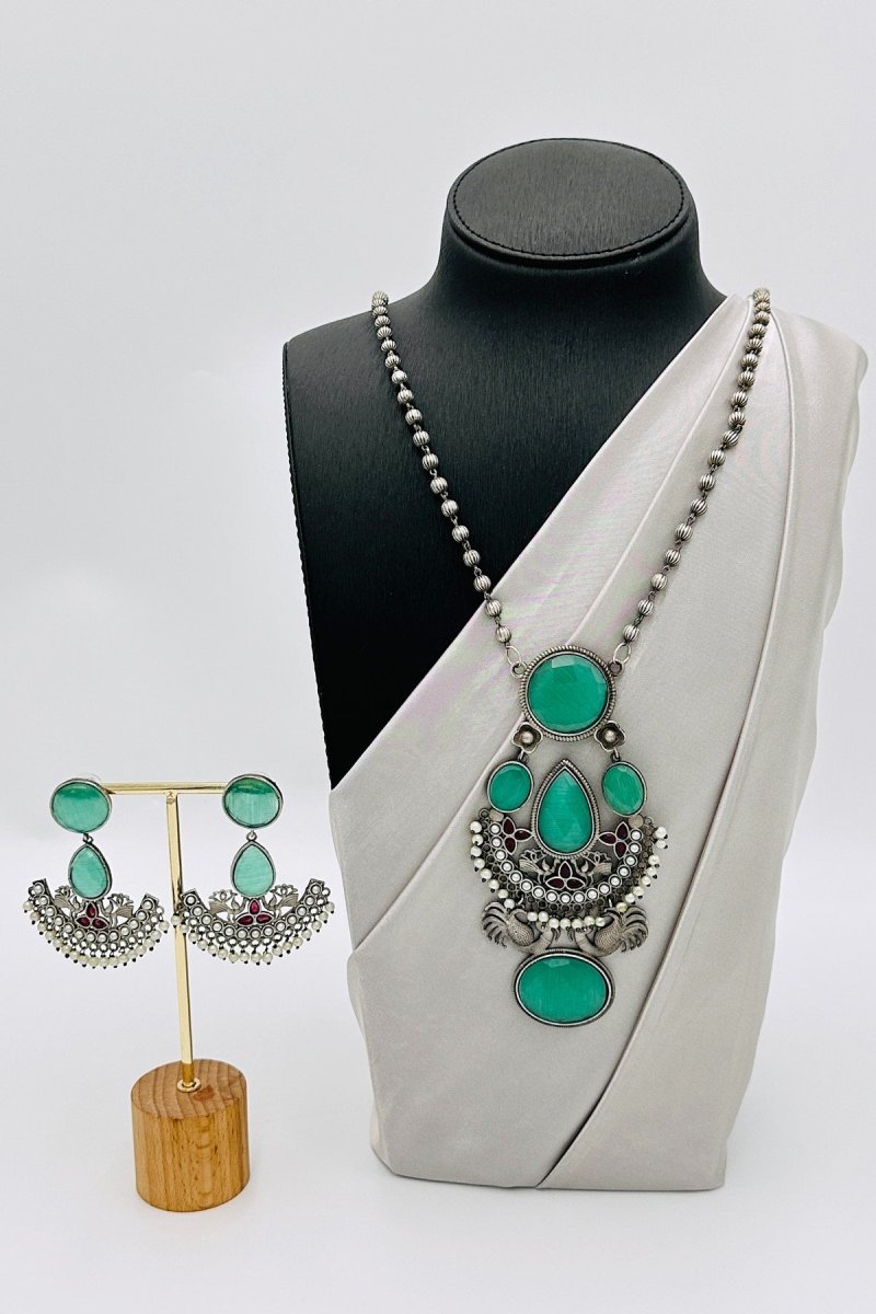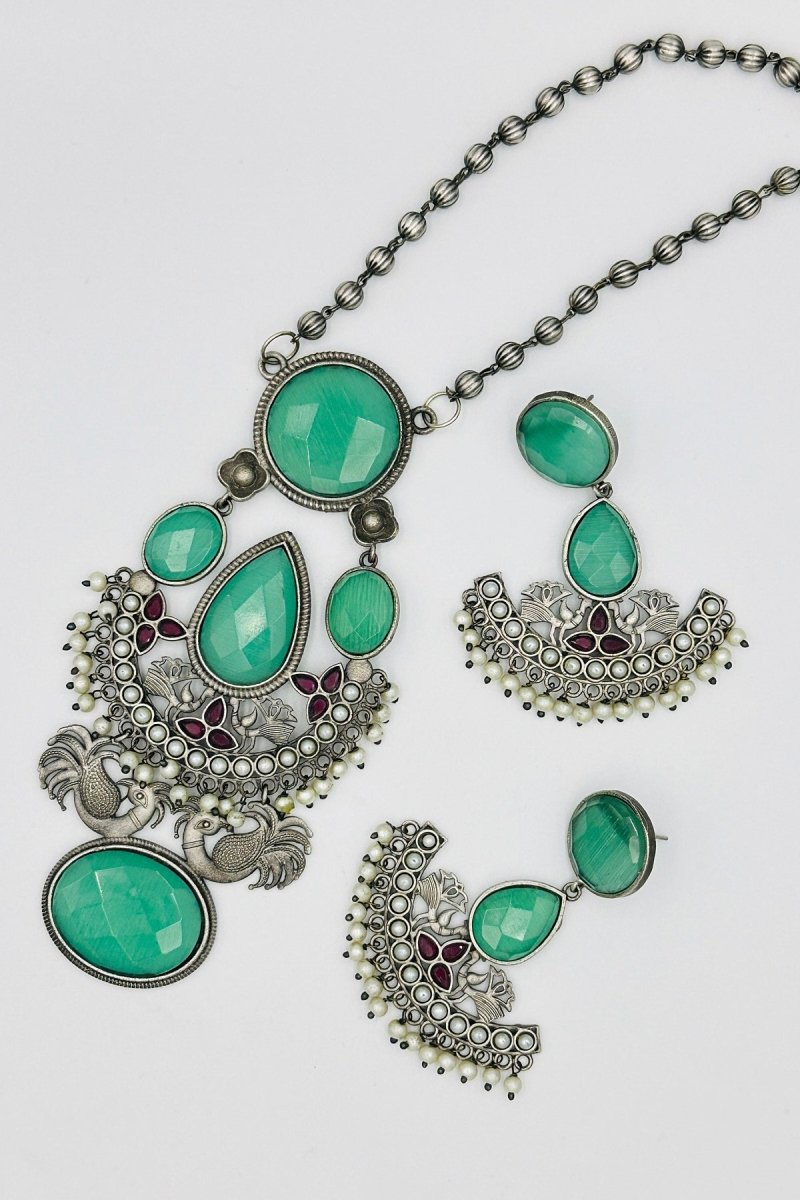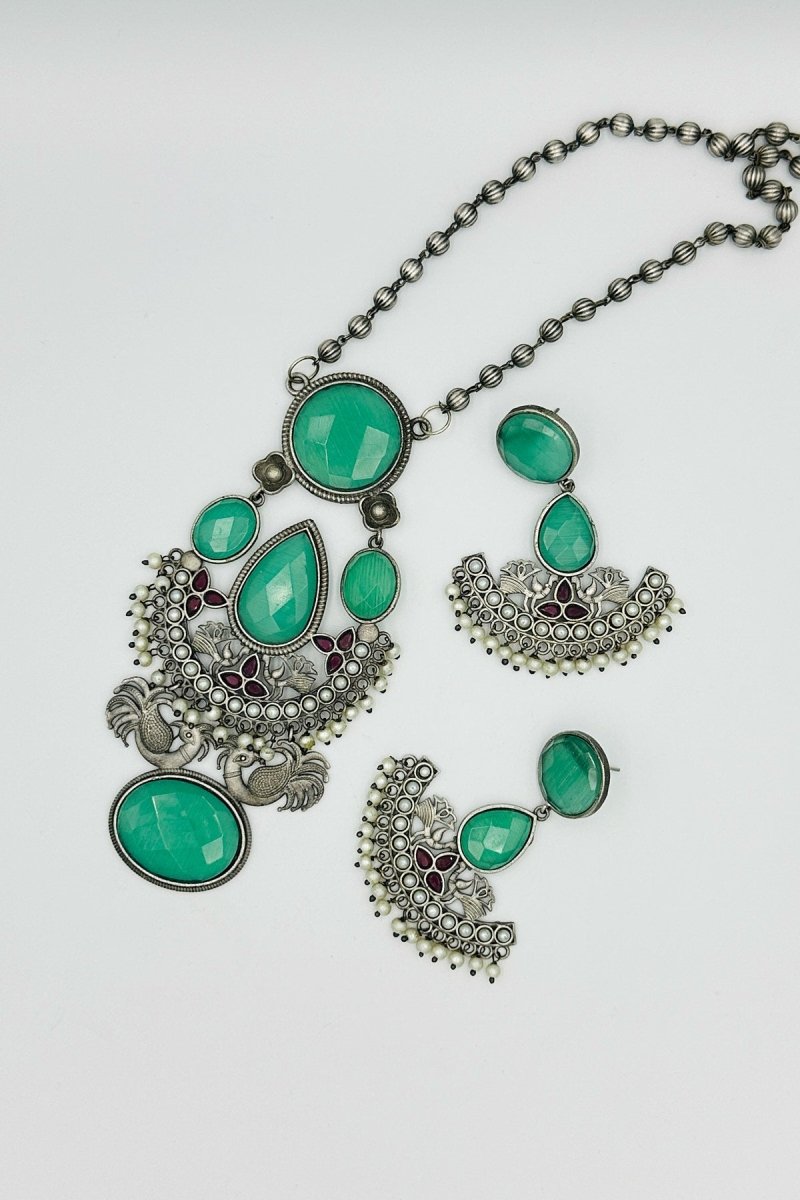 Turquoise Charm: Silver Necklace Set with Red Accents - swadeshsouq.com