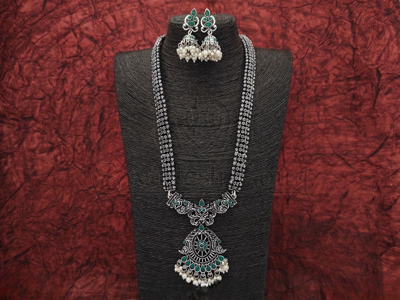 Vintage Charm: The Oxidised Silver Necklace Set with Green Stones And Pearls
