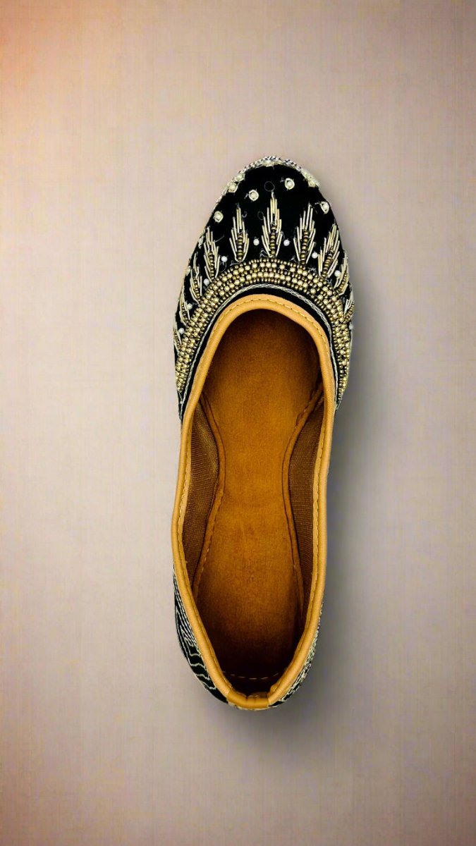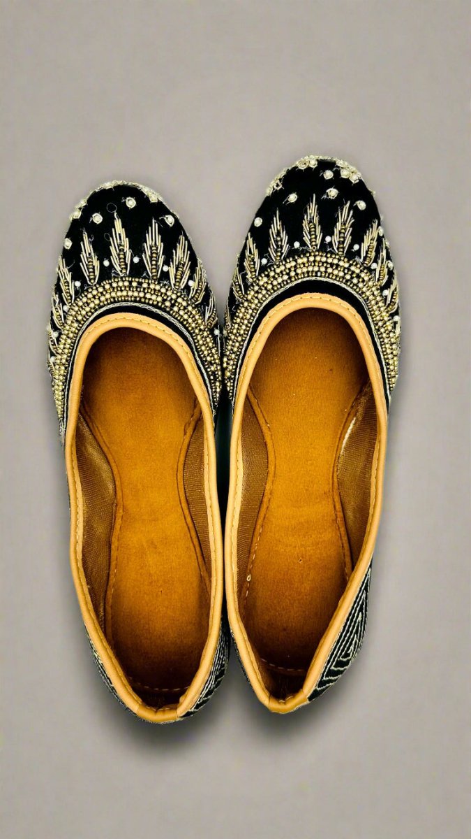 Elevate your ethnic style with these exquisite handcrafted black juttis. Intricately designed with delicate embroidery and beadwork, these traditional footwear pieces bring elegance and comfort together. Featuring a soft leather inner sole and a stunning black velvet base adorned with golden patterns, these juttis are perfect for weddings, festive occasions, and casual ethnic outings.