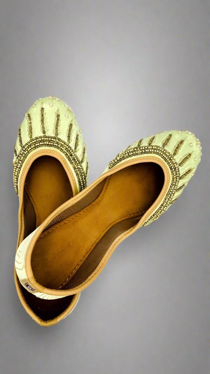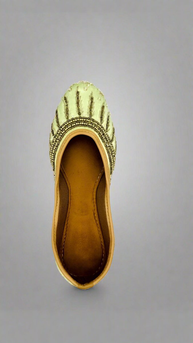 Add these handcrafted Pista Green embroidered juttis to your footwear collection and step out in timeless ethnic style! Perfect for women seeking elegance, tradition, and comfort.