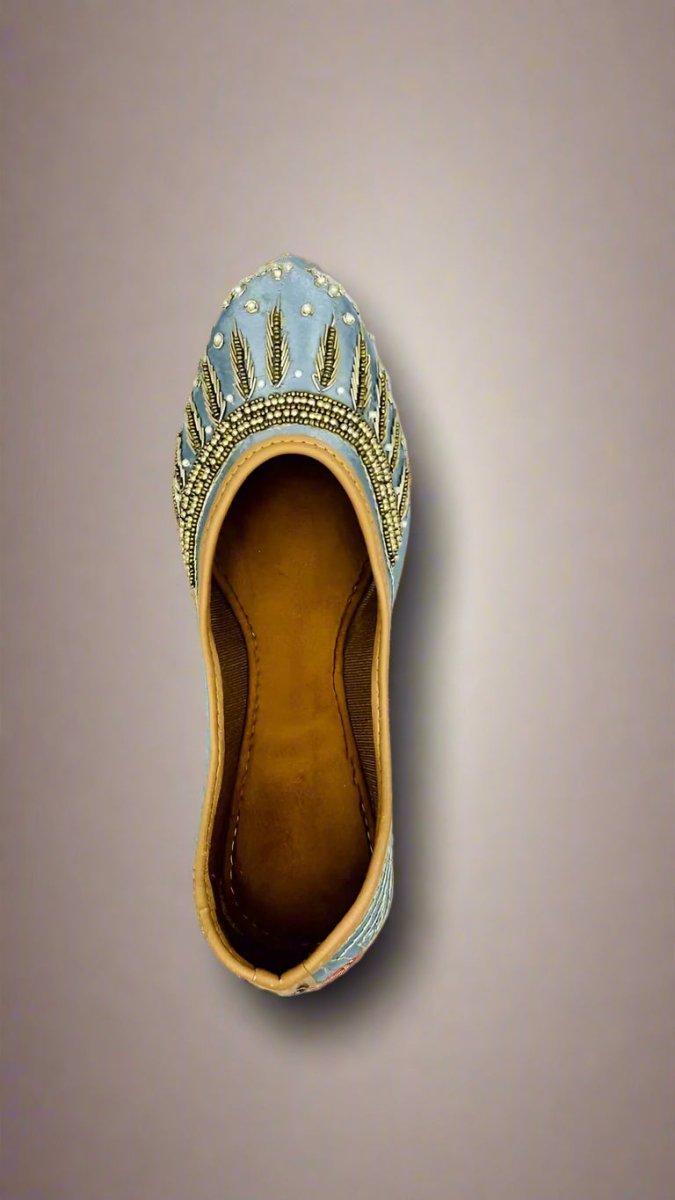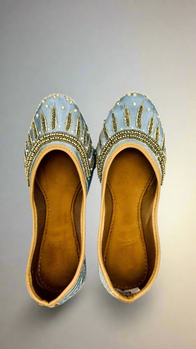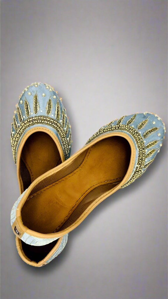 Enhance your ethnic wardrobe with these handcrafted yellow embroidered juttis, beautifully designed with intricate golden embroidery and detailed beadwork. The soft pastel yellow base combined with elegant embellishments makes these traditional Indian shoes perfect for weddings, festive celebrations, and casual outings.