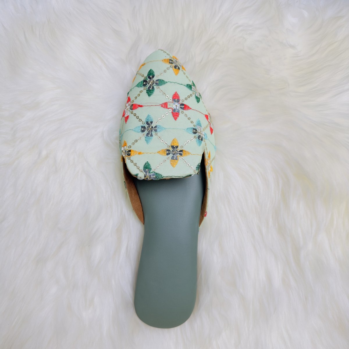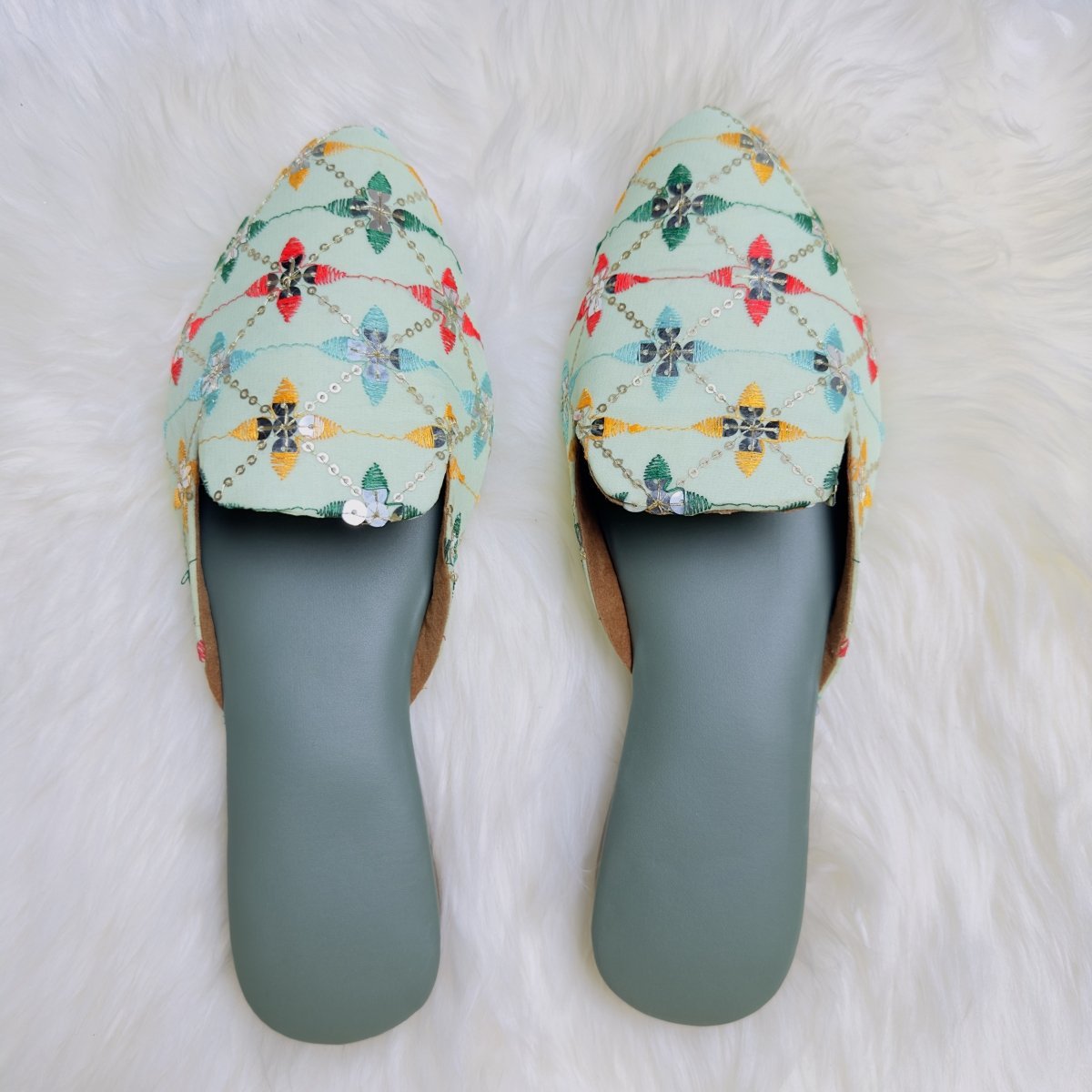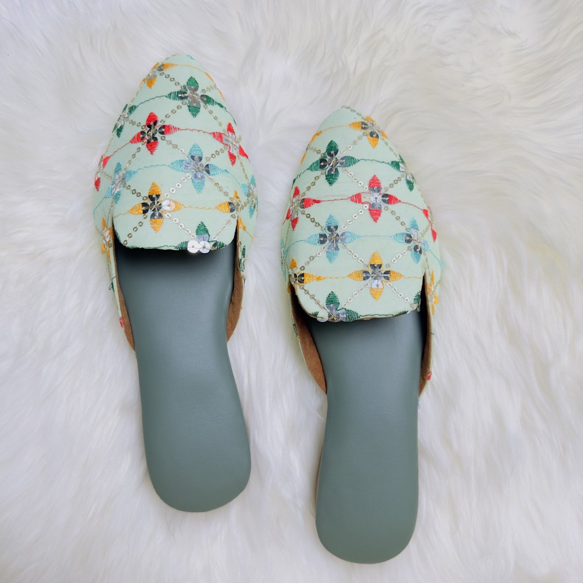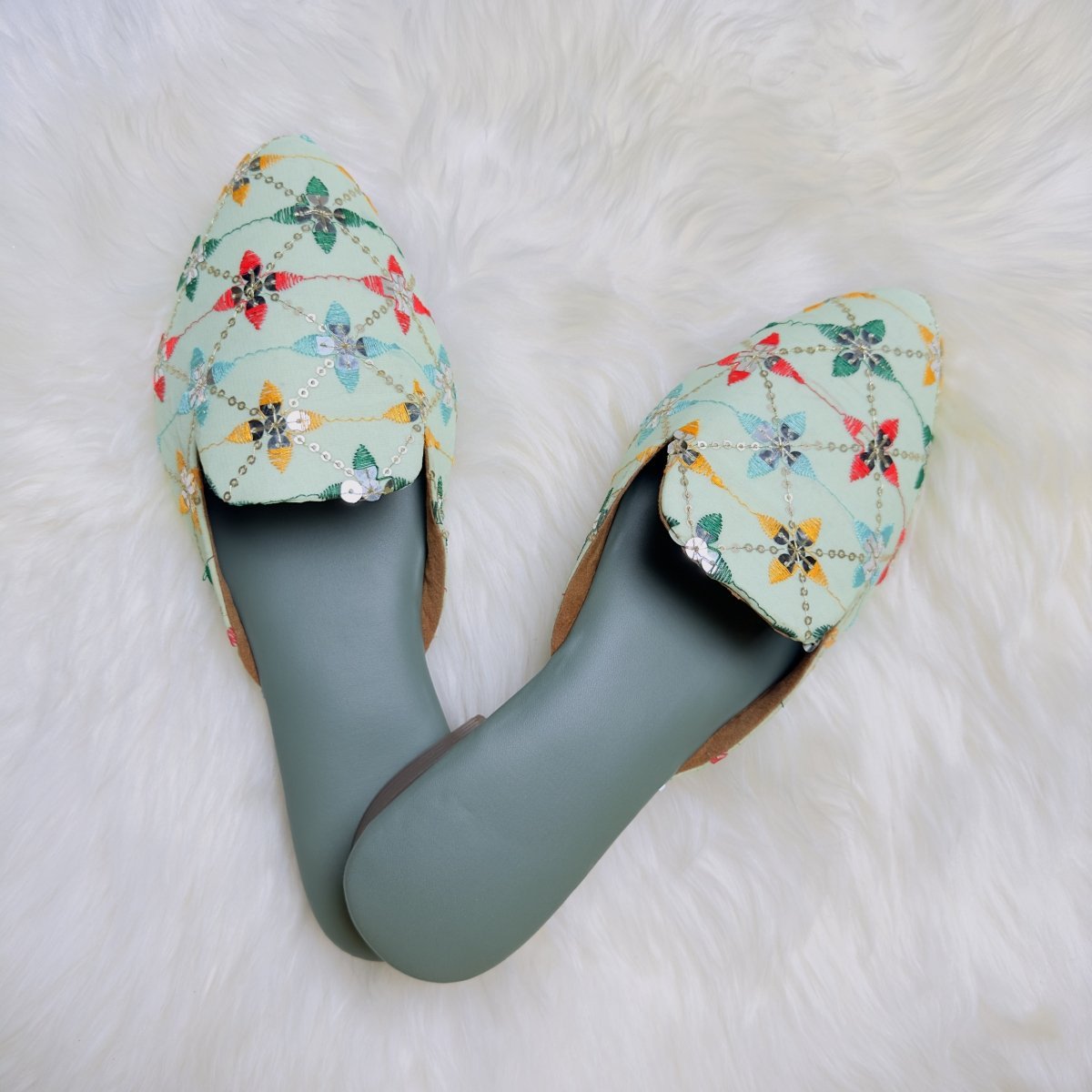 Step up your style with these Jaipuri handmade sandals in a refreshing mint green shade, showcasing the timeless elegance of Rajasthani craftsmanship. Adorned with vibrant multicolored embroidery and intricate mirror work, these sandals bring the cultural richness of Jaipur's traditional artistry to life. The soft mint green color adds a calming and sophisticated appeal, making them perfect for festive occasions, cultural events, or everyday wear. Experience the perfect blend of comfort and ethnic charm with these beautifully handcrafted sandals that make every step a statement.