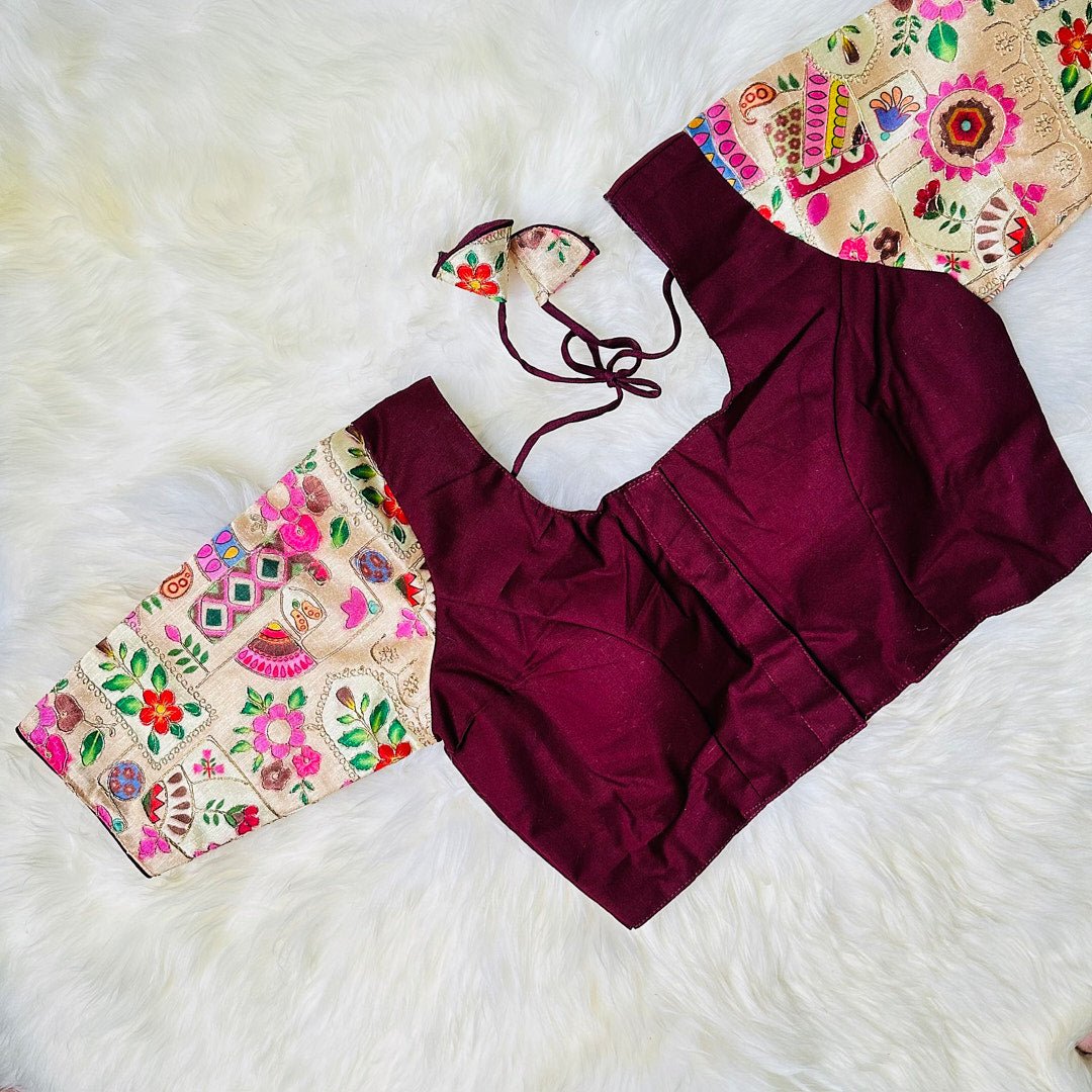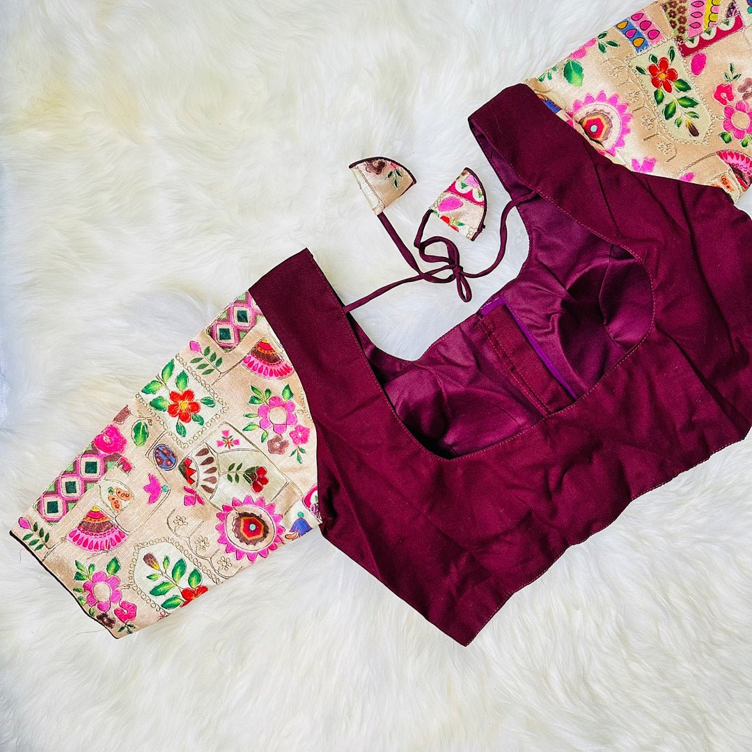 This exquisite blouse features a rich and luxurious Maroon hue that exudes sophistication and elegance. Its contrasting sleeves add a playful and modern twist, showcasing a beautiful design that seamlessly blends contemporary style with classic grace. This garment is sure to elevate any outfit and make a statement with its stunning beauty.