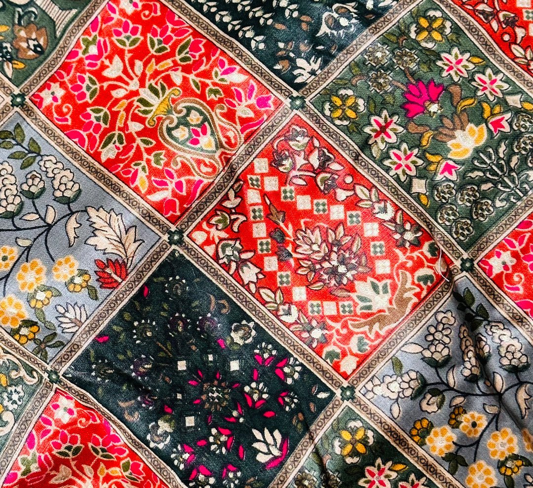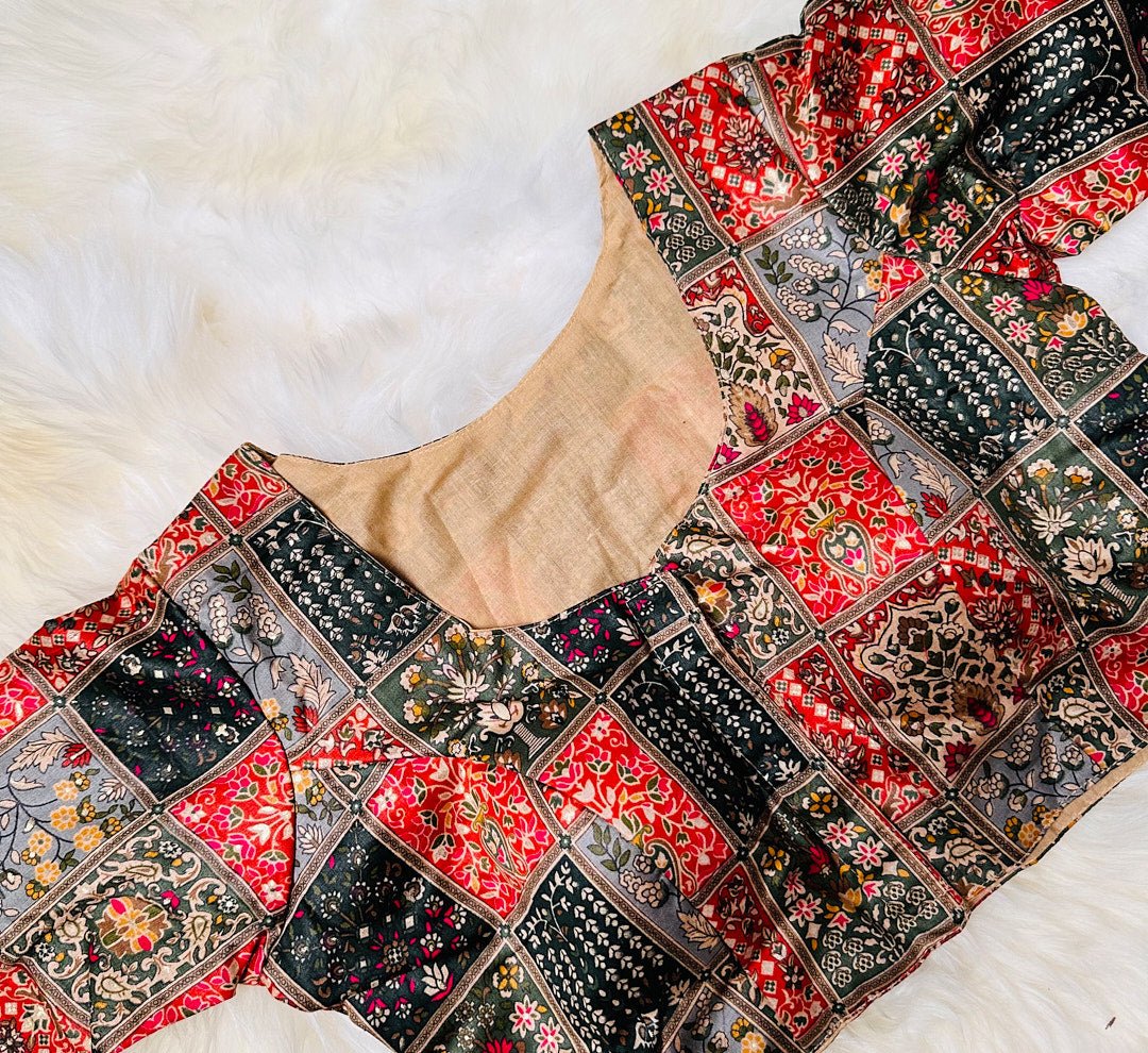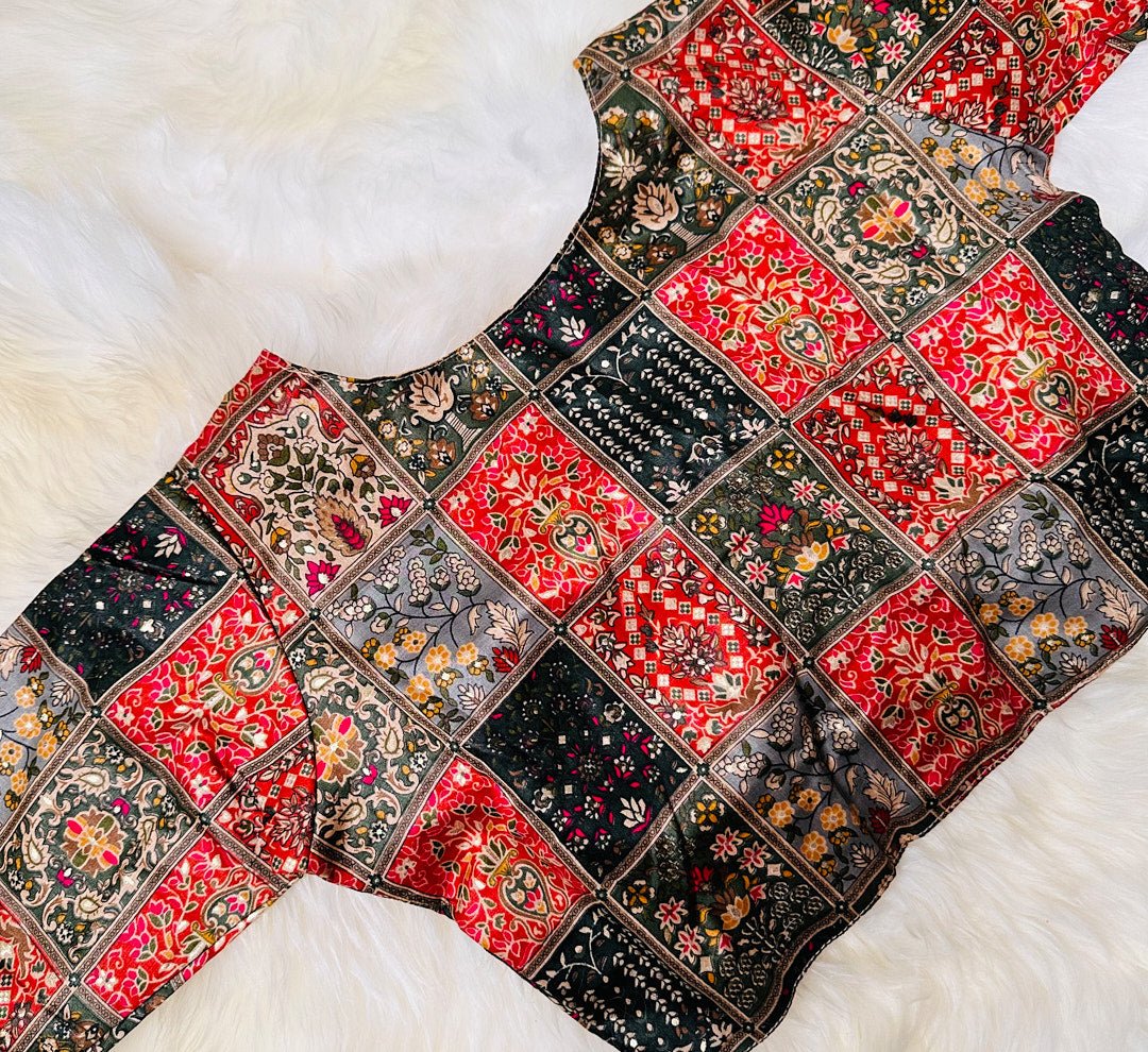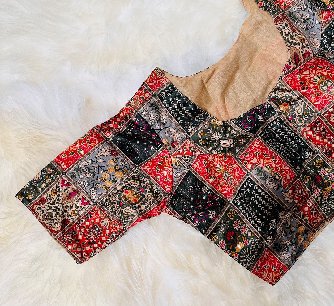 Chic and Contemporary: Embrace Modern Ethnic Style with the Grey and Red Patola High Neck Blouse - swadeshsouq.com