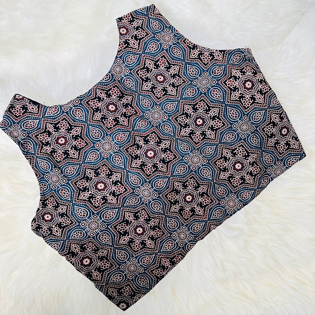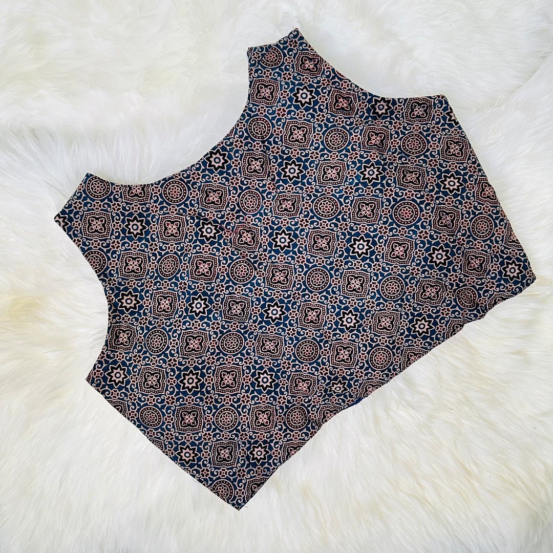 Chic Indigo: Intricately Handcrafted Ajrak Print High Neck Cotton Blouse. - swadeshsouq.com