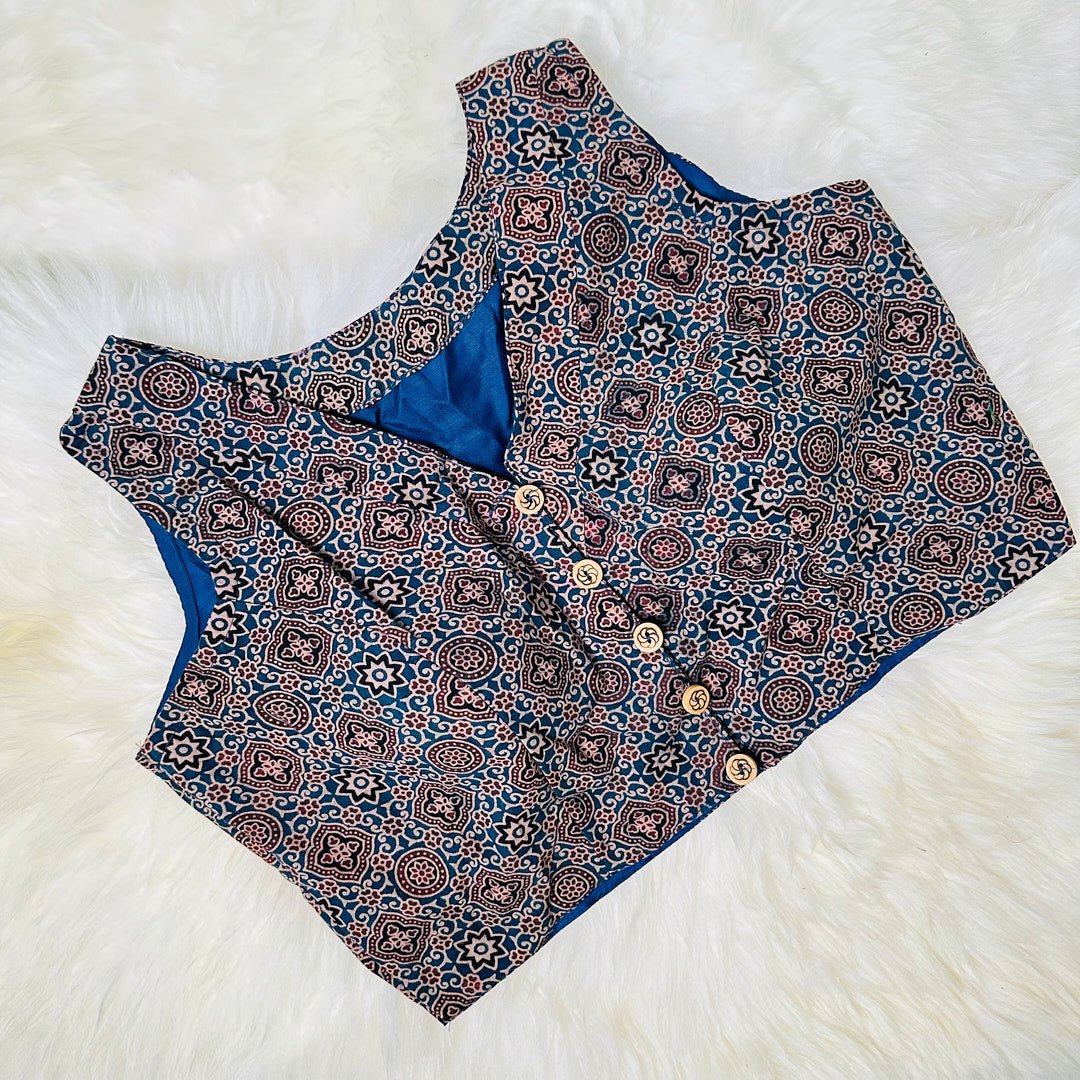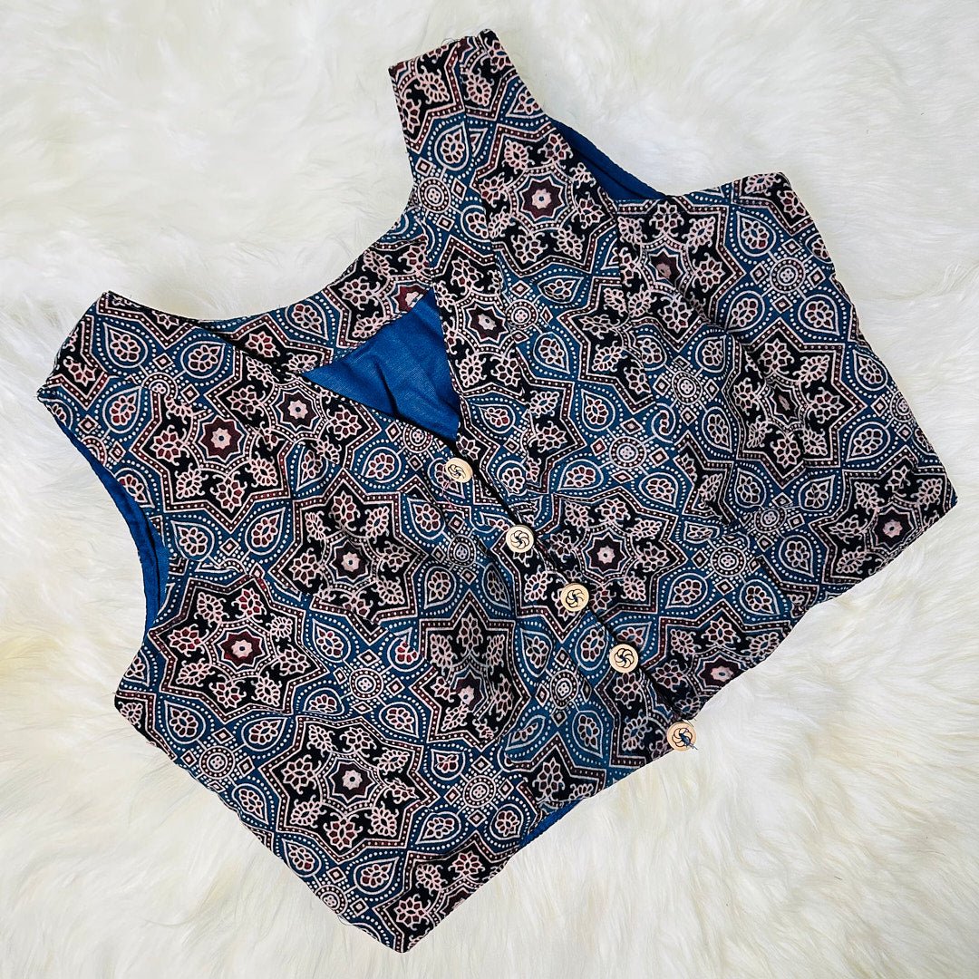 Chic Indigo: Intricately Handcrafted Ajrak Print High Neck Cotton Blouse.