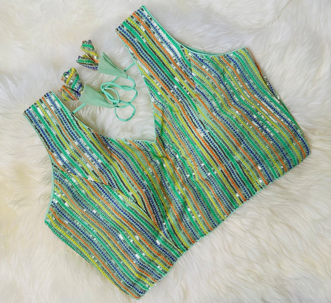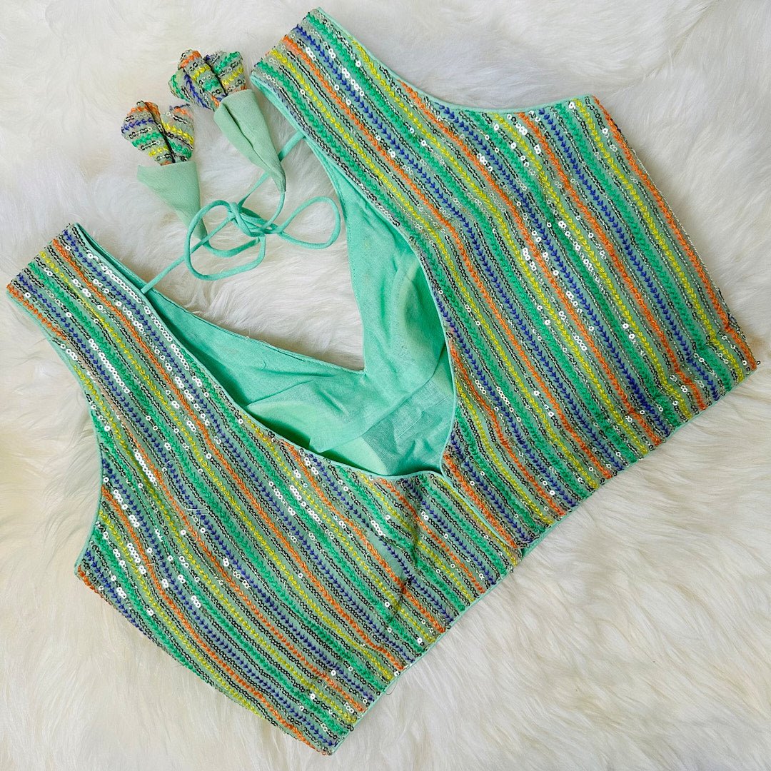 Chic Mint Green Georgette Blouse with Sparkling Sequin Accents. - swadeshsouq.com