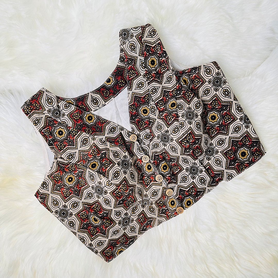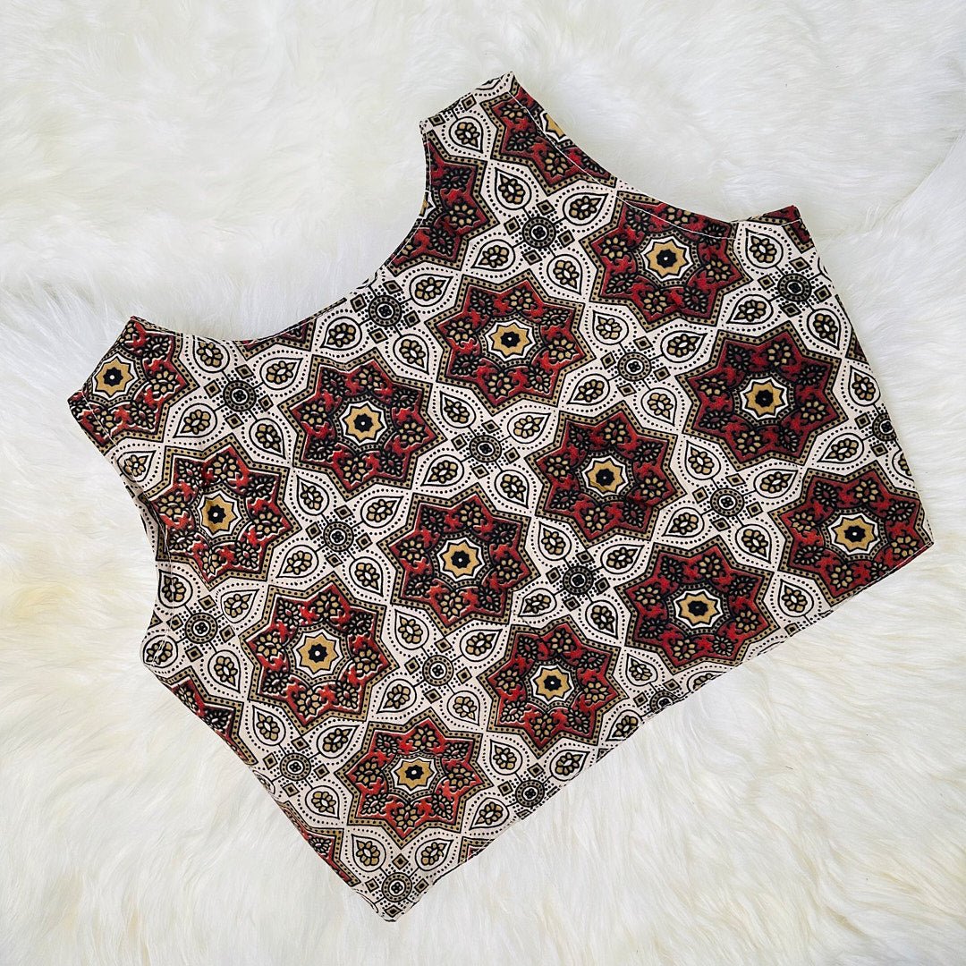 Elegant and Chic: White Cotton Blouse with Ajrak Print High Neckline. - swadeshsouq.com