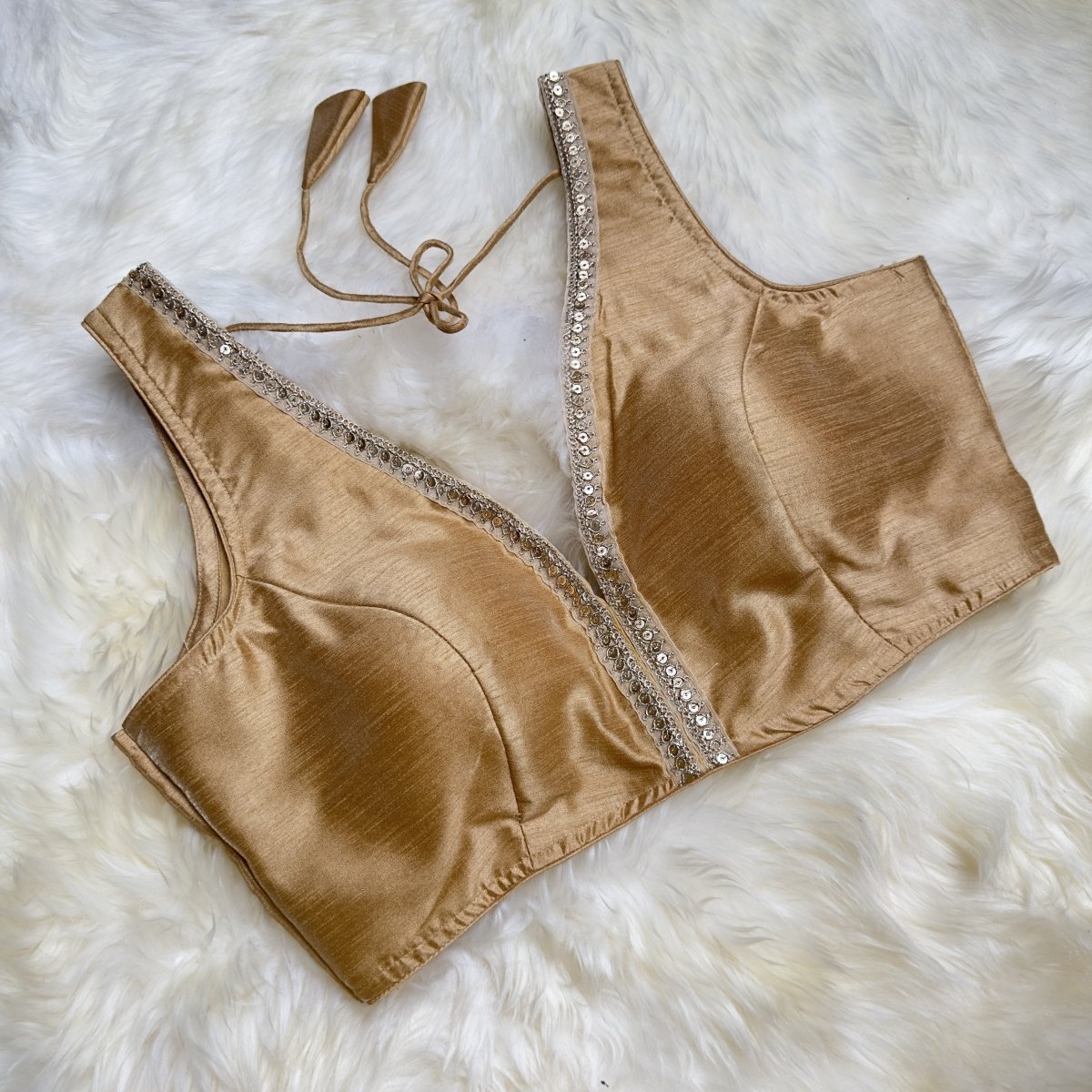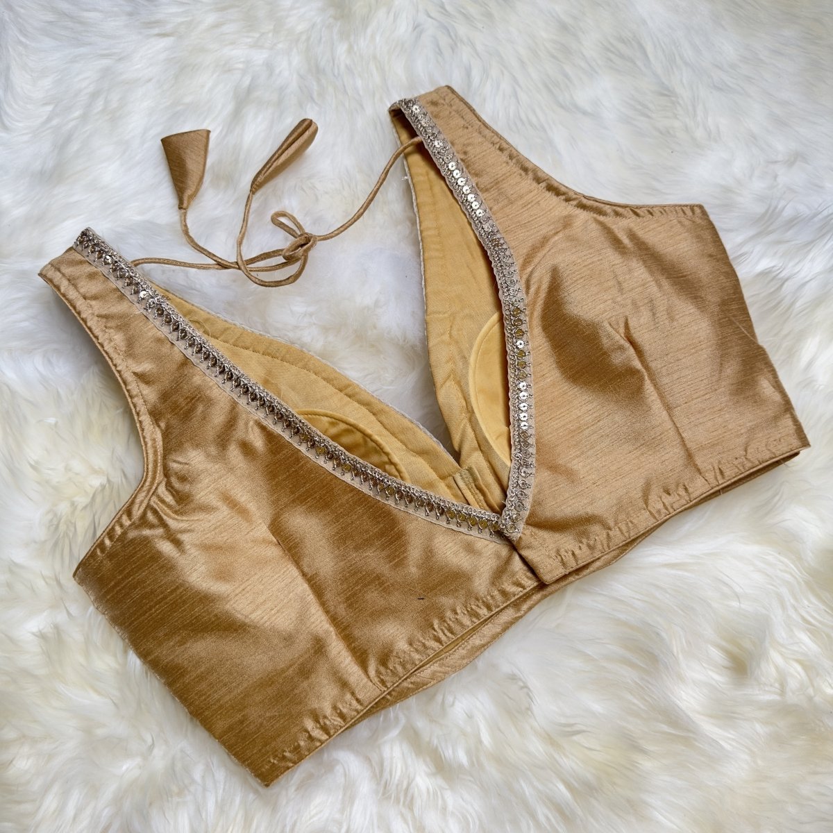 Radiate timeless glamour with our Elegant Golden Beige Silk Blouse. This luxurious blouse, crafted from high-quality silk, features a stunning sequined border that adds a subtle sparkle to the elegant golden beige color. With its sophisticated design and sleeveless tailored fit, this blouse is ideal for weddings, festive gatherings, or upscale parties. It pairs perfectly with sarees and lehengas, making you shine effortlessly on any occasion.