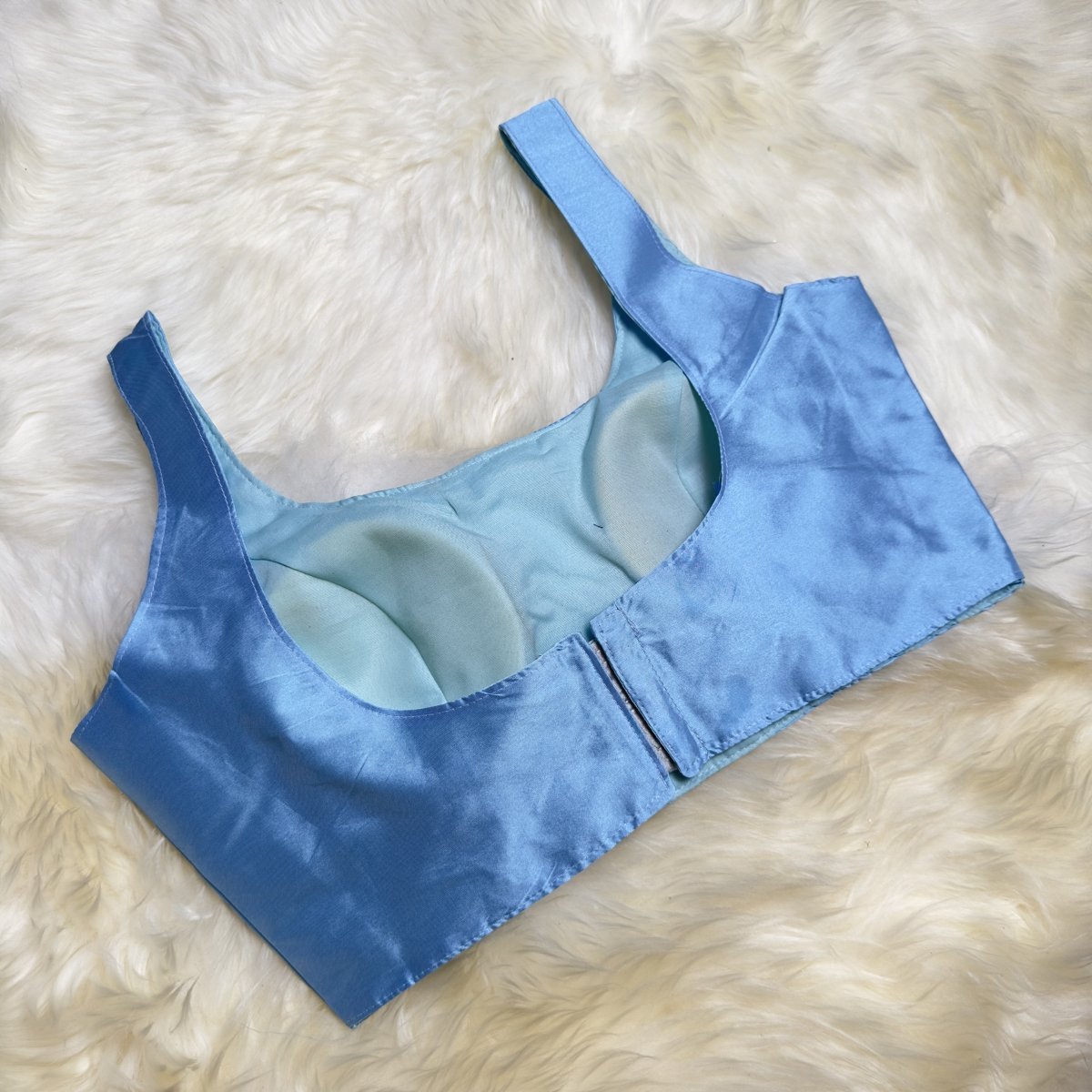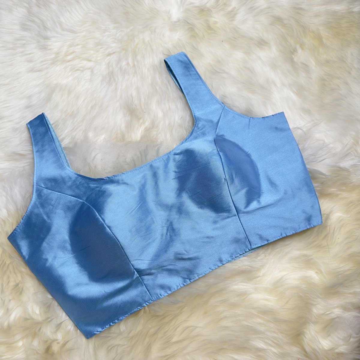This elegant sky blue blouse crafted from luxurious silk adds a soft and vibrant touch to your ethnic wardrobe. Featuring broad straps and a classic sleeveless design, it brings a blend of sophistication and comfort. Pair it with your favorite saree or lehenga for an effortlessly chic look. The blouse comes with an adjustable size option from 32 to 38, making it a perfect fit for different body types. Sleeves are included separately to suit your styling preference.