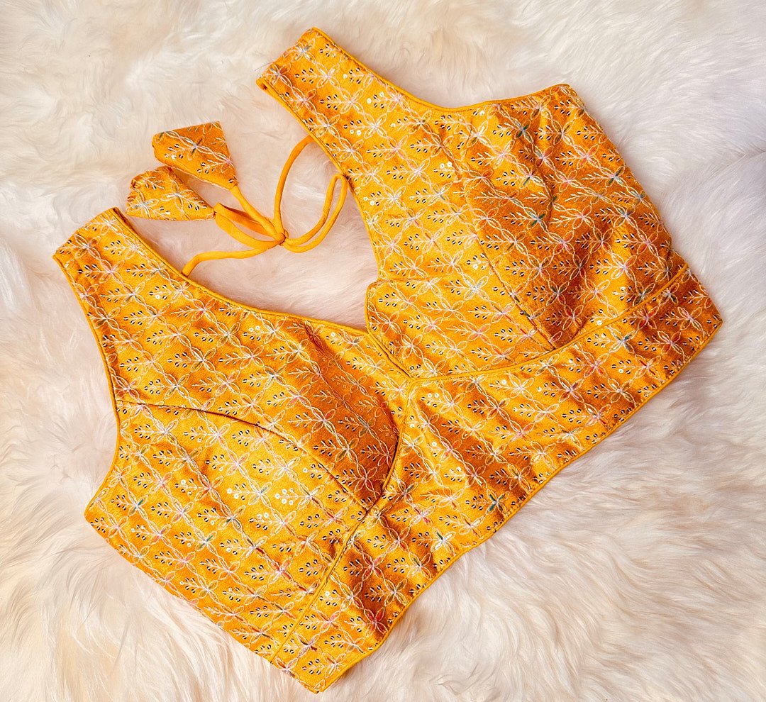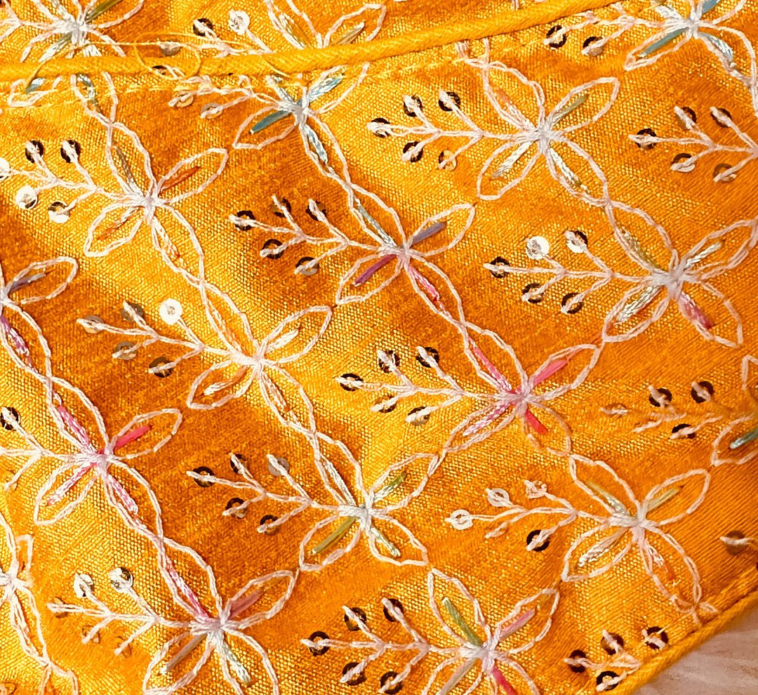 This vibrant yellow Sabyasachi raw silk blouse is a stunning piece that adds a pop of color to your outfit. The sparkling sequin work adds a touch of glamour to its already beautiful design, making it a perfect choice for any occasion where you want to exude effortless charm and grace. The exceptional quality of the blouse ensures a luxurious feel and a flattering fit, making it a must-have addition to your wardrobe. So, elevate your style with this vibrant yellow Sabyasachi raw silk blouse, and make a bold fashion statement wherever you go.