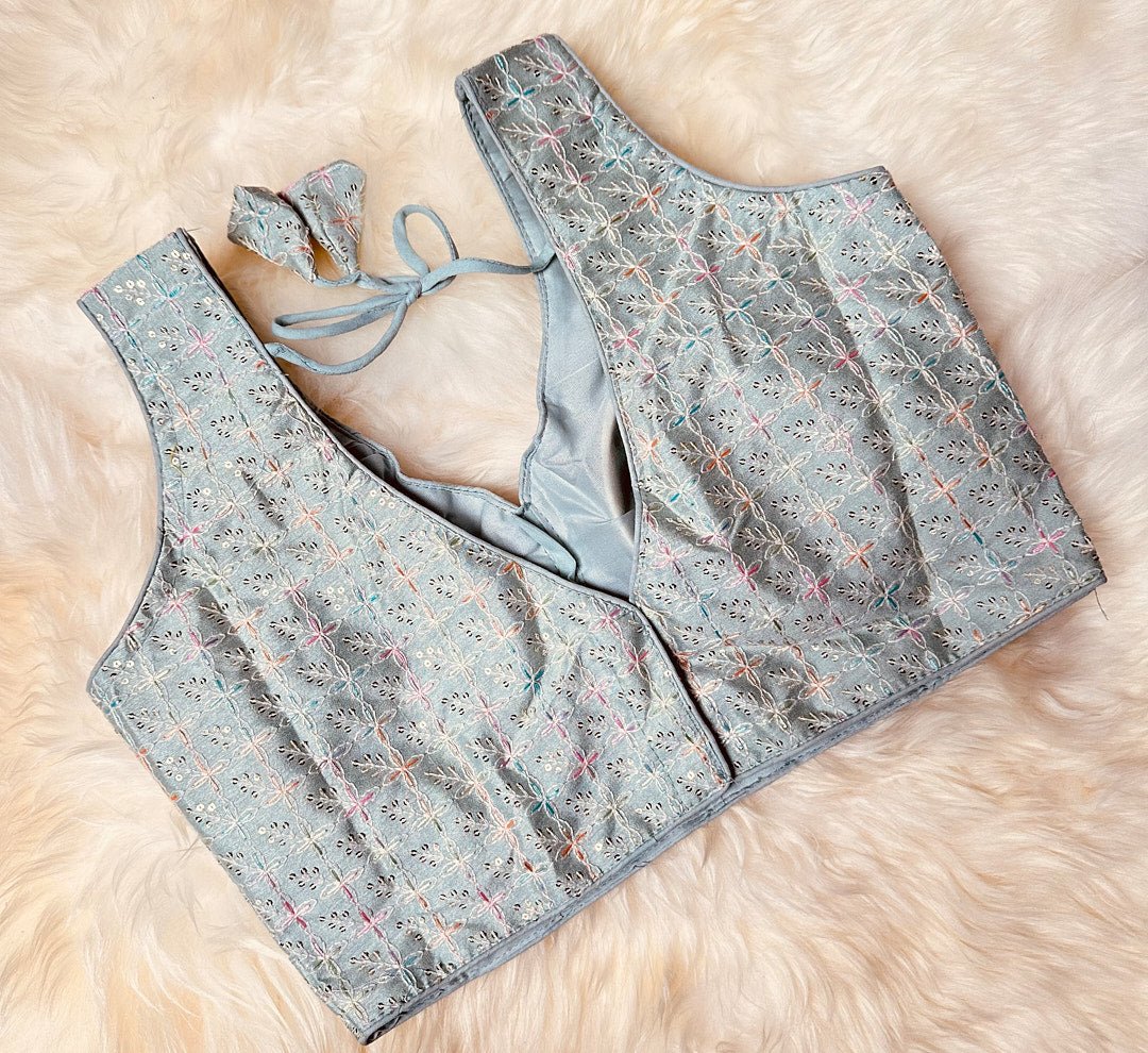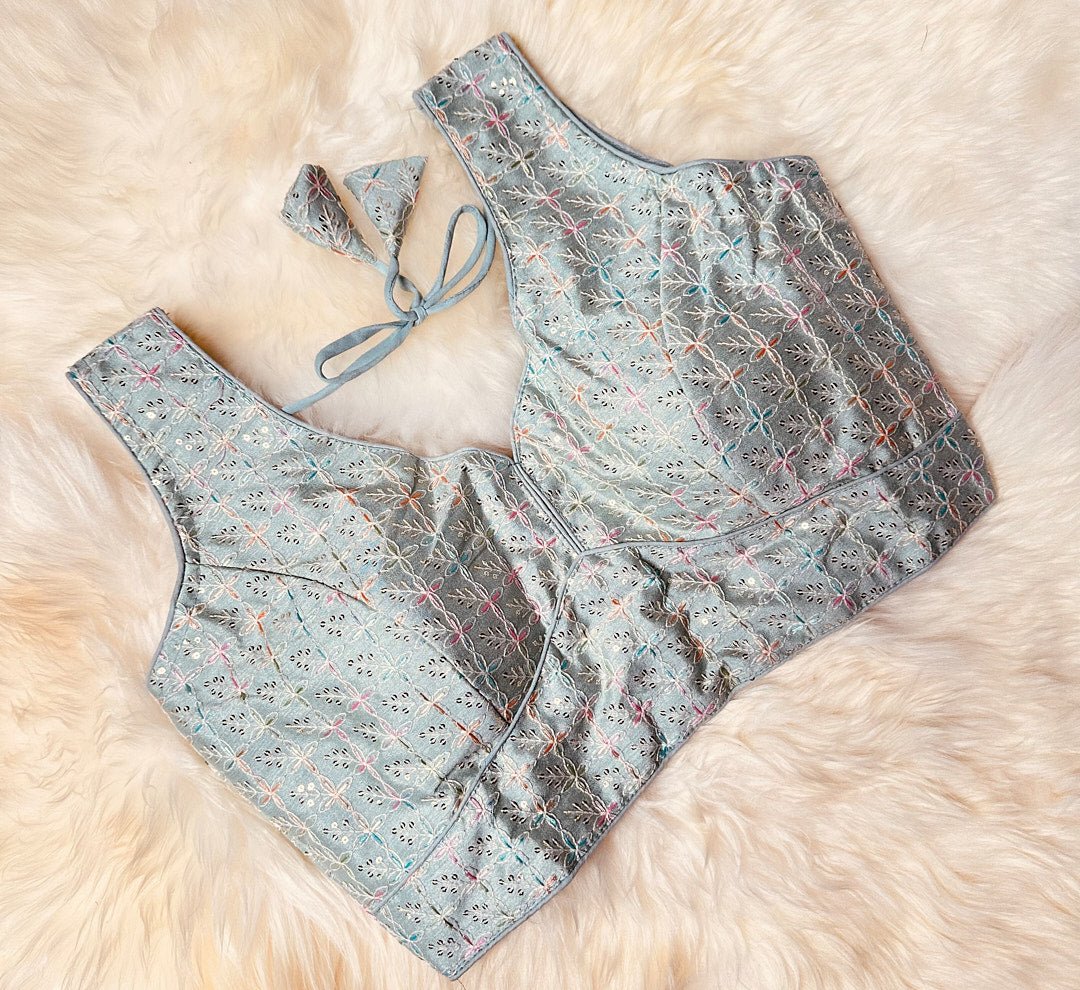 Embrace the Sophisticated Glamour with the Grey Sabyasachi Raw Silk Blouse.