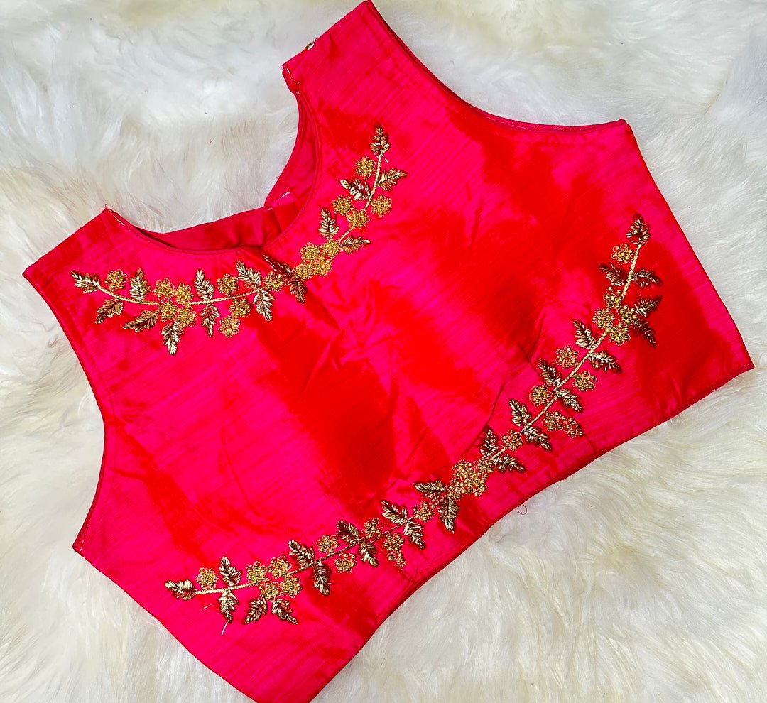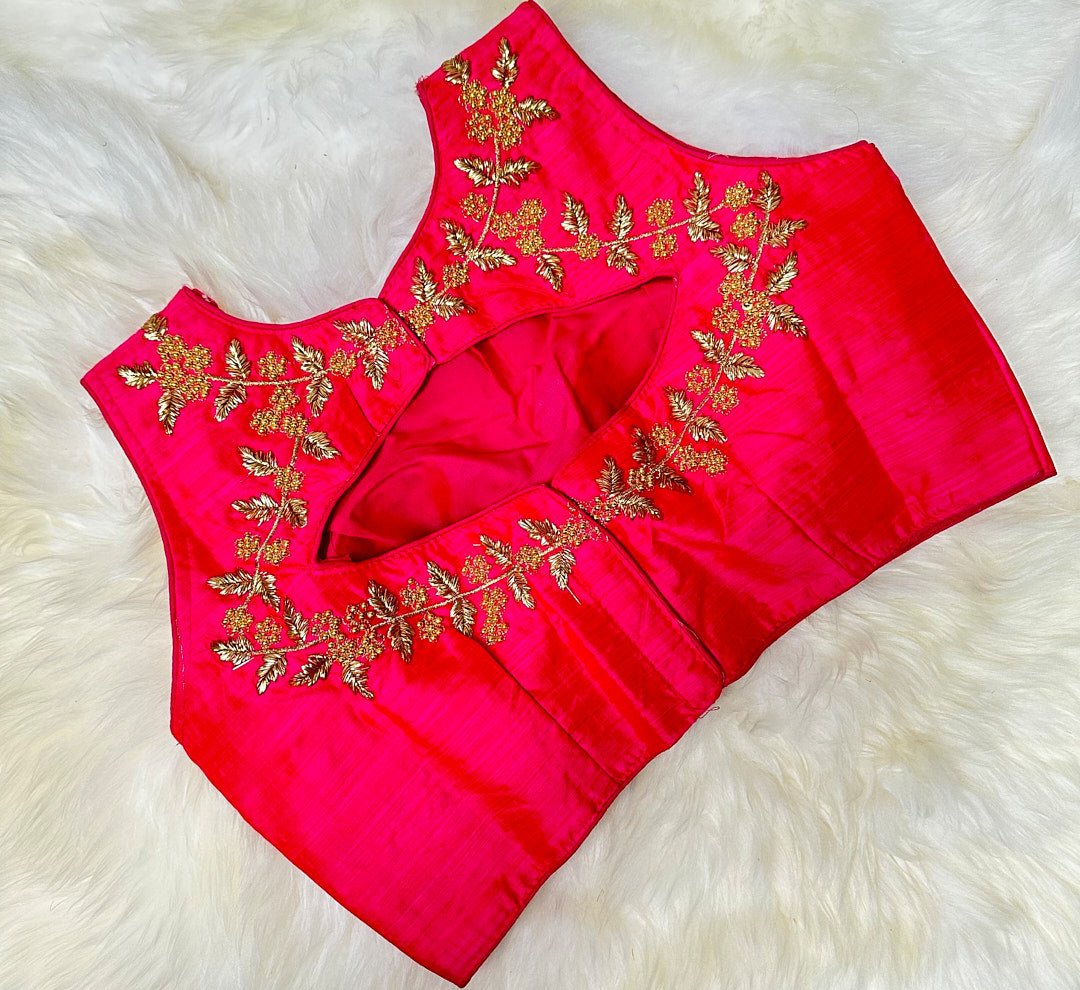 Adorn Yourself with Graceful & Glamorous Pink Raw Silk Blouse, Embellished with Golden Zardosi Work from swadeshsouq.com.