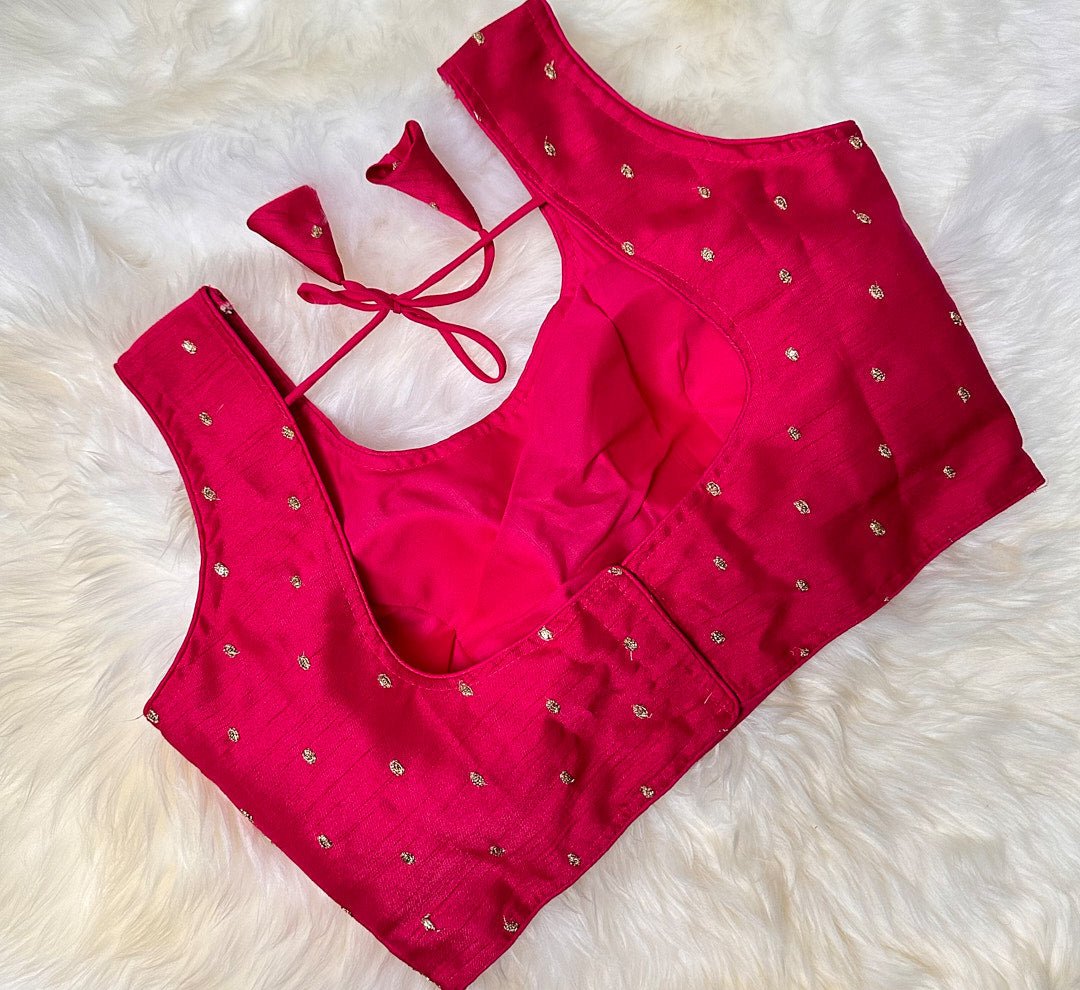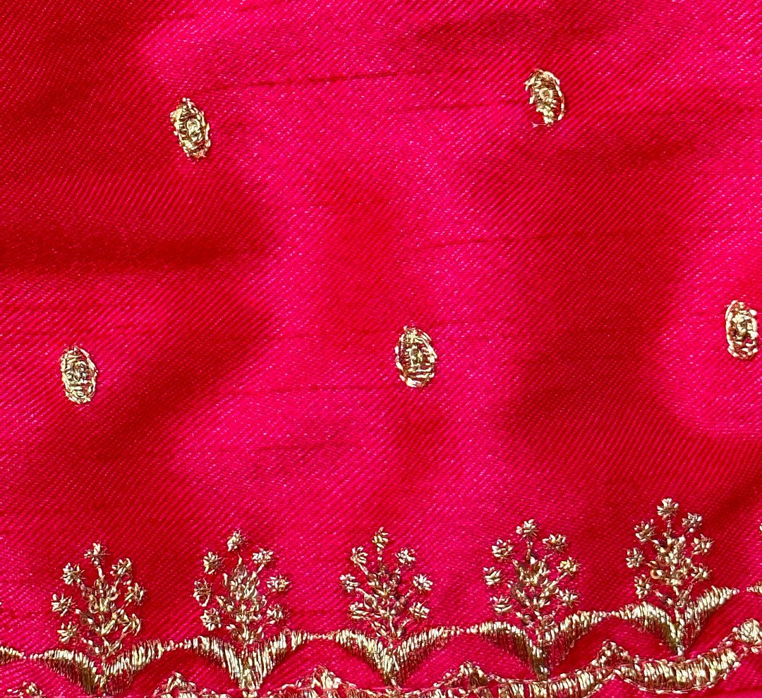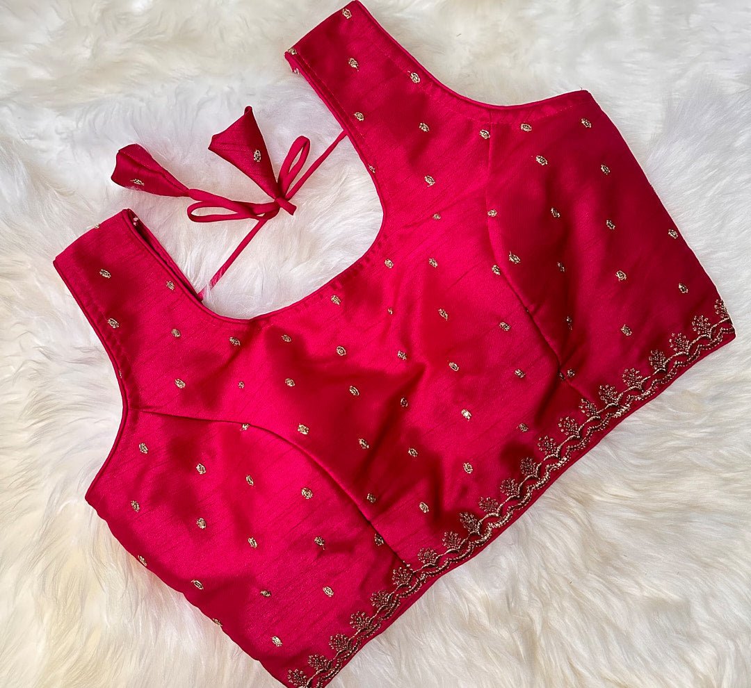 This pink raw silk Jaipuri blouse is a graceful and lovely addition to any ethnic attire. The intricate golden buttis add a touch of glamour to the already stunning design. The beautiful contrast between the pink silk fabric and golden embellishments creates a harmonious and captivating ensemble that is sure to turn heads. The Jaipuri design adds a touch of traditional charm, making it a perfect choice for any occasion where you want to embrace your cultural roots and feel confident and beautiful. With its flattering fit and timeless appeal, this blouse is a must-have for anyone looking to add a touch of elegance to their wardrobe.