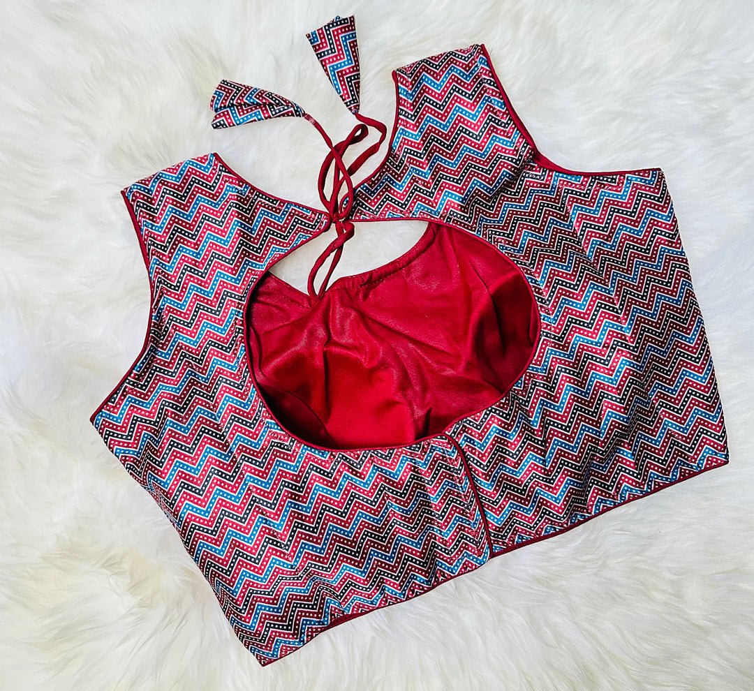 Make a Statement with Our Maroon and Blue Gaaji Ajrak Print Satin Blouse with Wavy Pattern - swadeshsouq.com