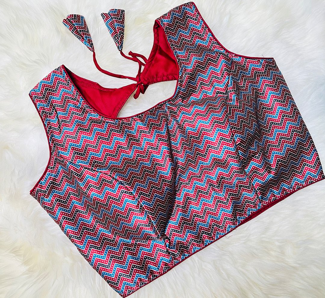 Make a Statement with Our Maroon and Blue Gaaji Ajrak Print Satin Blouse with Wavy Pattern