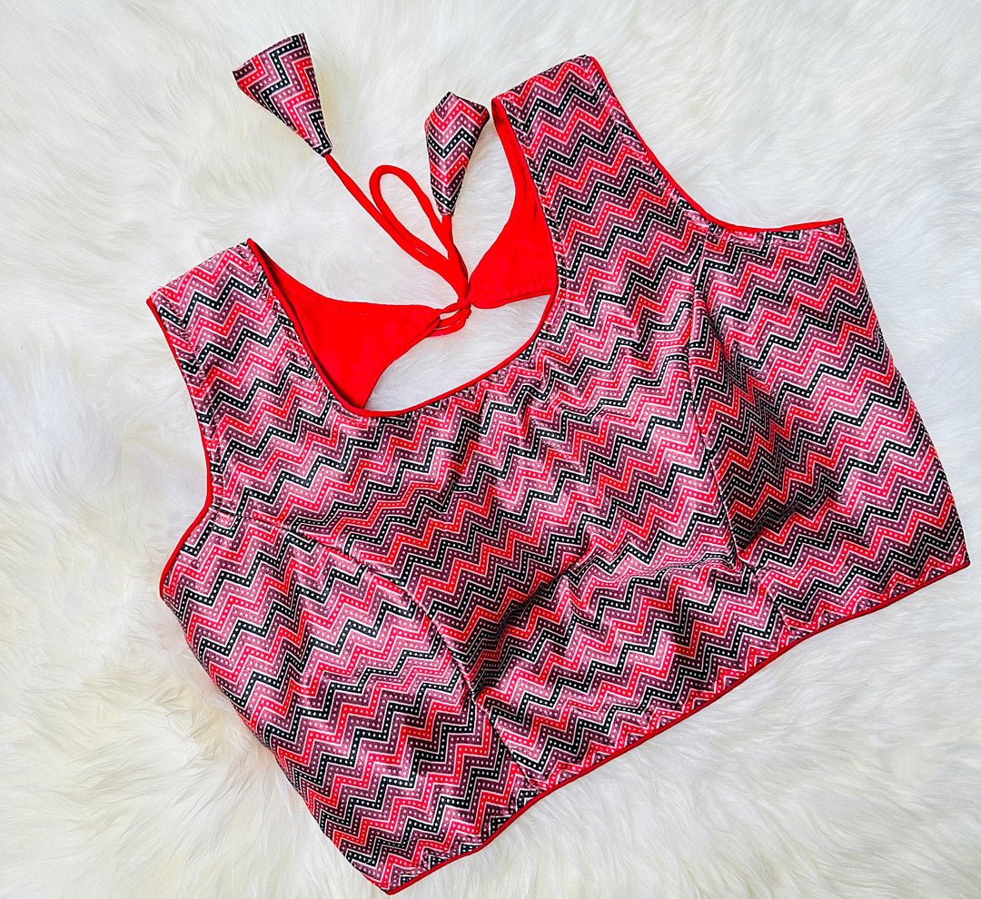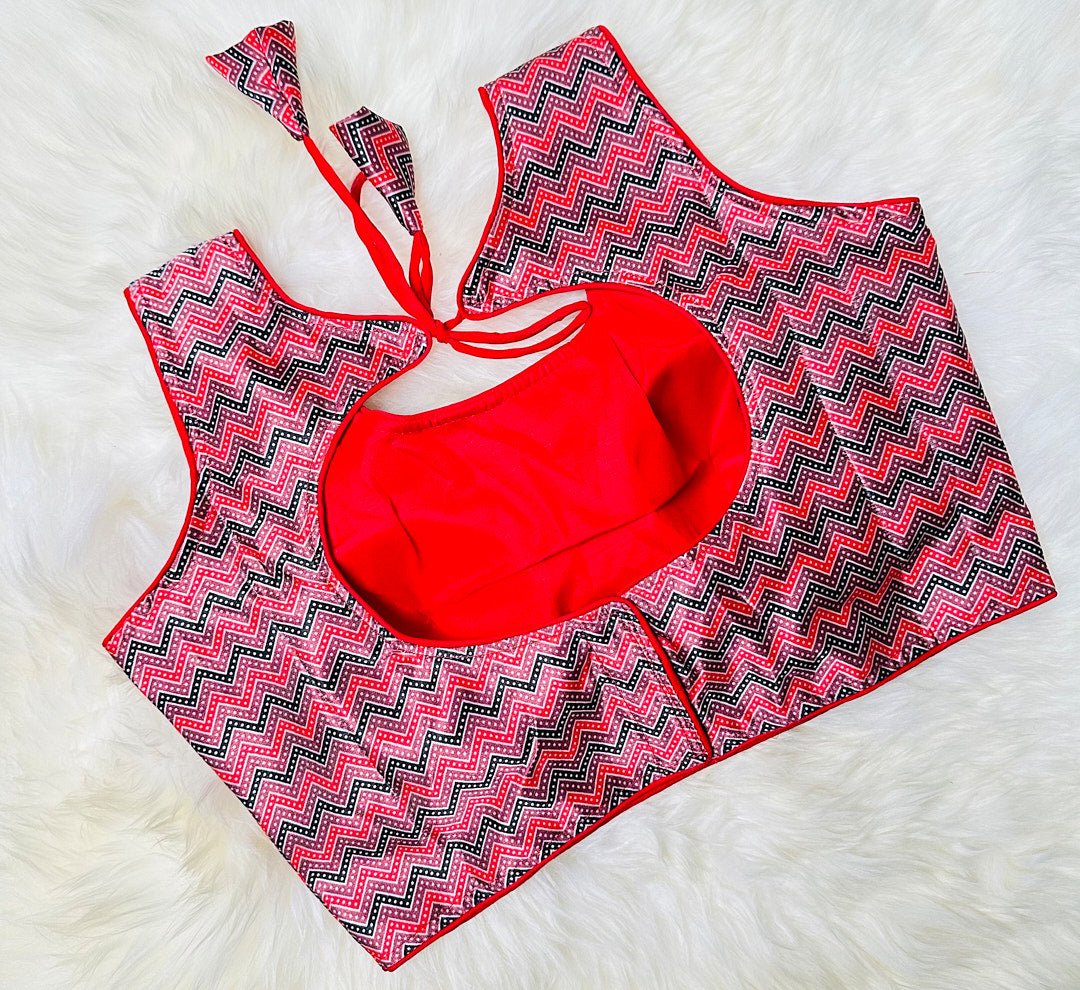 Our red Gaaji Ajrak print satin blouse is a perfect blend of traditional and contemporary design. The captivating Ajrak print in shades of red adds a bold and striking touch to this exquisite piece. Made from premium quality satin material, this blouse boasts of unmatched comfort and durability. It is tailored to perfection, ensuring a comfortable fit for every body type. Get ready to turn heads and make a striking impression with our red Gaaji Ajrak print satin blouse.