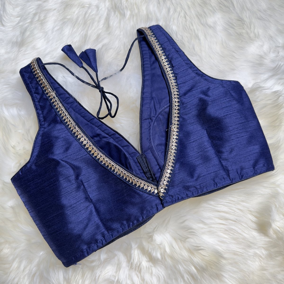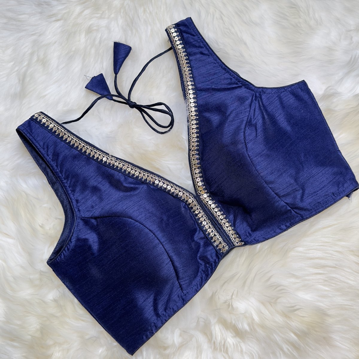Elevate your festive wardrobe with our Midnight Blue Silk Blouse with Sequined Border. This stunning blouse is crafted from luxurious silk in a deep midnight blue hue, complemented by a shimmering sequined border that exudes sophistication and glamour. Its sleek sleeveless design with a tailored fit makes it a perfect choice for weddings, parties, and festive occasions. Pair it with a saree or lehenga for an effortlessly regal and radiant look that leaves an unforgettable impression.